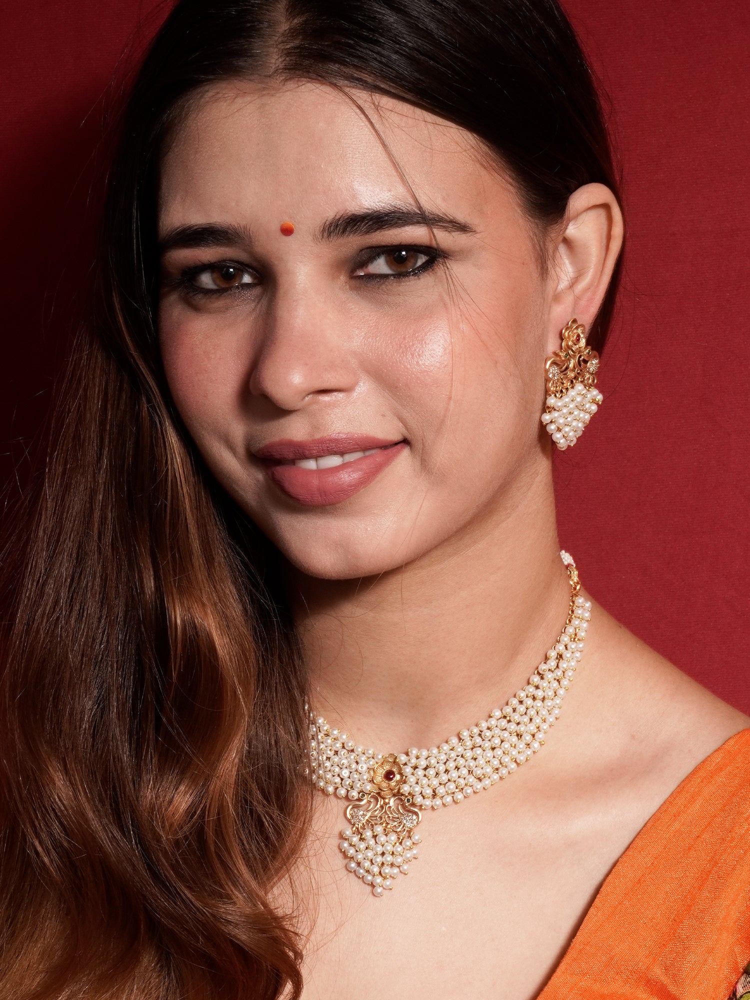 This 24K gold-plated choker set with white pearls and beads is perfect for enhancing both traditional and modern looks. For a classic touch, pair it with a silk saree or a heavily embellished lehenga, allowing the choker to sit elegantly against the neckline. If you're going for a contemporary vibe, wear it with a fitted off-shoulder dress or a stylish jumpsuit to highlight the choker's charm. Style your hair in a sleek bun or soft waves to draw attention to your neckline, and opt for a natural makeup look with a hint of highlighter for a radiant glow.