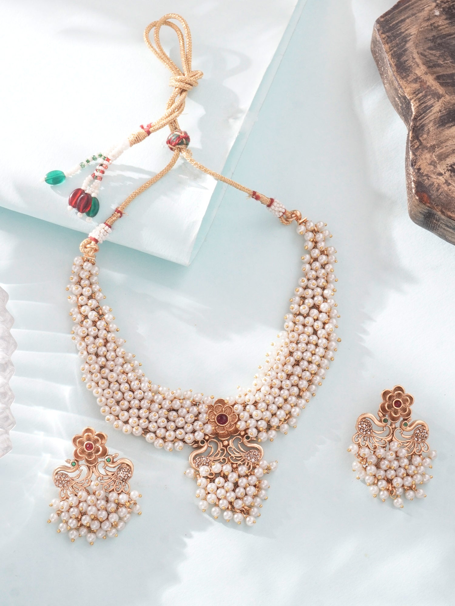 Elevate your accessory game with Niscka's exquisite 24K gold-plated choker set, designed to capture attention and enhance your elegance. This stunning choker features a captivating arrangement of radiant white pearls and intricately placed beads, creating a beautiful contrast that radiates sophistication. The snug fit of the choker accentuates your neckline, making it a perfect addition to both traditional attire and contemporary outfits. Ideal for weddings, festive celebrations, or special occasions, this jewelry set is a timeless statement piece that effortlessly combines classic beauty with modern allure. Add a touch of luxury to your collection with this enchanting choker set.