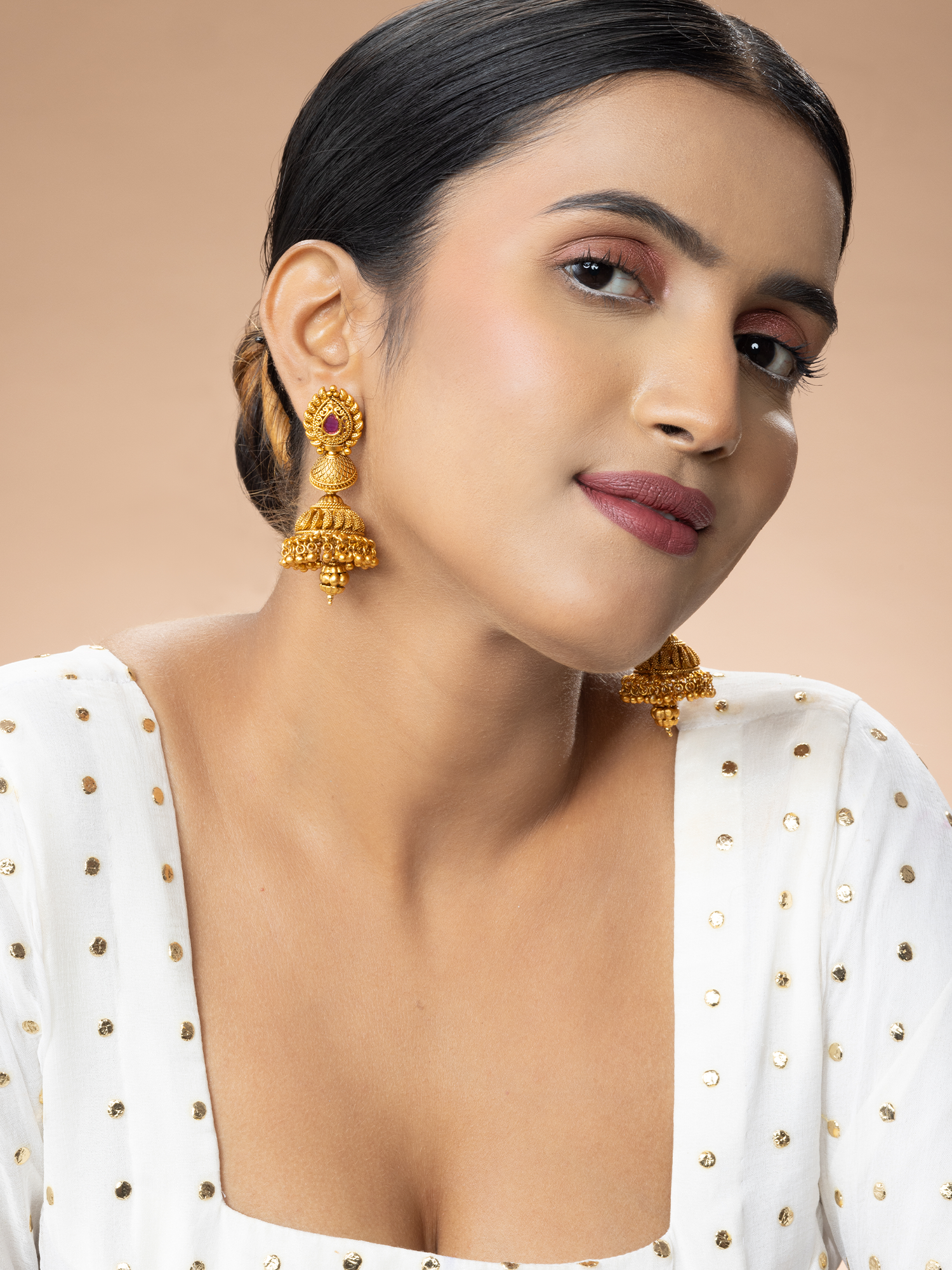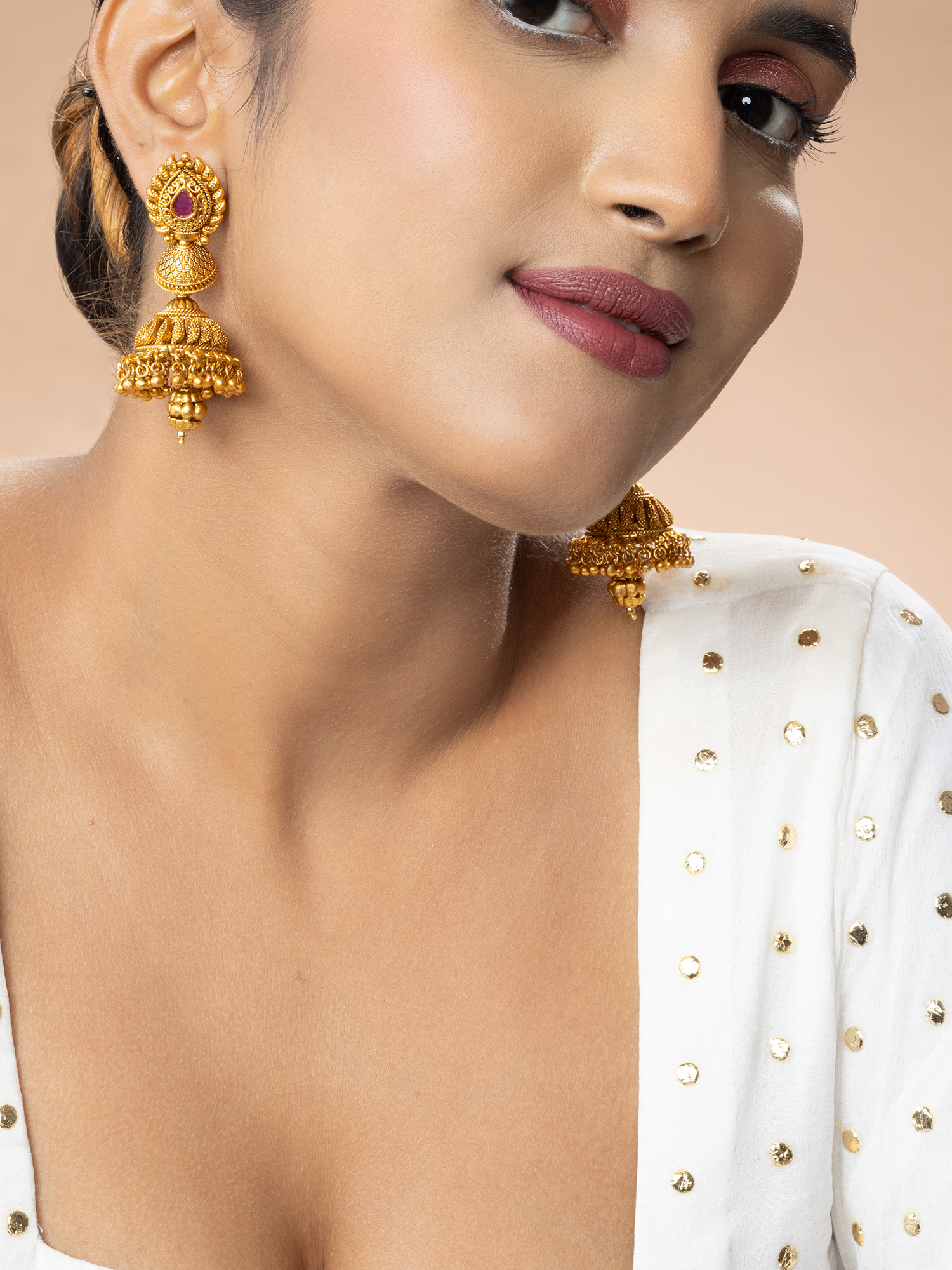 Indulge in sophistication with our 24K Gold Plated Double Layered Jhumka Set. These elegant earrings boast a beautiful leaf design with a ruby embedded in the middle, creating a captivating focal point. Adorned with gold-plated bells, these traditional jhumkas showcase the latest in design. Handmade by skilled local artisans, this set is a perfect accessory for wedding functions or parties, offering a unique blend of cultural richness and contemporary style, adding a touch of traditional charm to your ensemble.