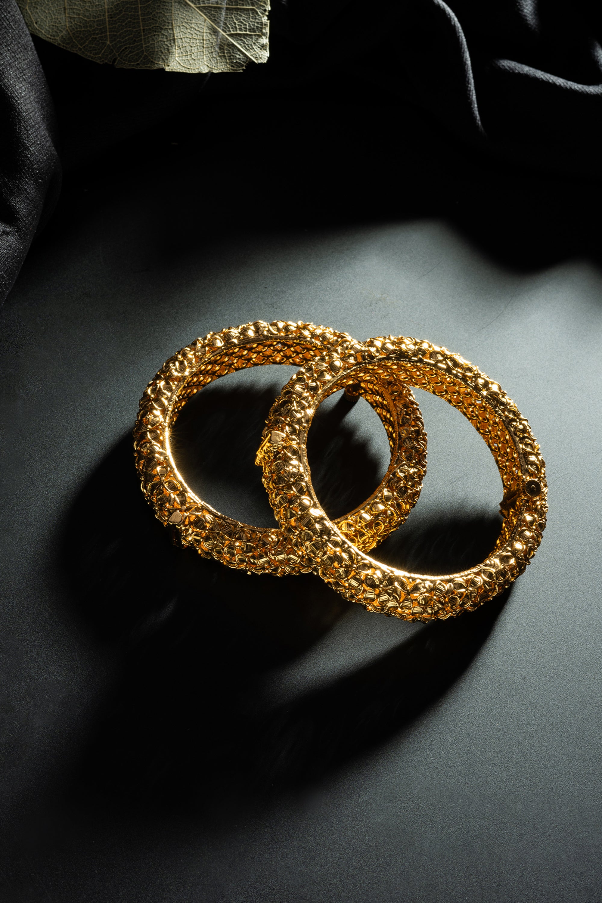Embrace the essence of tradition and allure with our 24K Gold Plated Floral Kada Set of 2, a charismatic fusion of charm and craftsmanship. Perfect for both party and festival wear, these enchanting bangles are meticulously handcrafted by local artisans, showcasing stunning appeal and graceful elegance. Adorn your wrists with this appealing set, a testament to the skill and dedication of our talented karigars, to make every moment memorable.
