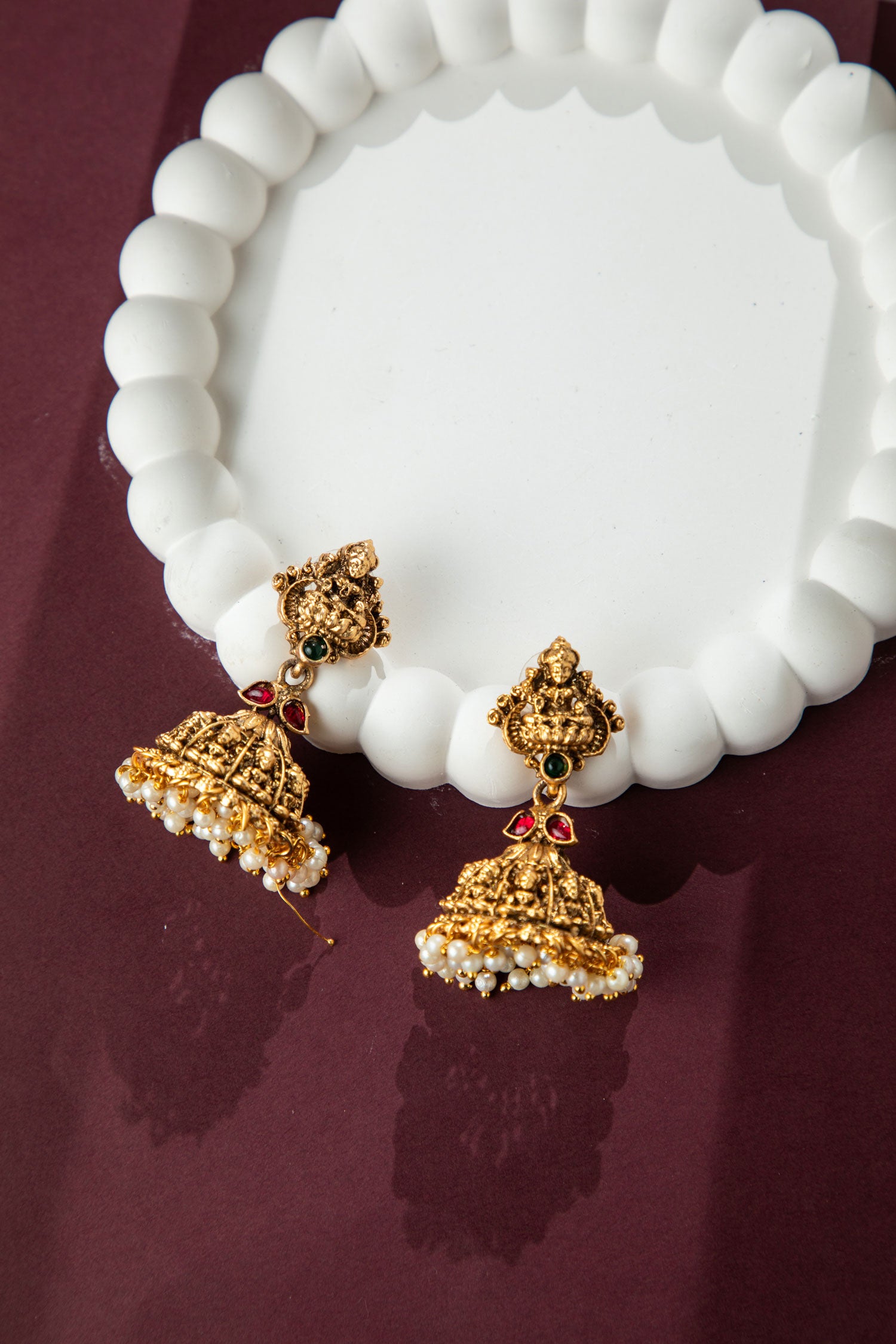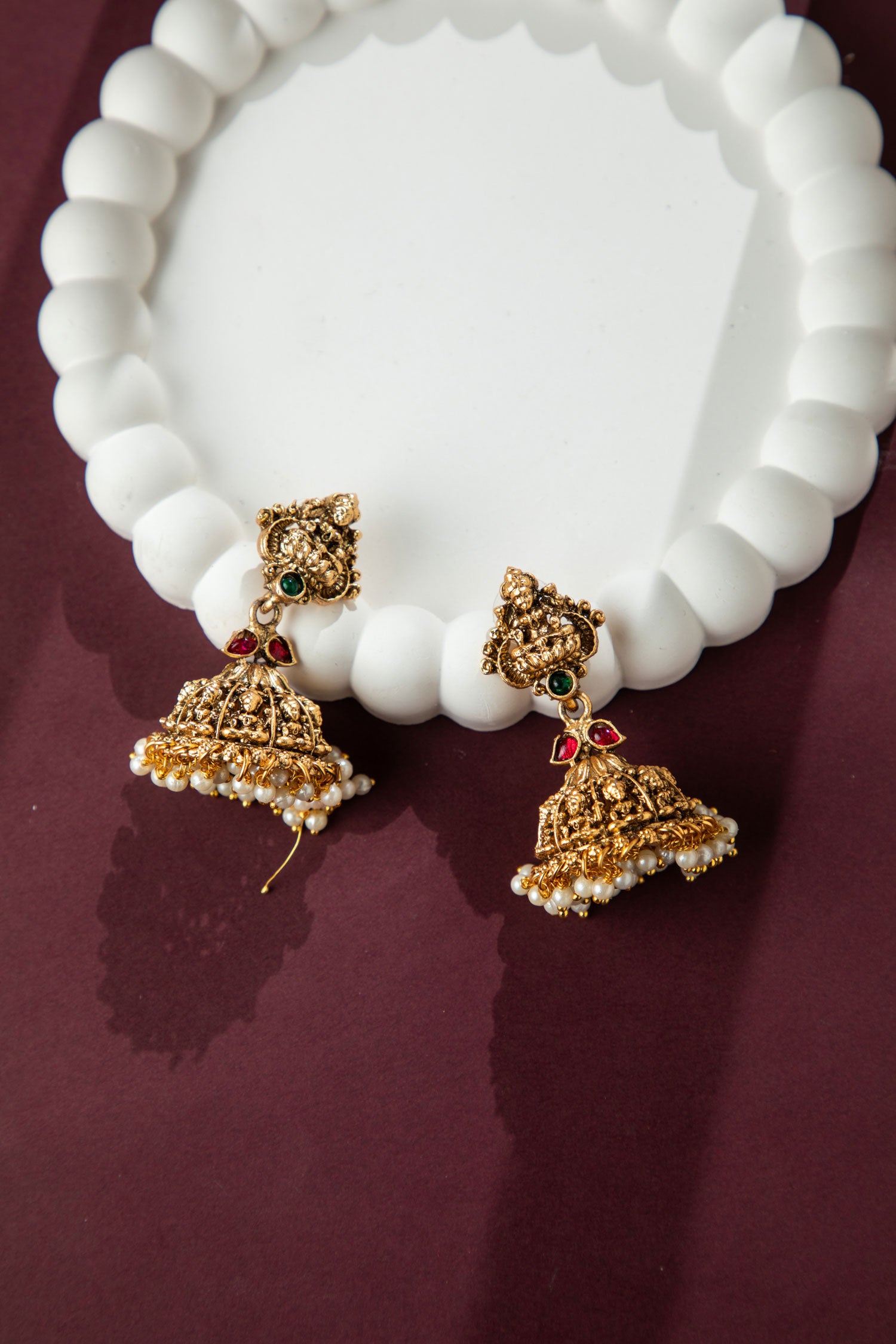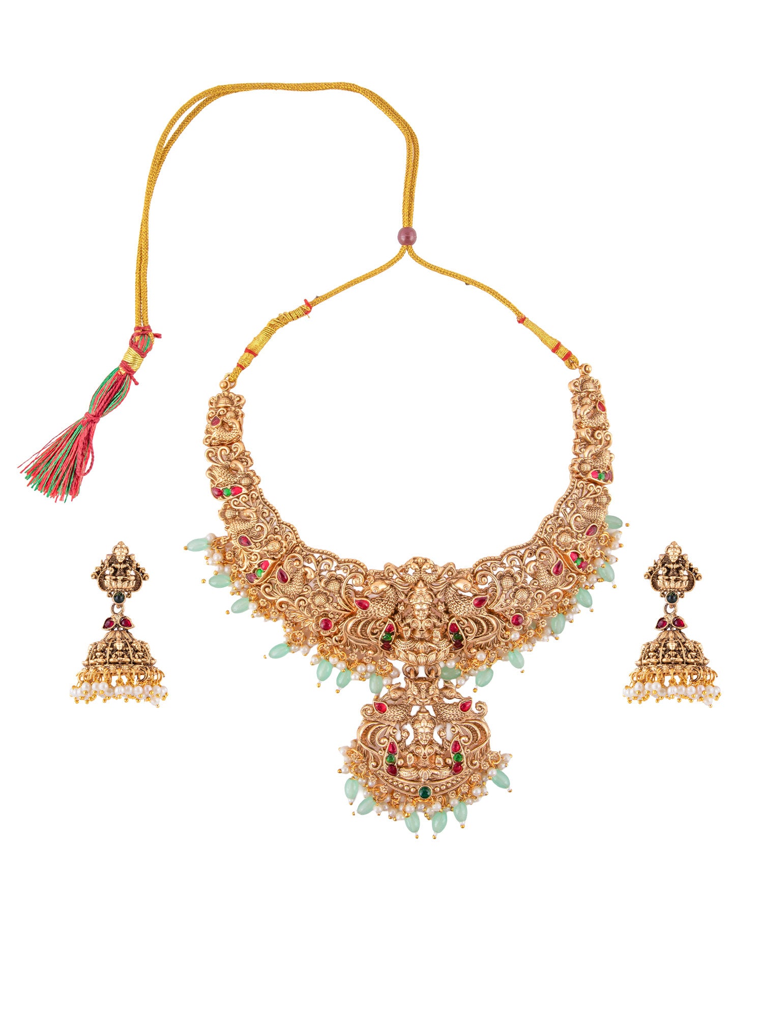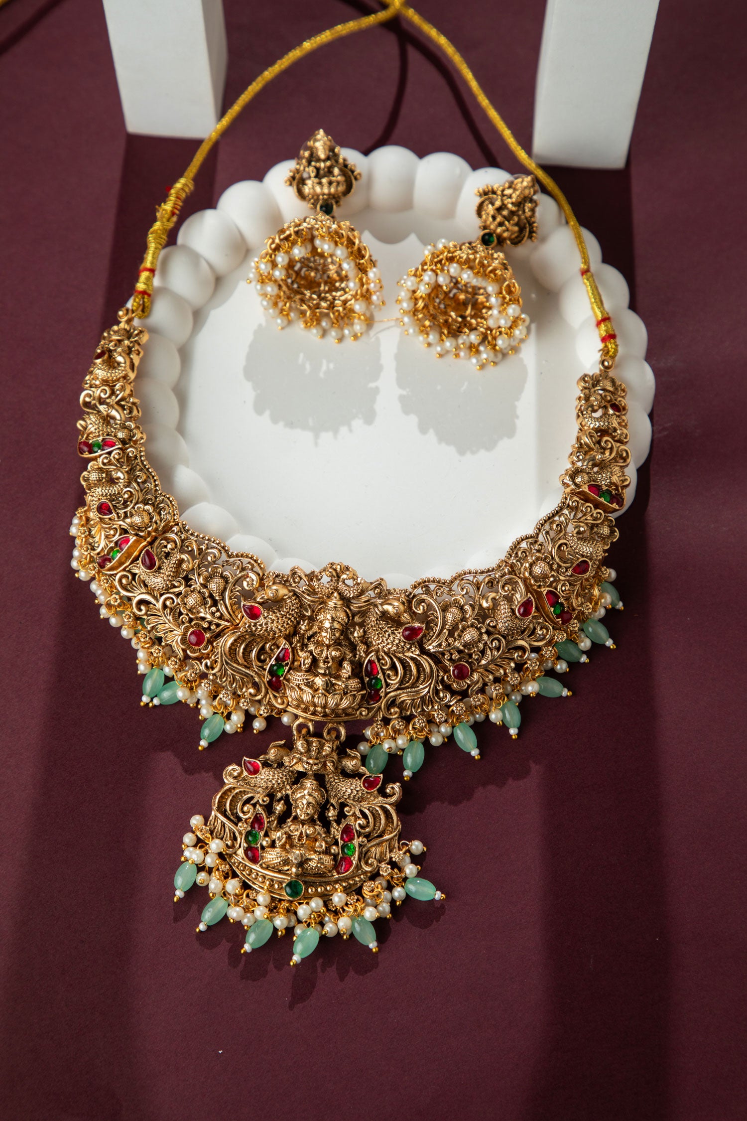 24K Gold Plated Lakshmi Temple Peacock Antique Choker Necklace with Jhumkas
