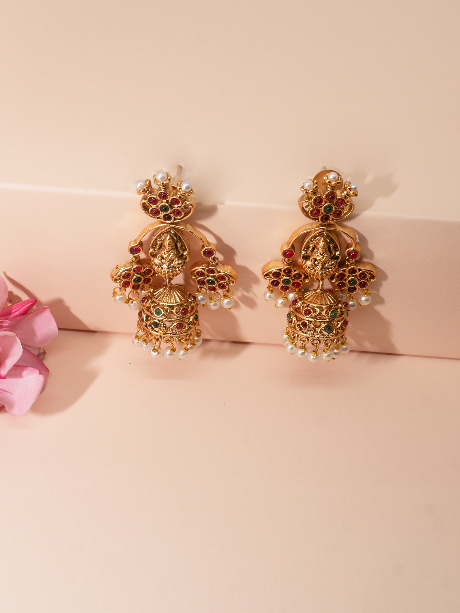 Adorn your ears with the timeless elegance of Niscka's 24K Gold-Plated Laxmi Jhumka Earrings. These exquisite earrings feature a stunning gold-plated design, meticulously crafted to showcase the revered Laxmi motif, symbolizing prosperity and grace. The jhumka style adds a traditional flair, while lustrous pearls dangle gracefully from the base, enhancing the earrings with a touch of classic sophistication. Perfect for special occasions or festive celebrations, these earrings combine opulent gold plating with intricate detailing to make a truly memorable statement."