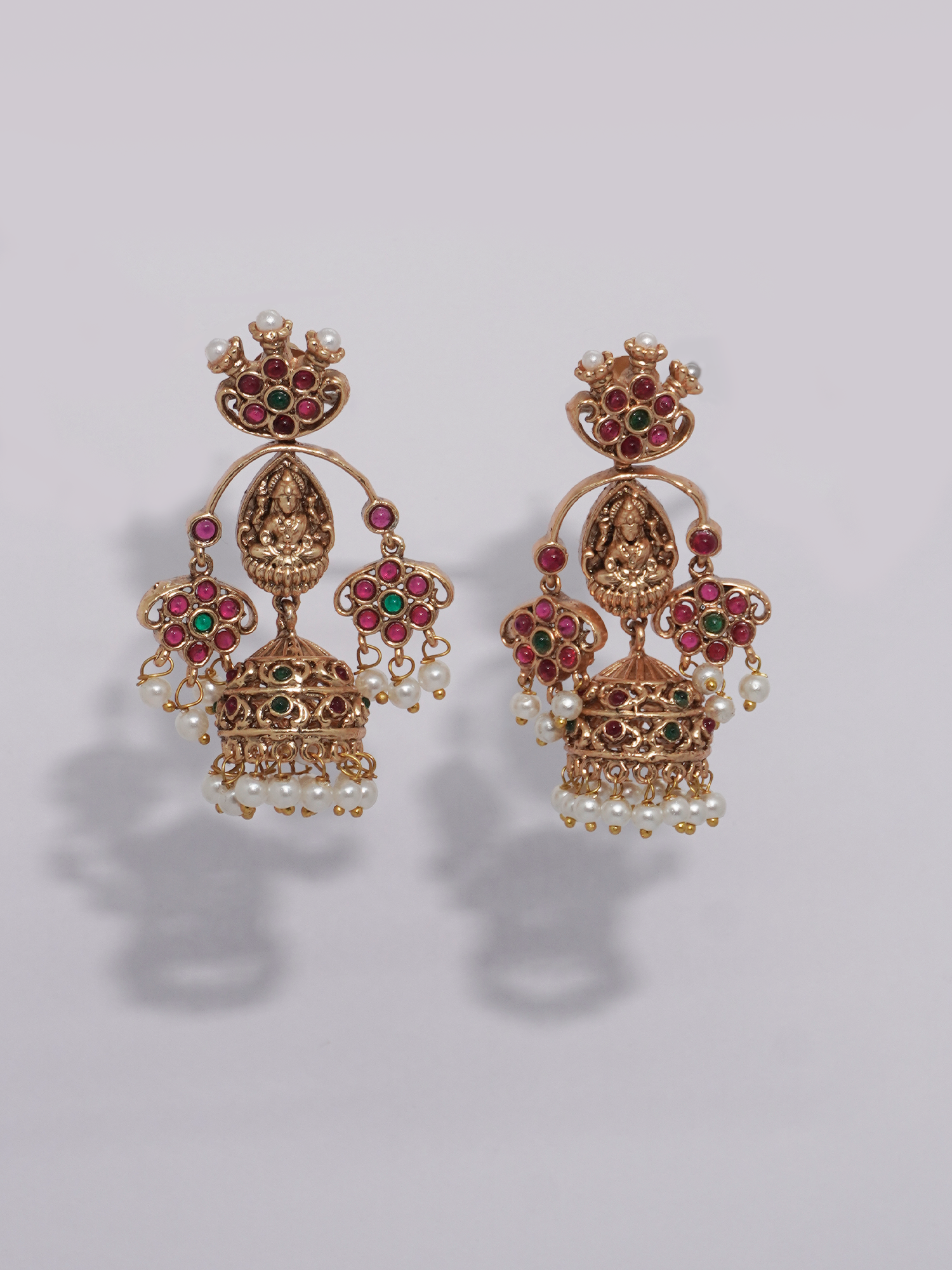 To make the most of the Niscka 24K Gold-Plated Laxmi Jhumka Earrings, pair them with a traditional saree or lehenga in rich, contrasting colors to let the gold and pearls stand out. and style your hair in a classic updo or soft waves for a graceful finish. These earrings will add a touch of timeless elegance to any festive or special occasion ensemble.