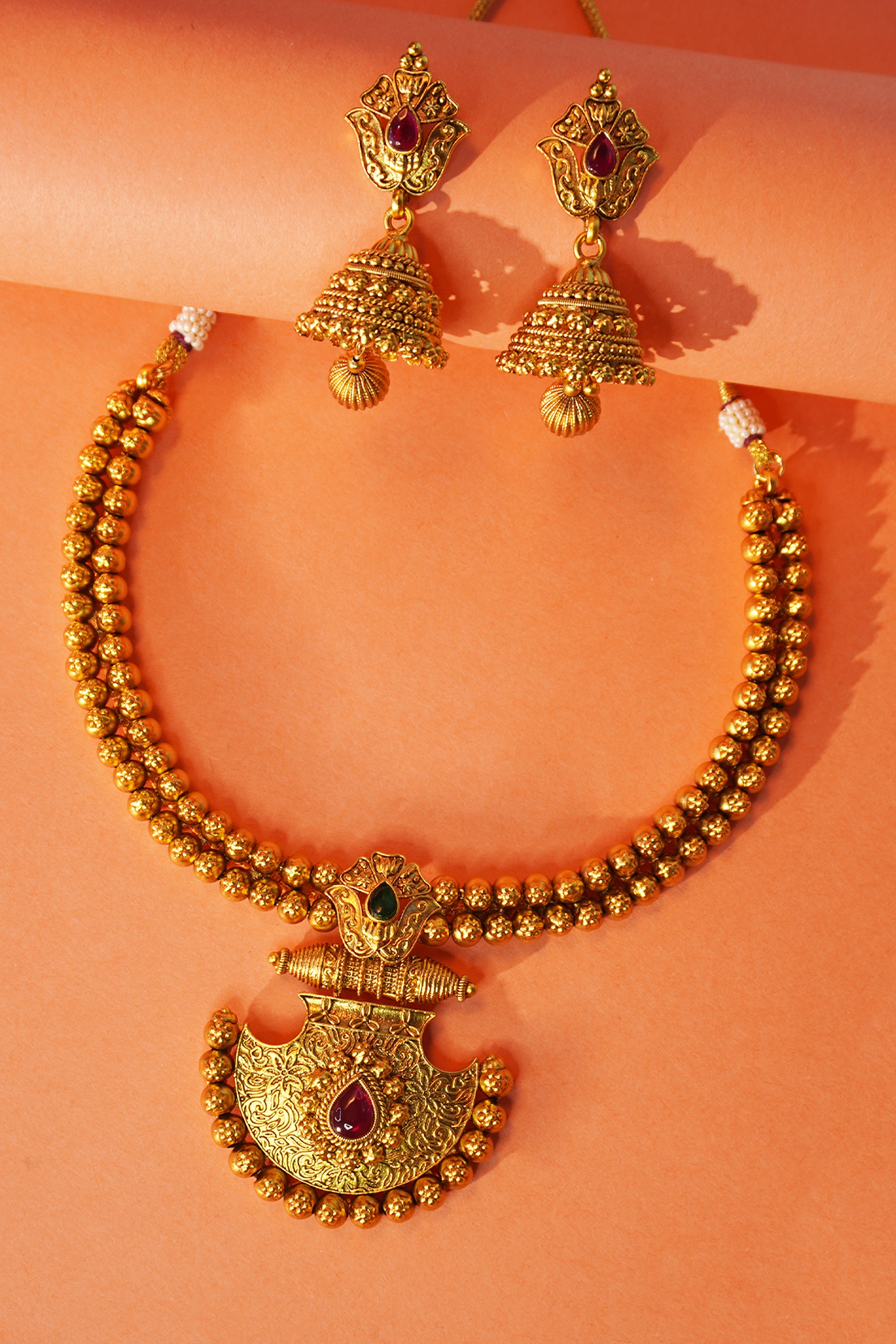 The love of Indian women that is gold jewellery is the symbol of love and elegance. This golden necklace set is here for you to flaunt your Indianness. It is finely and highly polished with gold. And the traditional necklace set is studded with golden moti and red and green stones. The double moti dori adds to the beauty and uniqueness. The jhumkas show the perfect pair and can be adorned individually. It is comfortable to wear because of its lightweight.