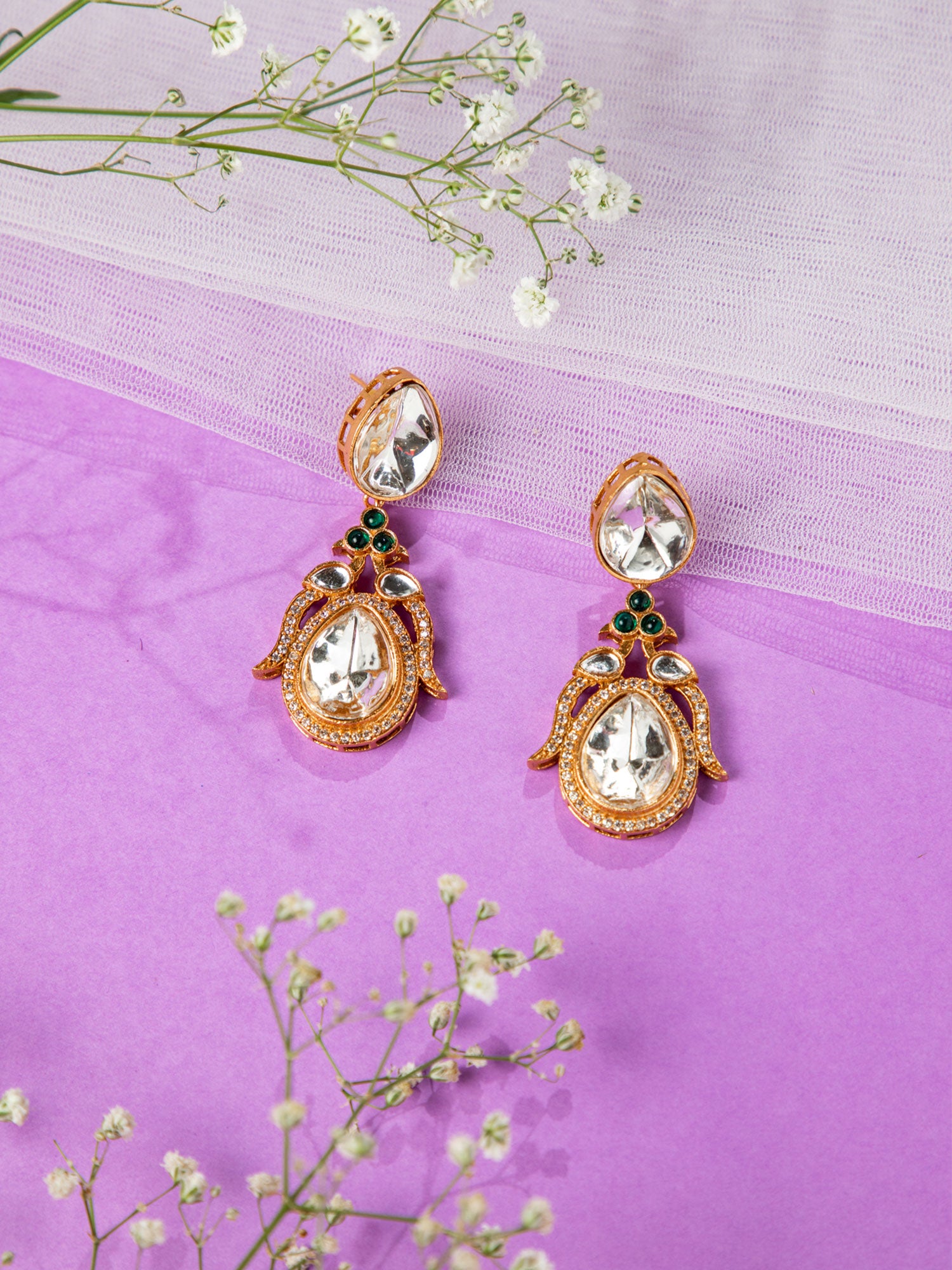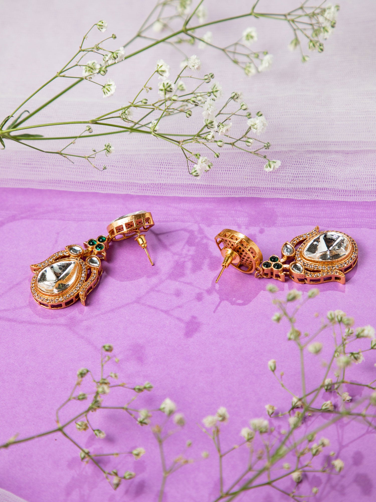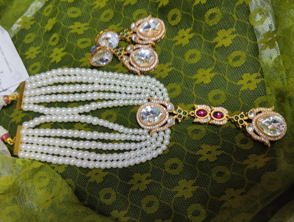 Handcrafted by local artisans, this 24K gold-plated multi-layered pearl chain necklace set features a pendant with emerald green, ruby red, white American diamond stones, and kundans. The matching big kundan earrings complete the gorgeous design, perfect for parties, festivals, or functions.