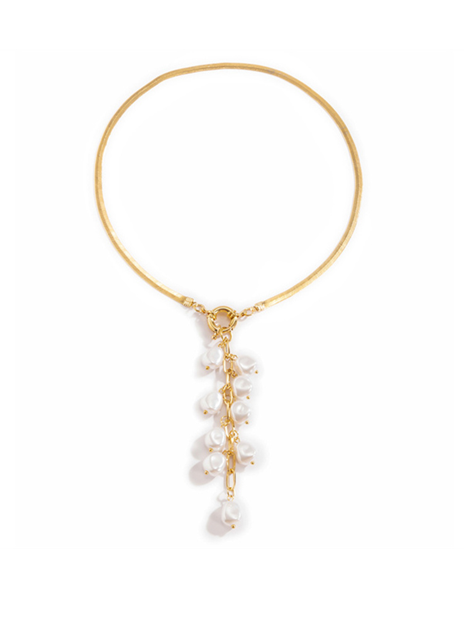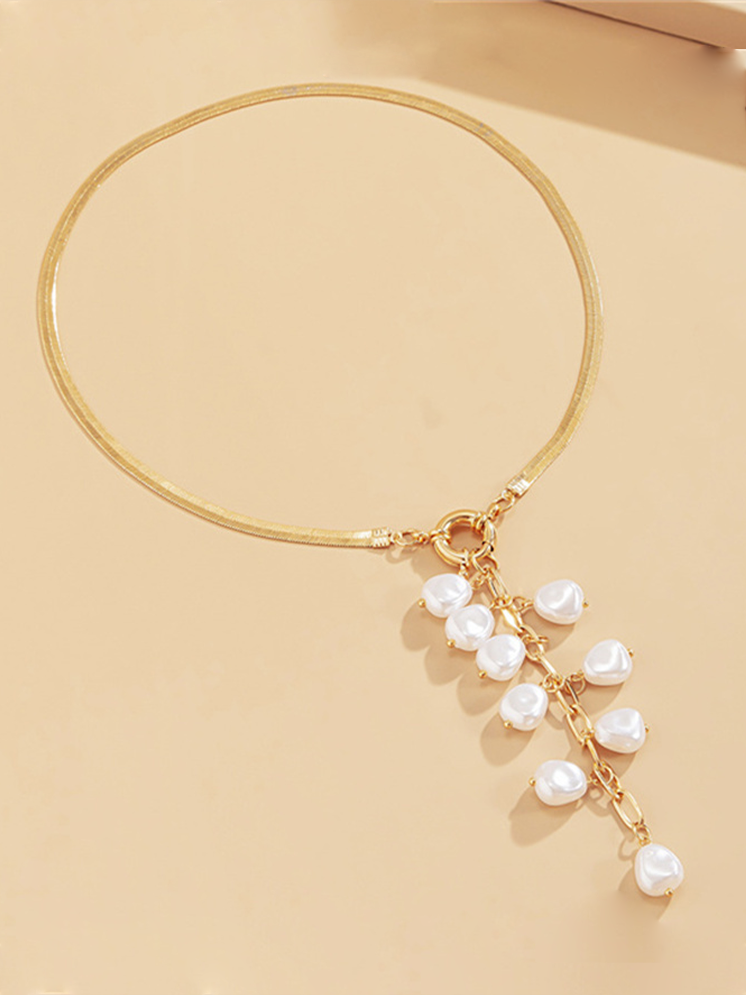 Discover sophistication with our 24K Gold-Plated Necklace featuring an interlock snake chain. Adorned with elegant white faux pearls suspended at the center, it exudes chic and mesmerizing charm. Handcrafted by local artisans, this exquisite piece showcases the latest in jewelry design, perfect for elevating your party or function ensemble.