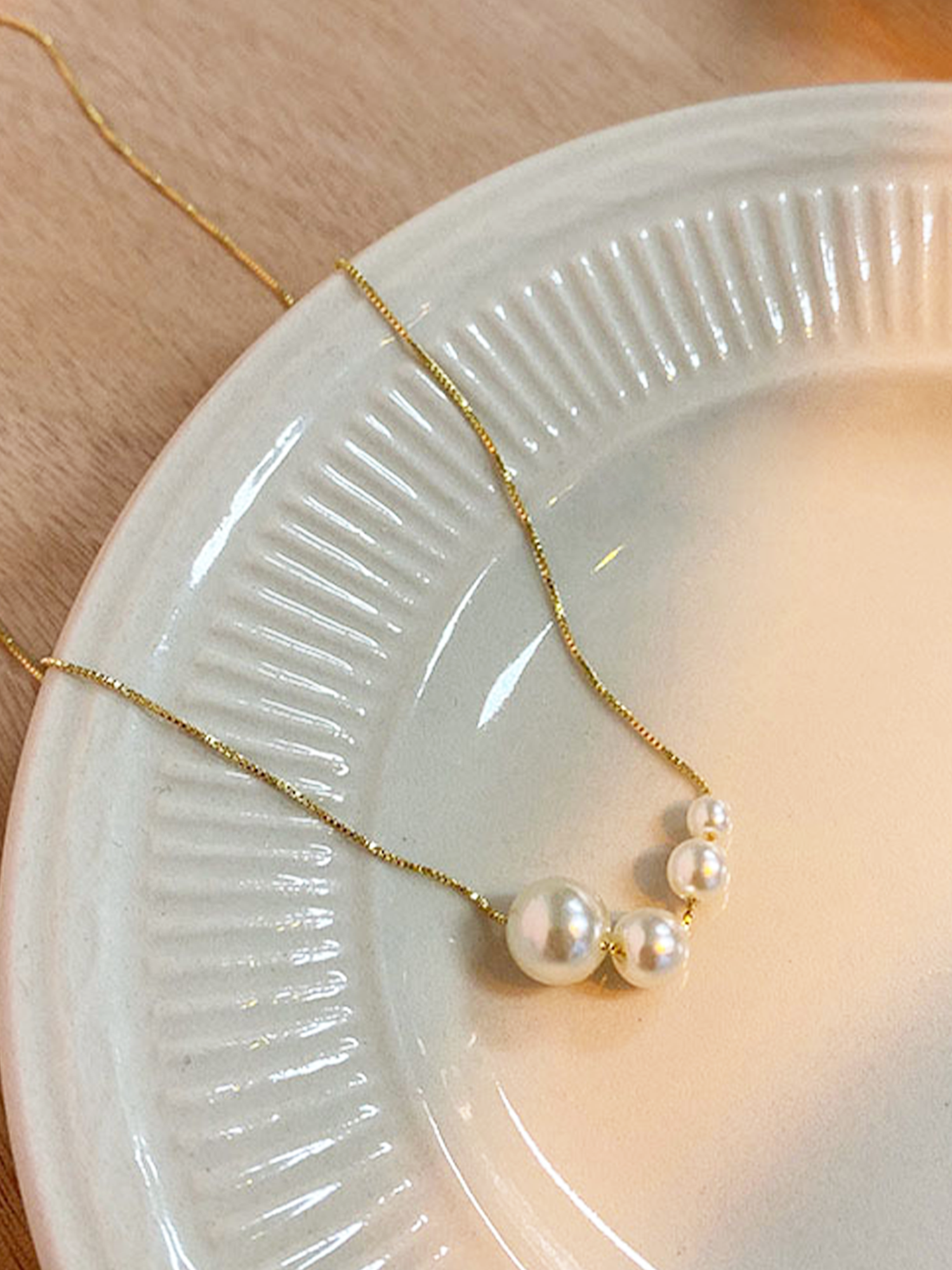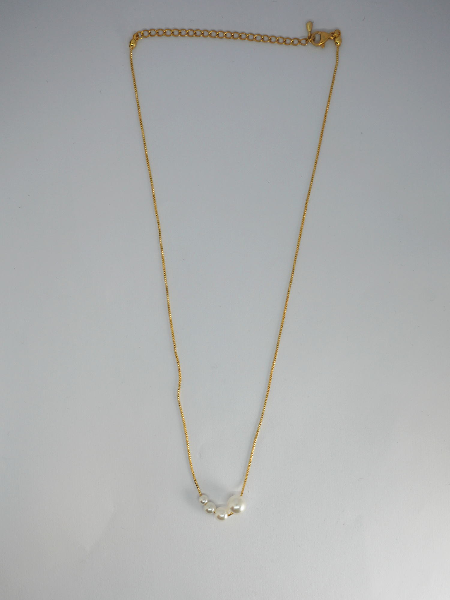 Explore elegance with our 24K gold-plated necklace featuring a delicate interlock chain adorned with moving white faux pearls in various sizes. Handcrafted by local artisans, its mesmerizing and captivating design seamlessly blends daily wear versatility with evening-ready sophistication, making it perfect for any occasion.