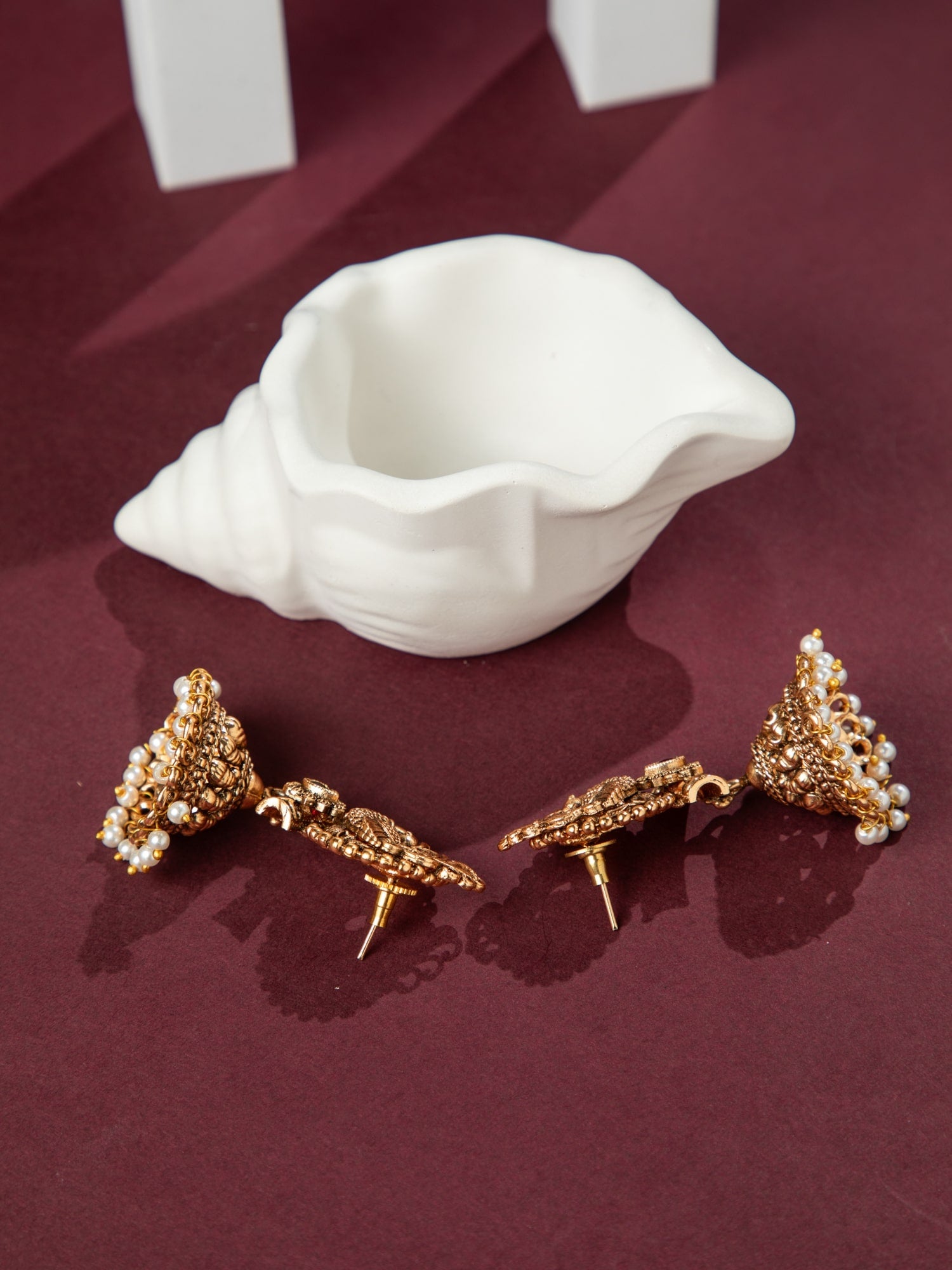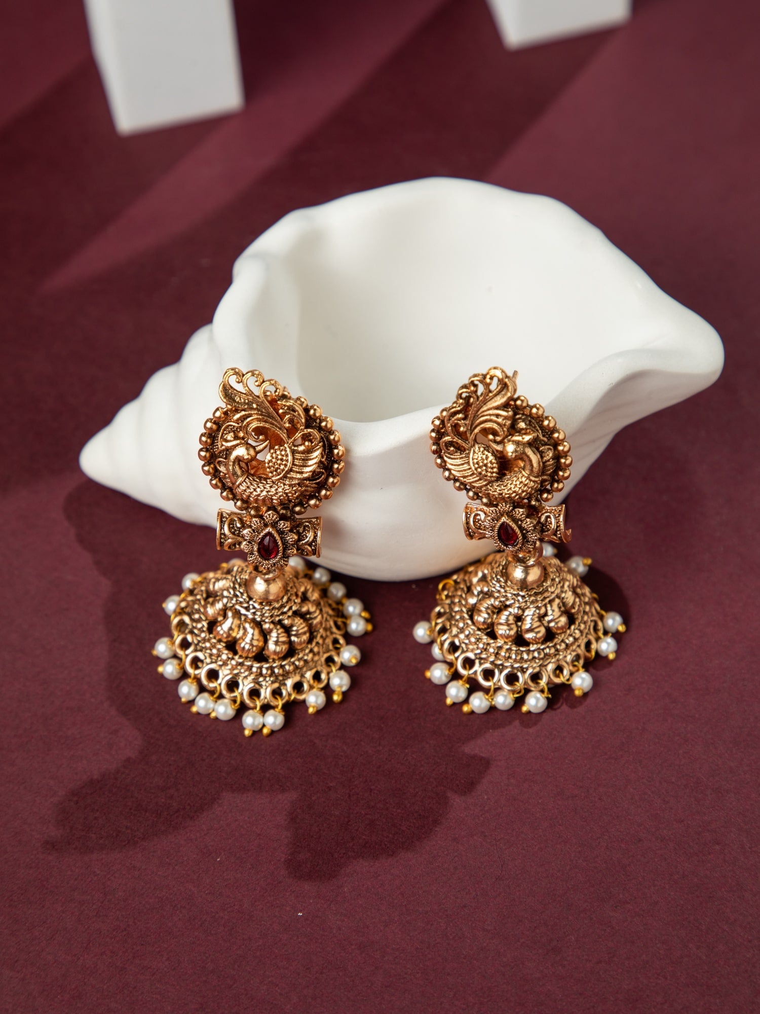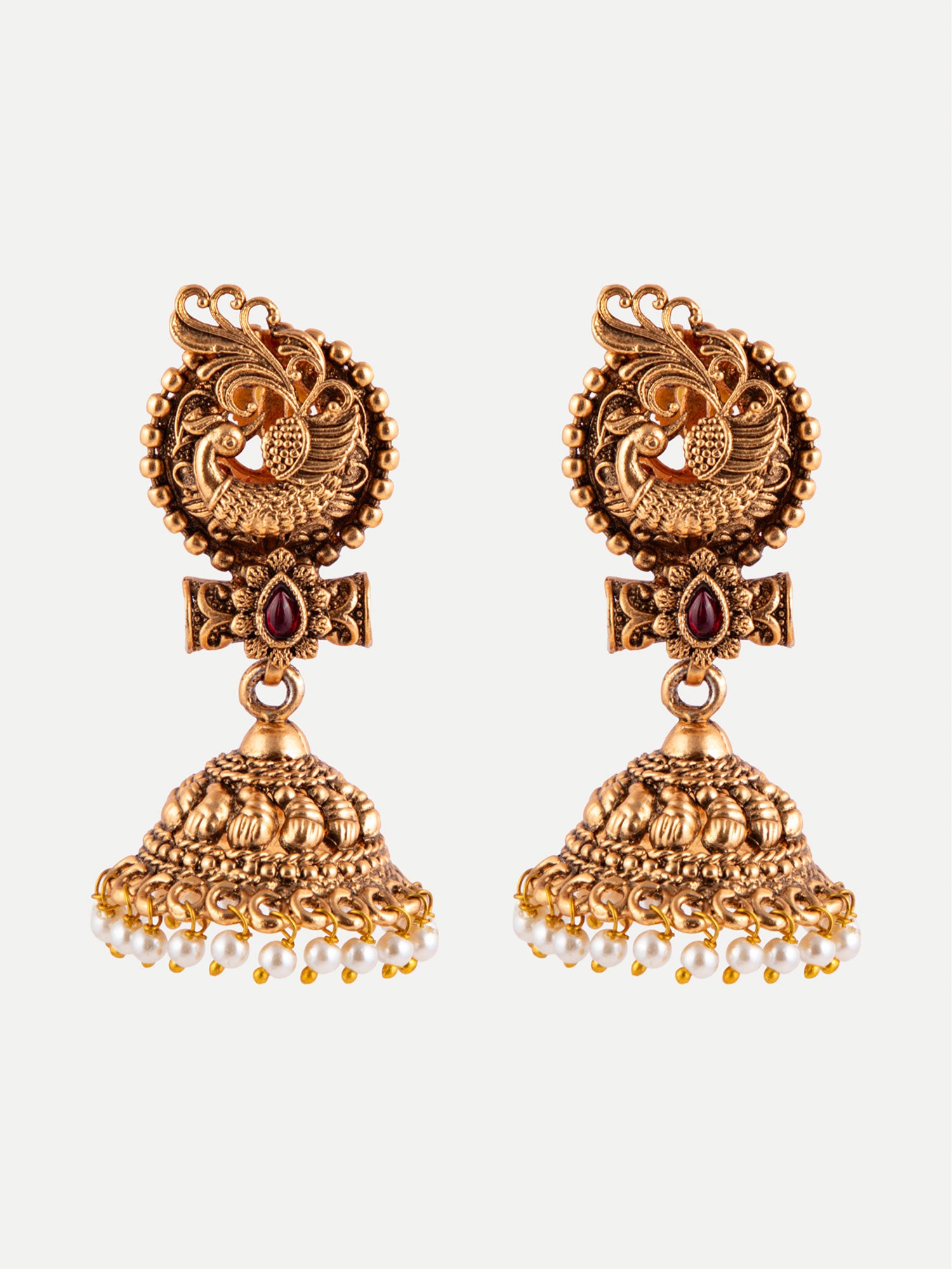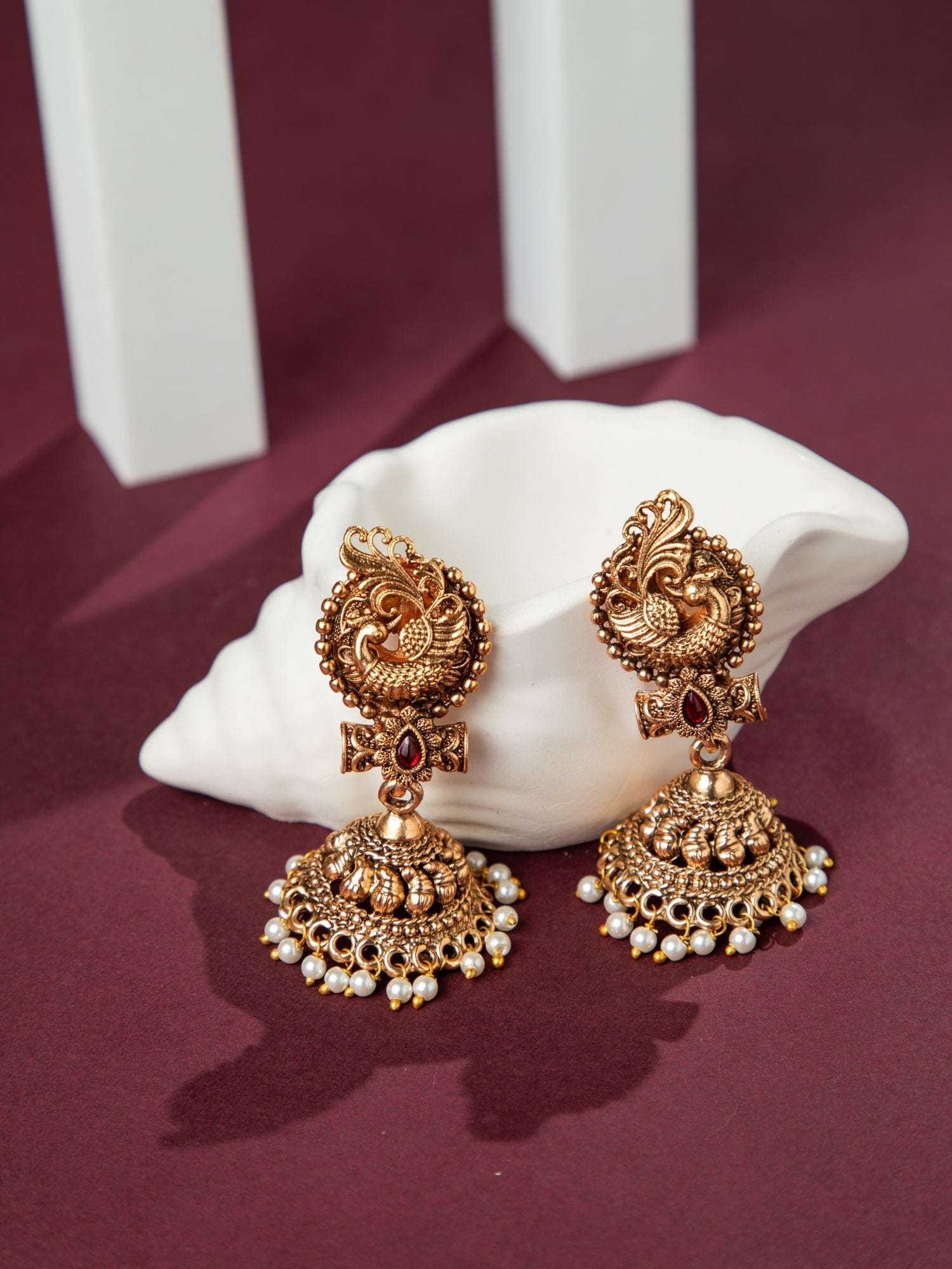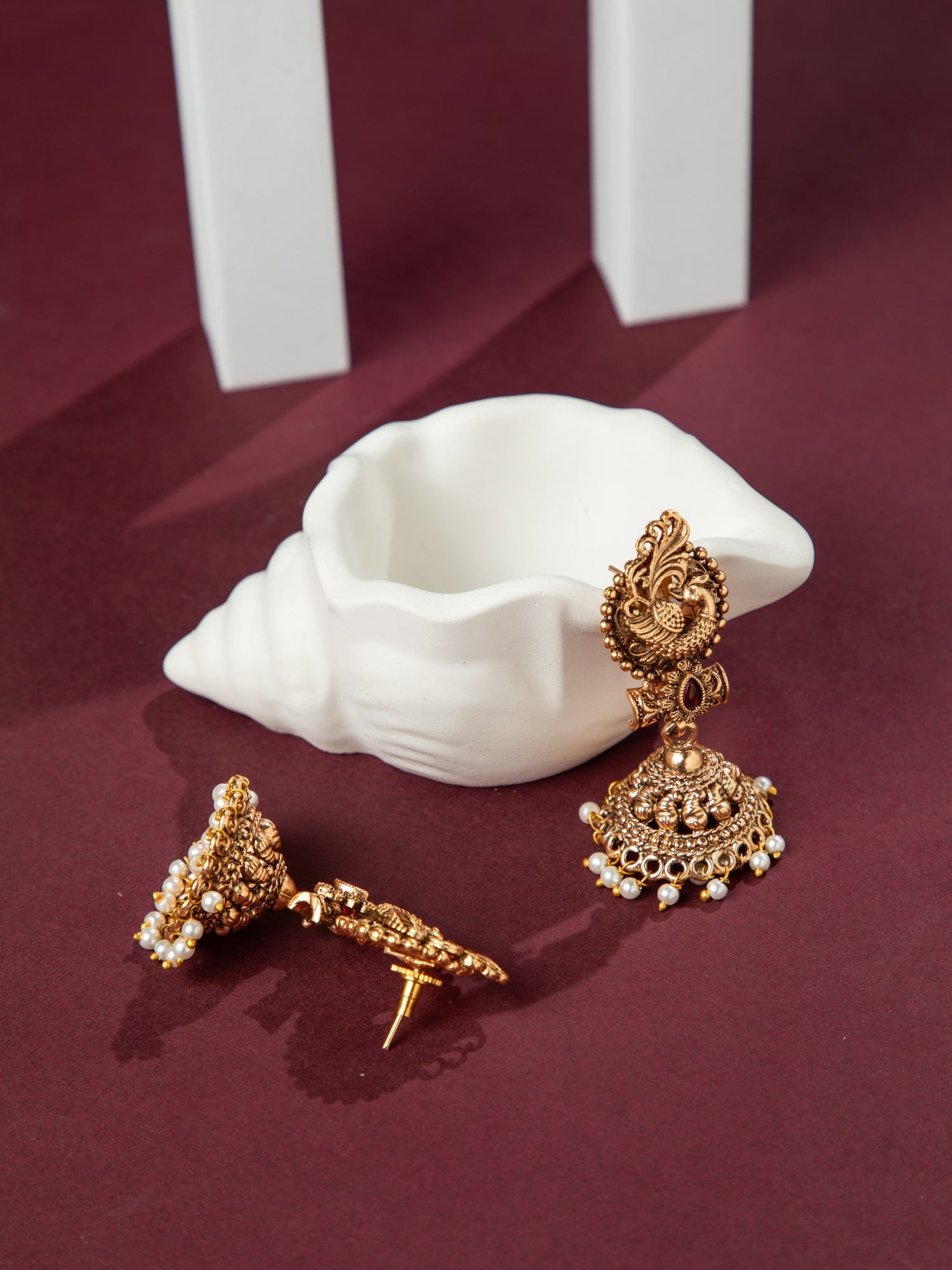 24K Gold Plated Peacock Jhumka Earrings with Red Stone and Pearls