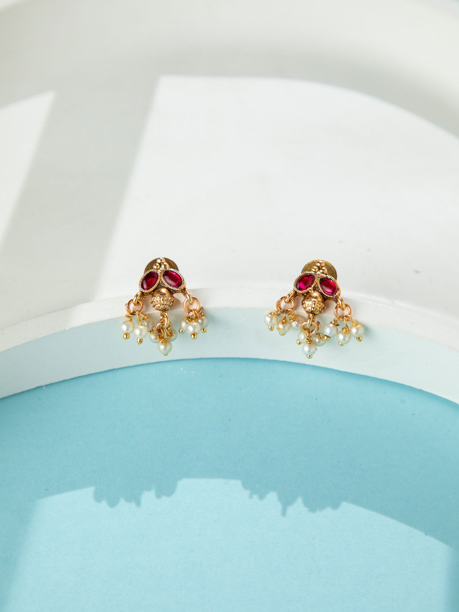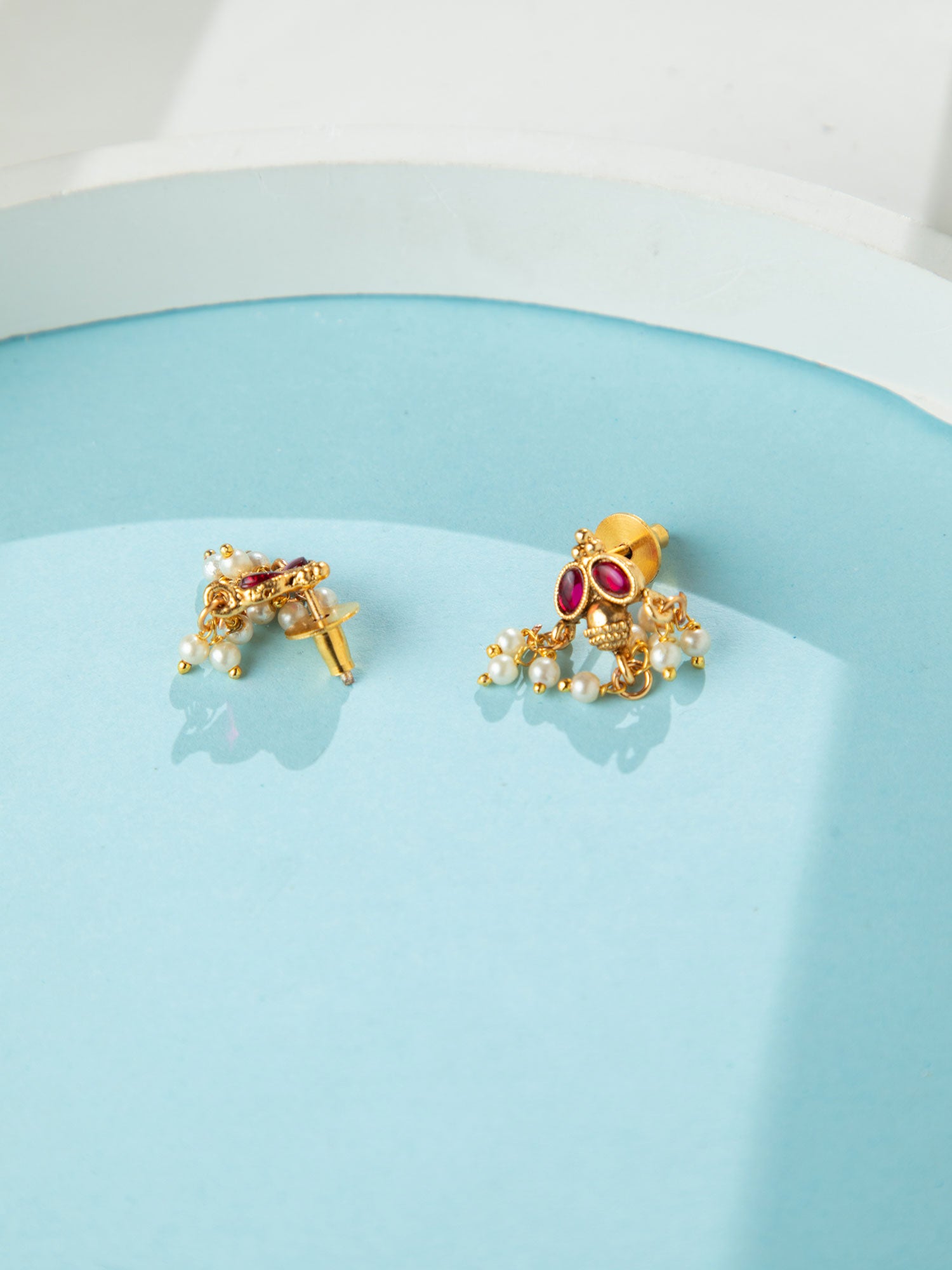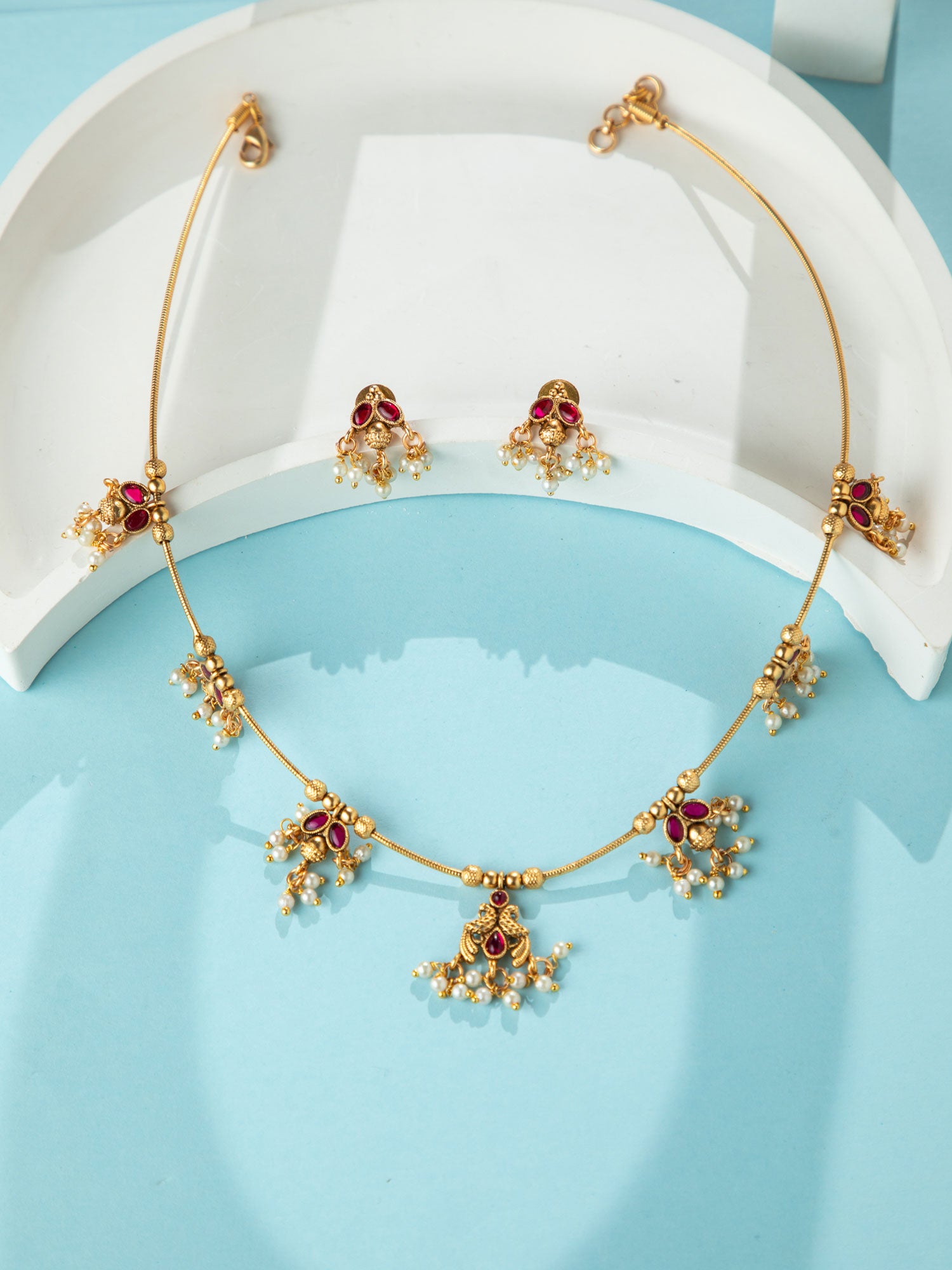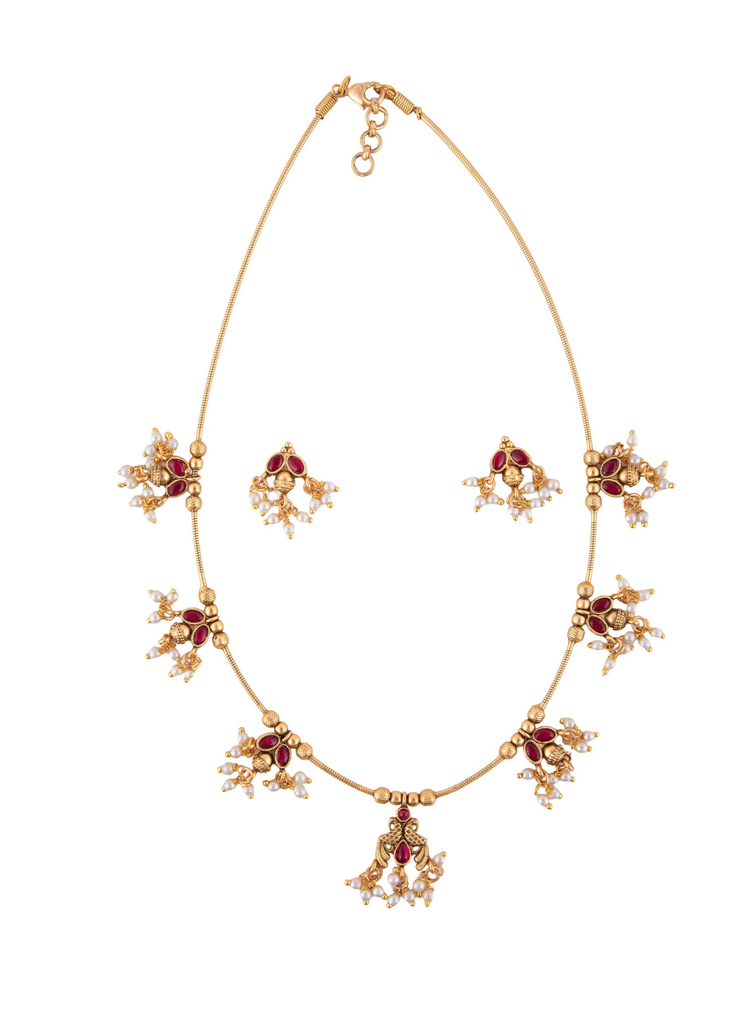 24K Gold Plated Peacock Ruby Pearl Necklace and Earrings Set