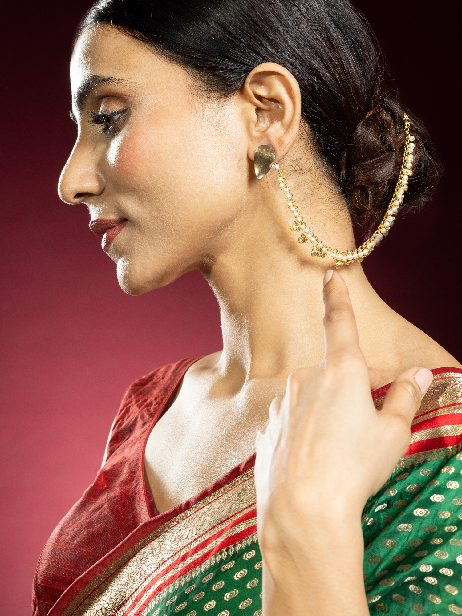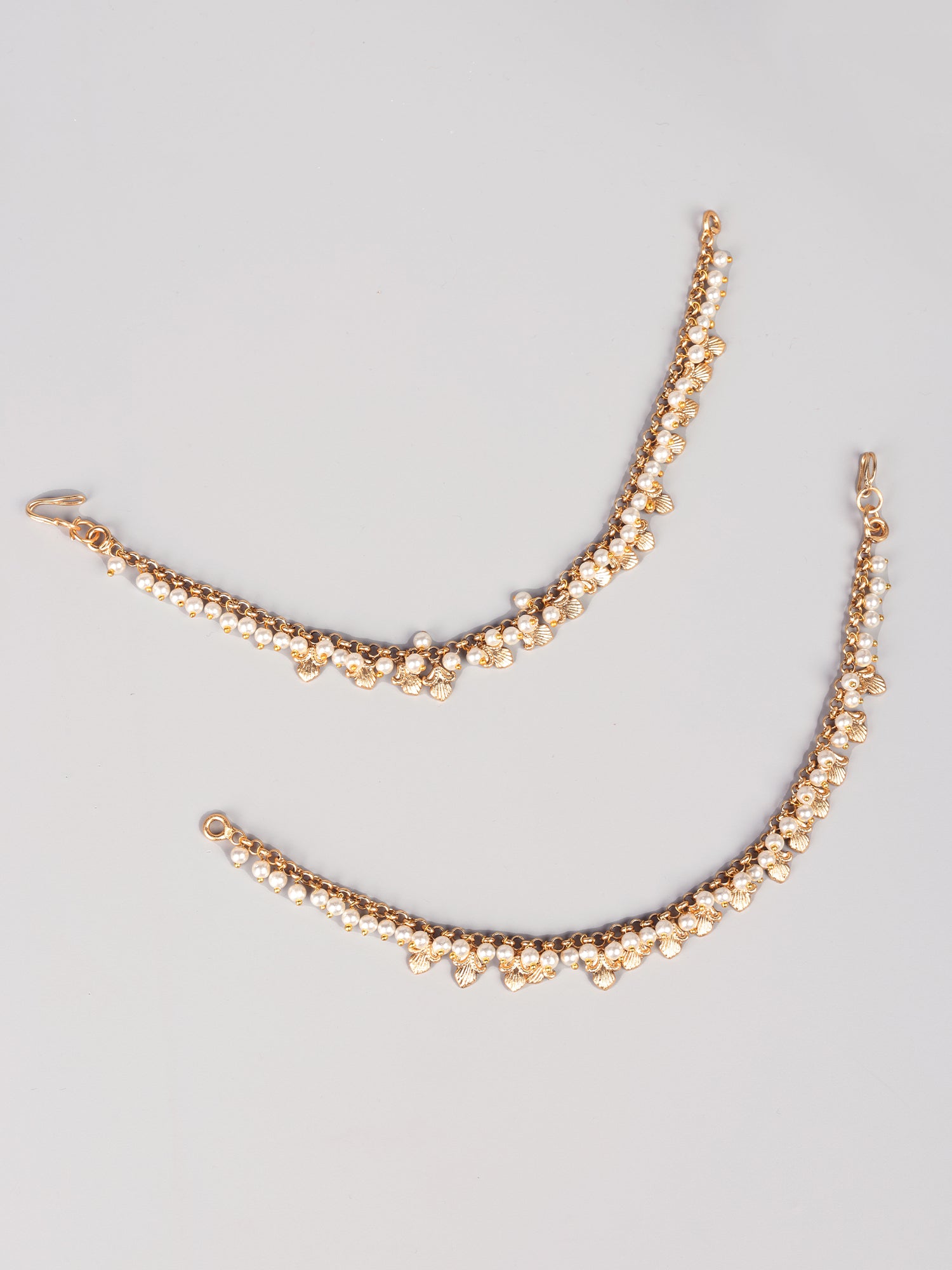 Accentuate your look by pairing this Traditional Gold-Plated Pearls and Petal Single Layer Ear Chain with a classic Indian saree or salwar suit. Let its elegant design add a touch of traditional charm to your attire.