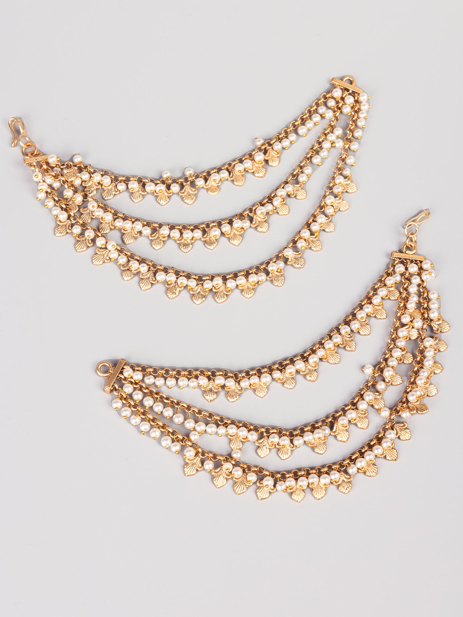 Introducing our exquisite Traditional Gold-Plated Pearls and Petal Triple Layer Ear Chain. Crafted by skilled local artisans, this ear chain showcases a stunning design with three layers of gold-plated petals and pearls, exuding elegance and charm. With anti-allergic and anti-tarnish properties, it offers both style and comfort, making it ideal for any occasion. Skillfully crafted to reflect the latest design trends, it adds a touch of modern sophistication to your ensemble, perfect for functions, festivals, and parties.