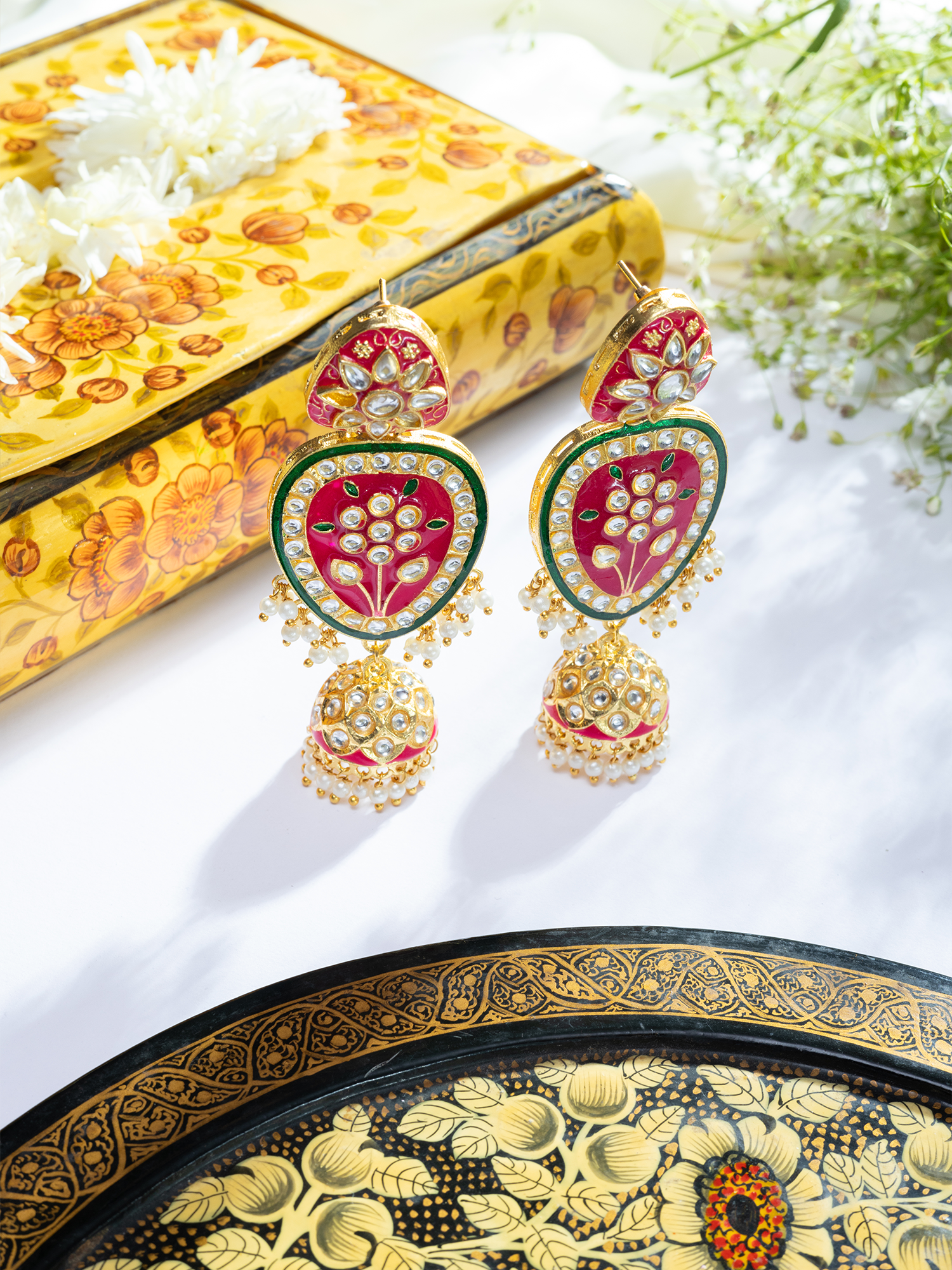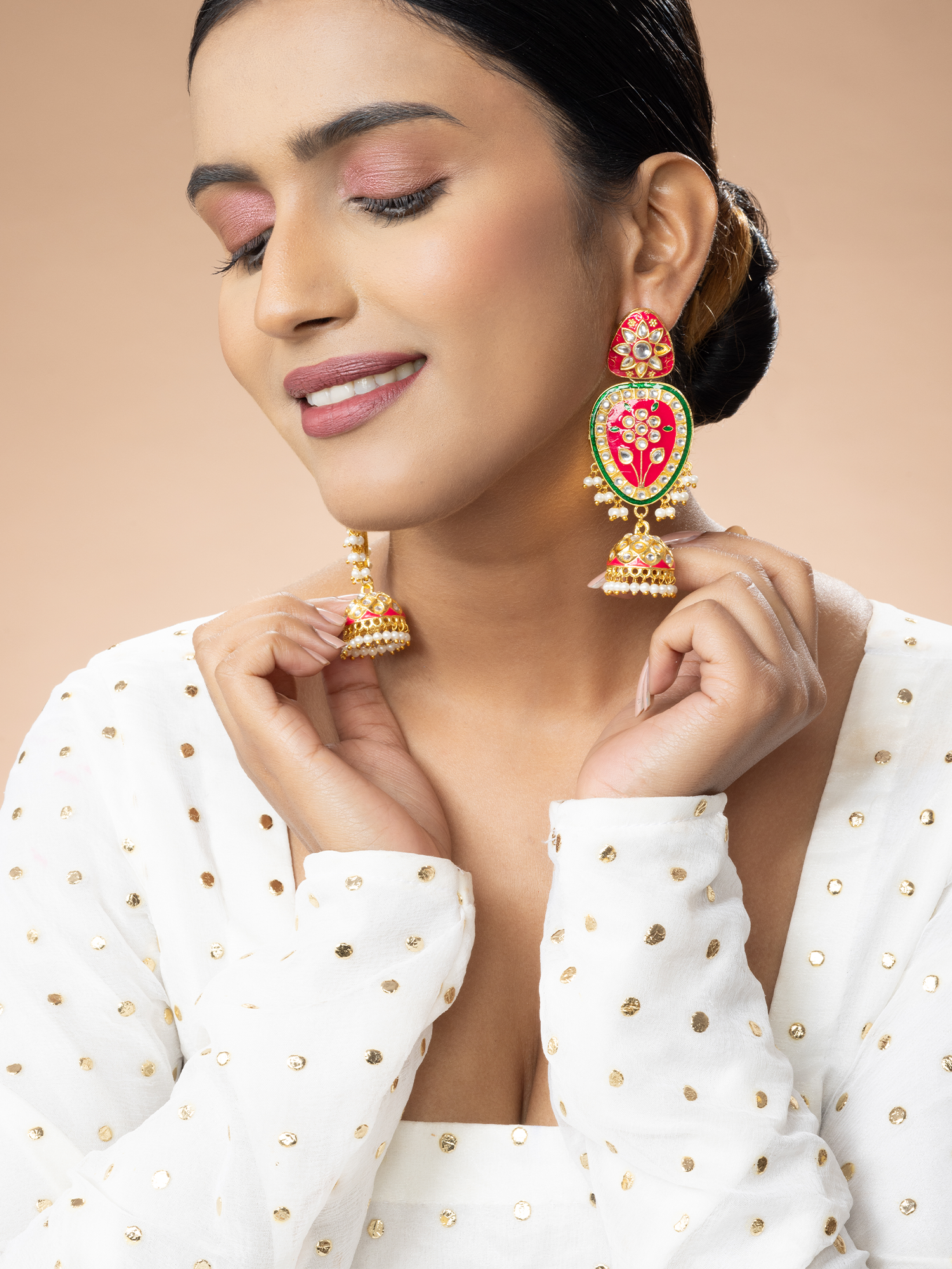 Embrace cultural splendor with our handcrafted Meenakari Earring Set, resplendent in 24K Gold gold-plated pink and Green hues. The long earrings feature a captivating floral design adorned with Kundan, creating a perfect blend of ethnic charm. The Jhumka, plated in 24K gold and embellished with Kundan and pearls, adds opulence to these festival and function-ready earrings. Meticulously crafted by local artisans, this masterpiece showcases the artistry of tradition, making it an exquisite addition to your collection of ethnic jewelry.
