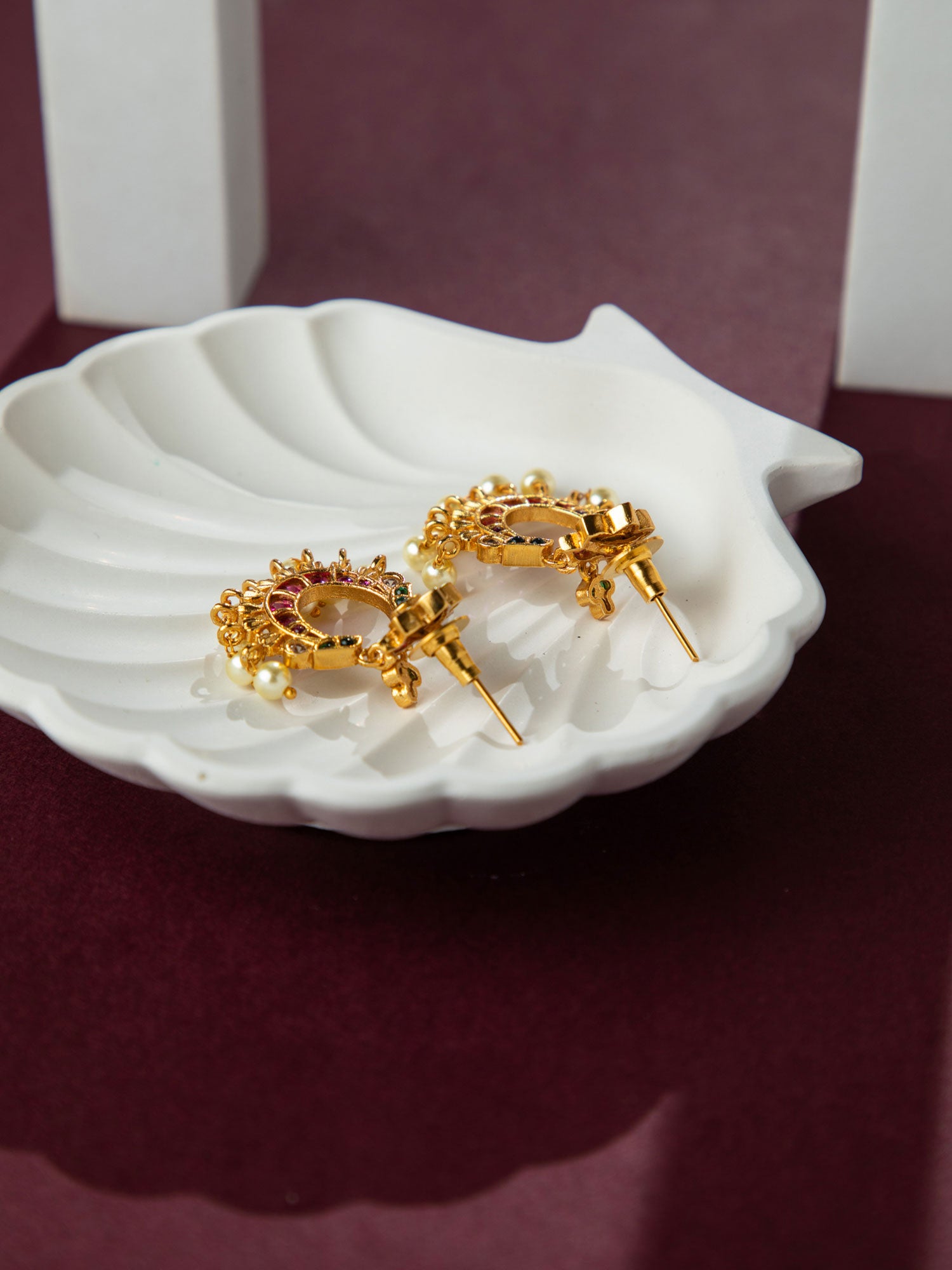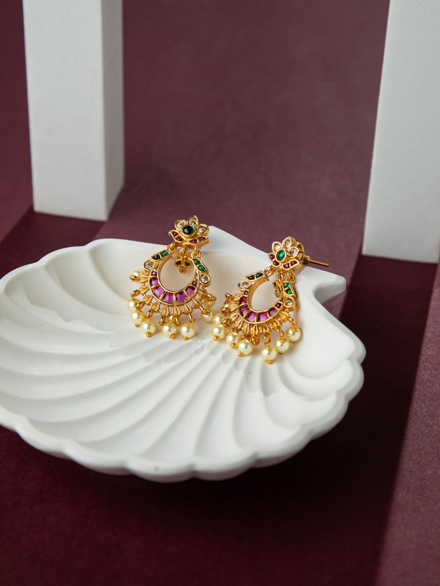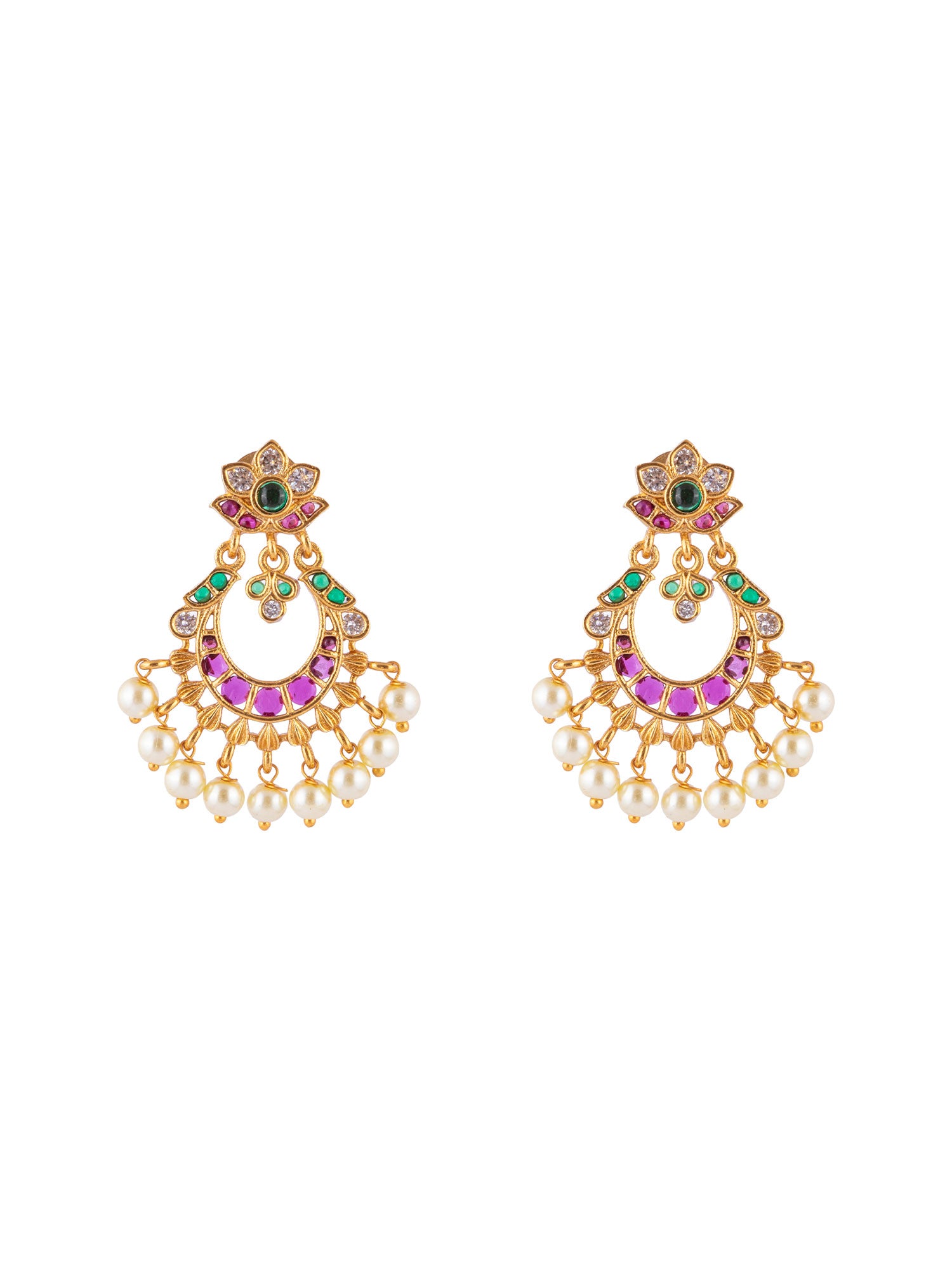 24K Gold Plated Pink, Green and White stone Chandbali Earrings with Faux Pearls