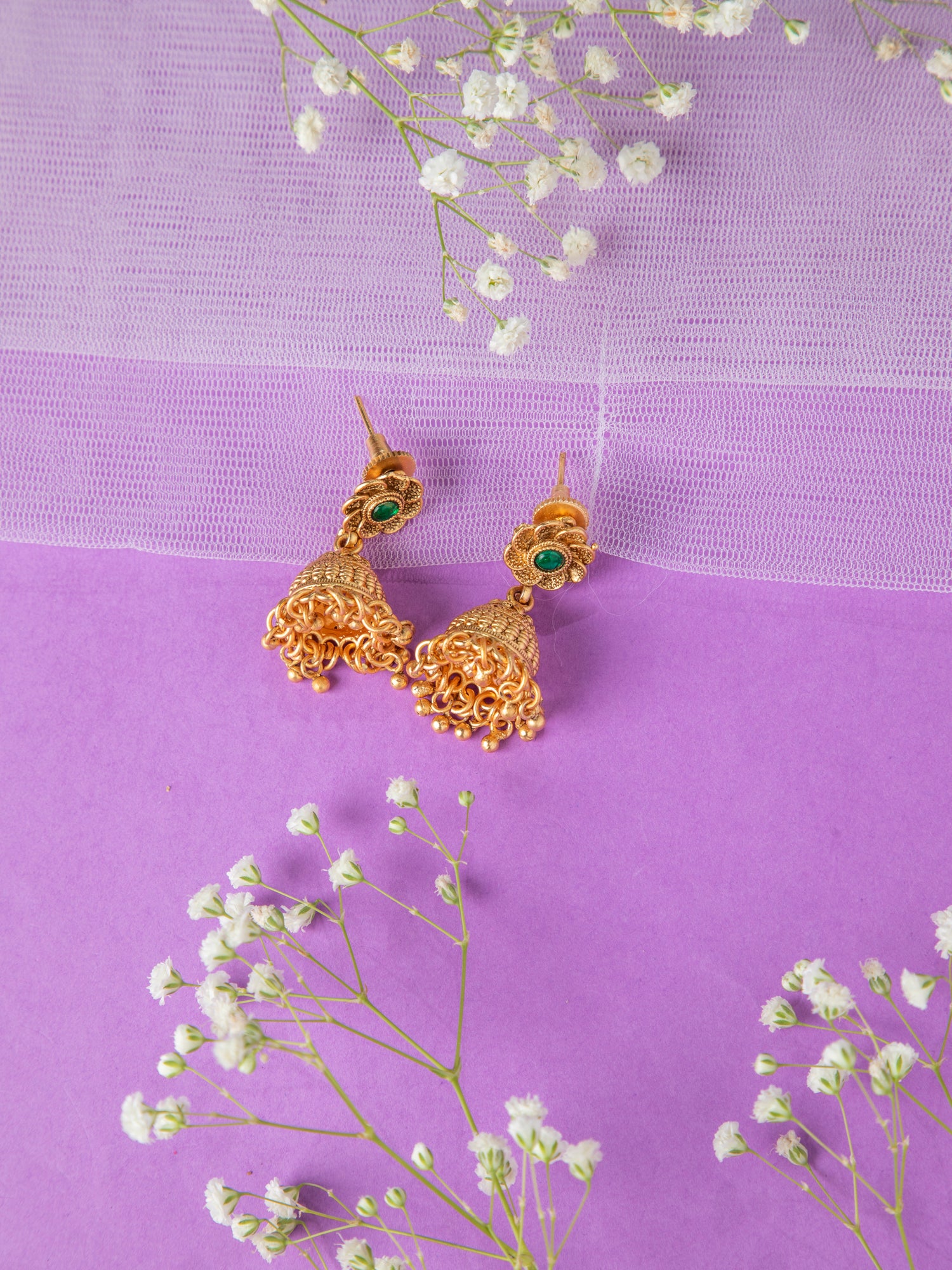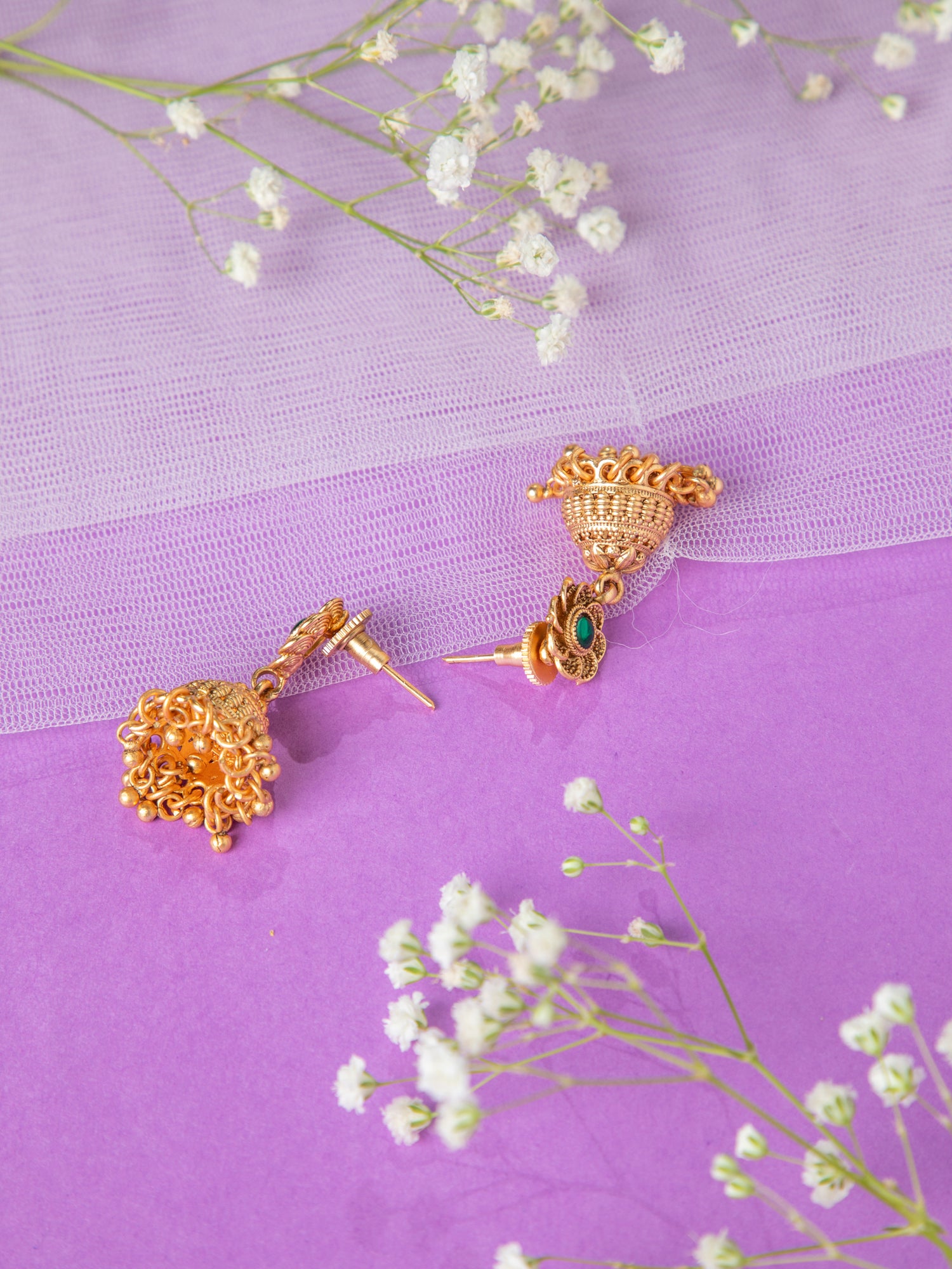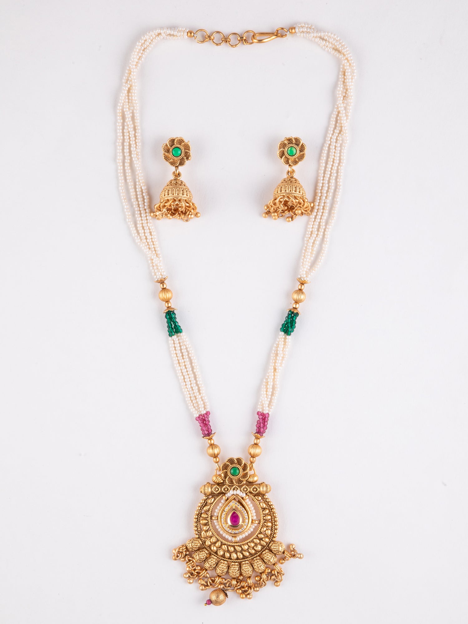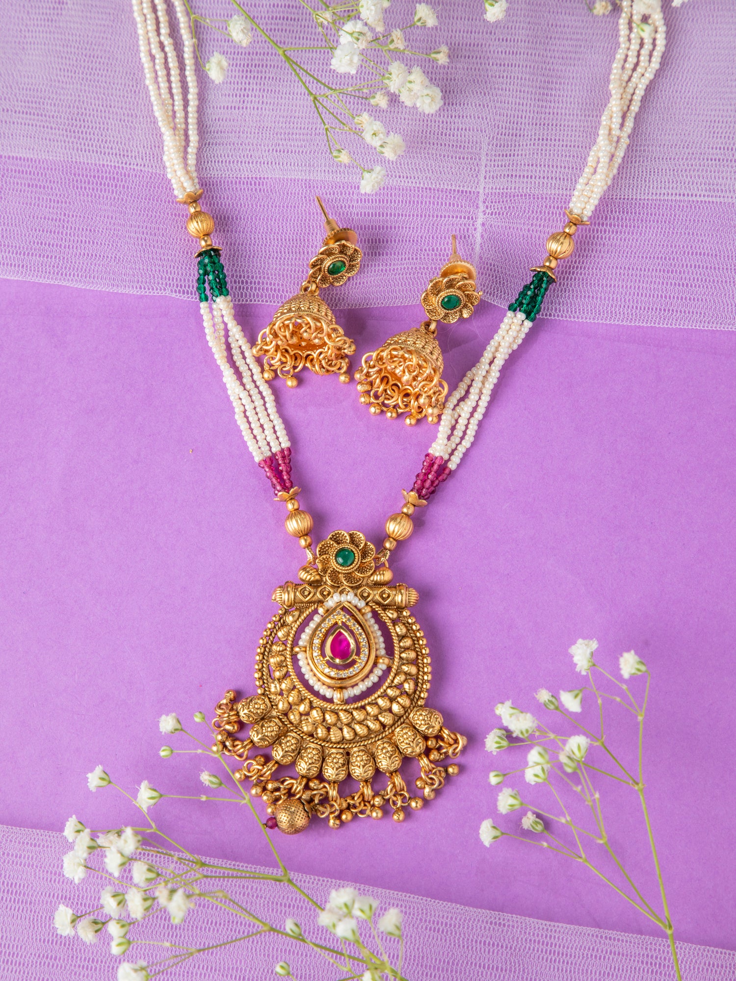 Elevate your ethnic look with this 24K gold plated, multi-layered pearl necklace featuring red, green accents and a ruby pendant. Paired with emerald studded jhumka earrings for festive elegance.