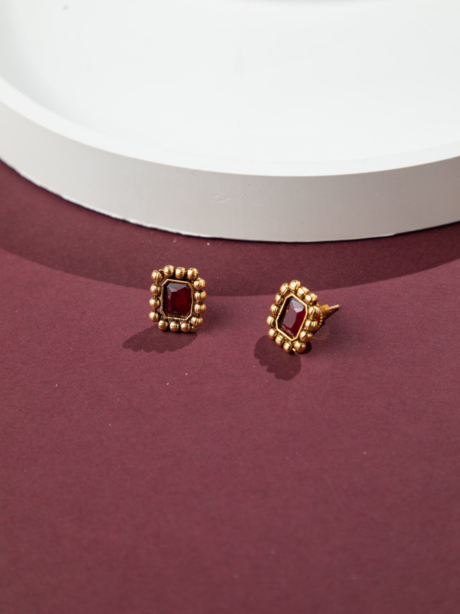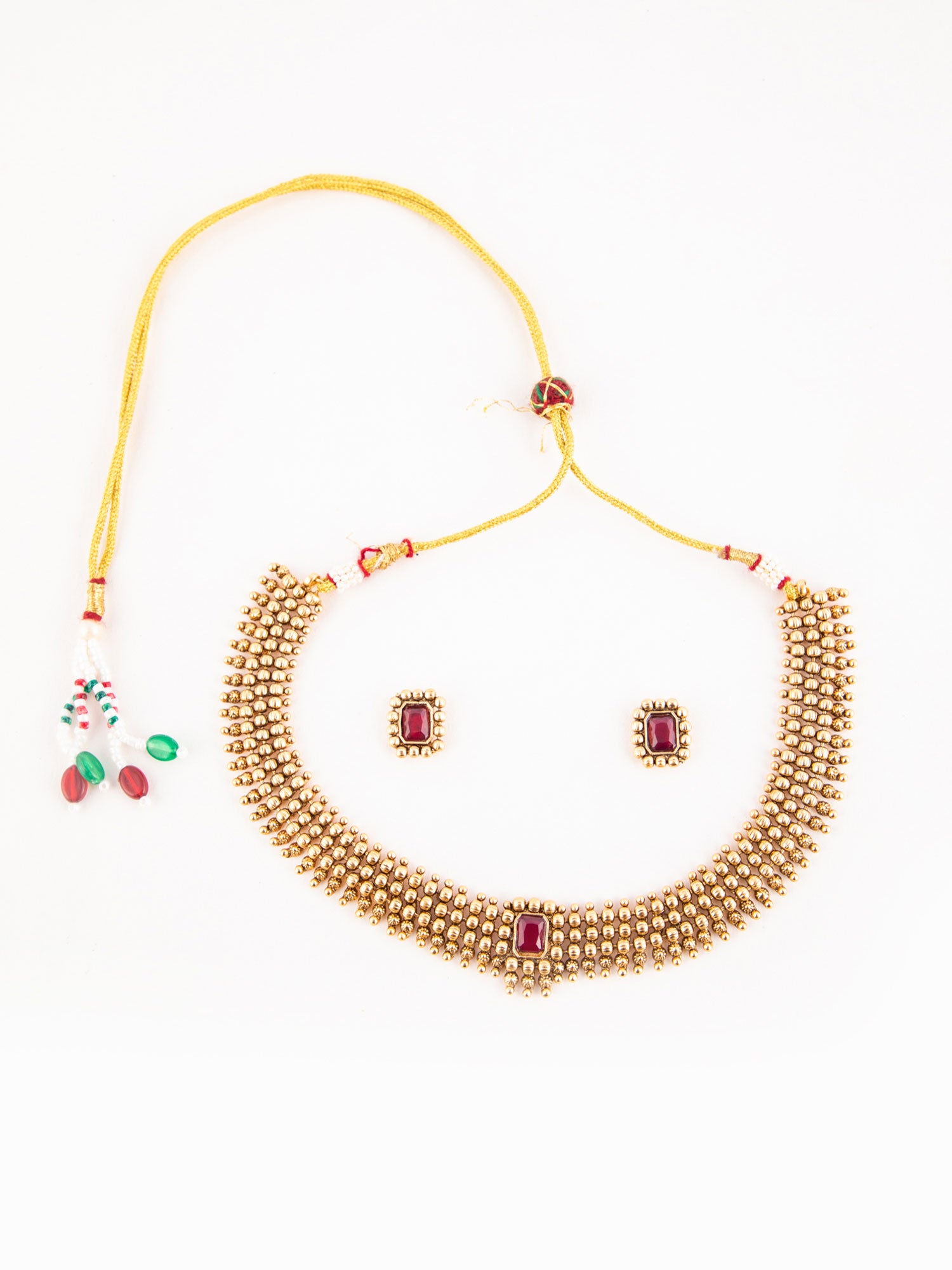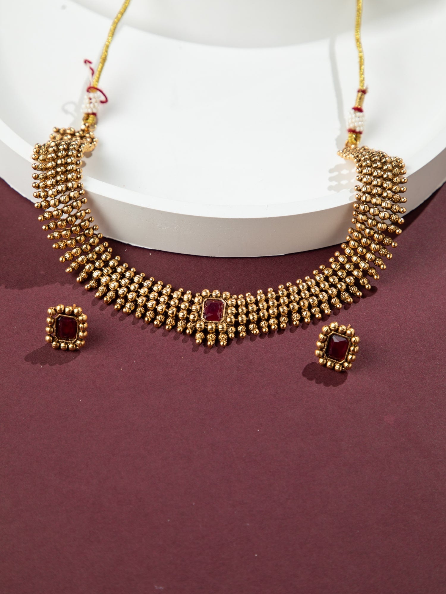 24K Gold-Plated Red Stone and Multilayer Design Antique Necklace Set with Earrings
