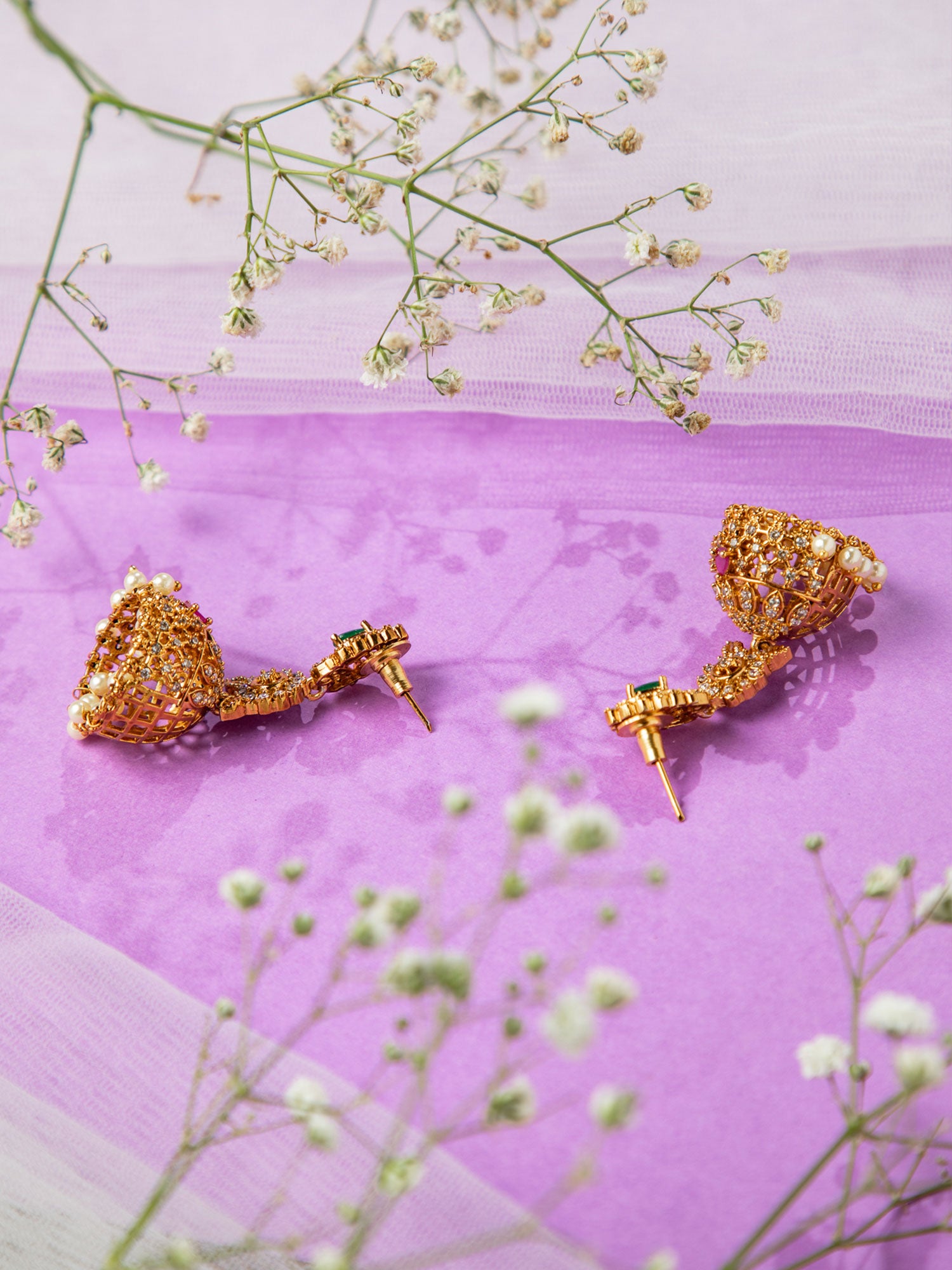 Mesmerizing 24K gold-plated jhumka earrings adorned with red ruby, emerald green stones, white CZ stones, and faux pearls. Handcrafted by local artisans, this must-have modern design is perfect for festive, party, or function wear with timeless elegance.