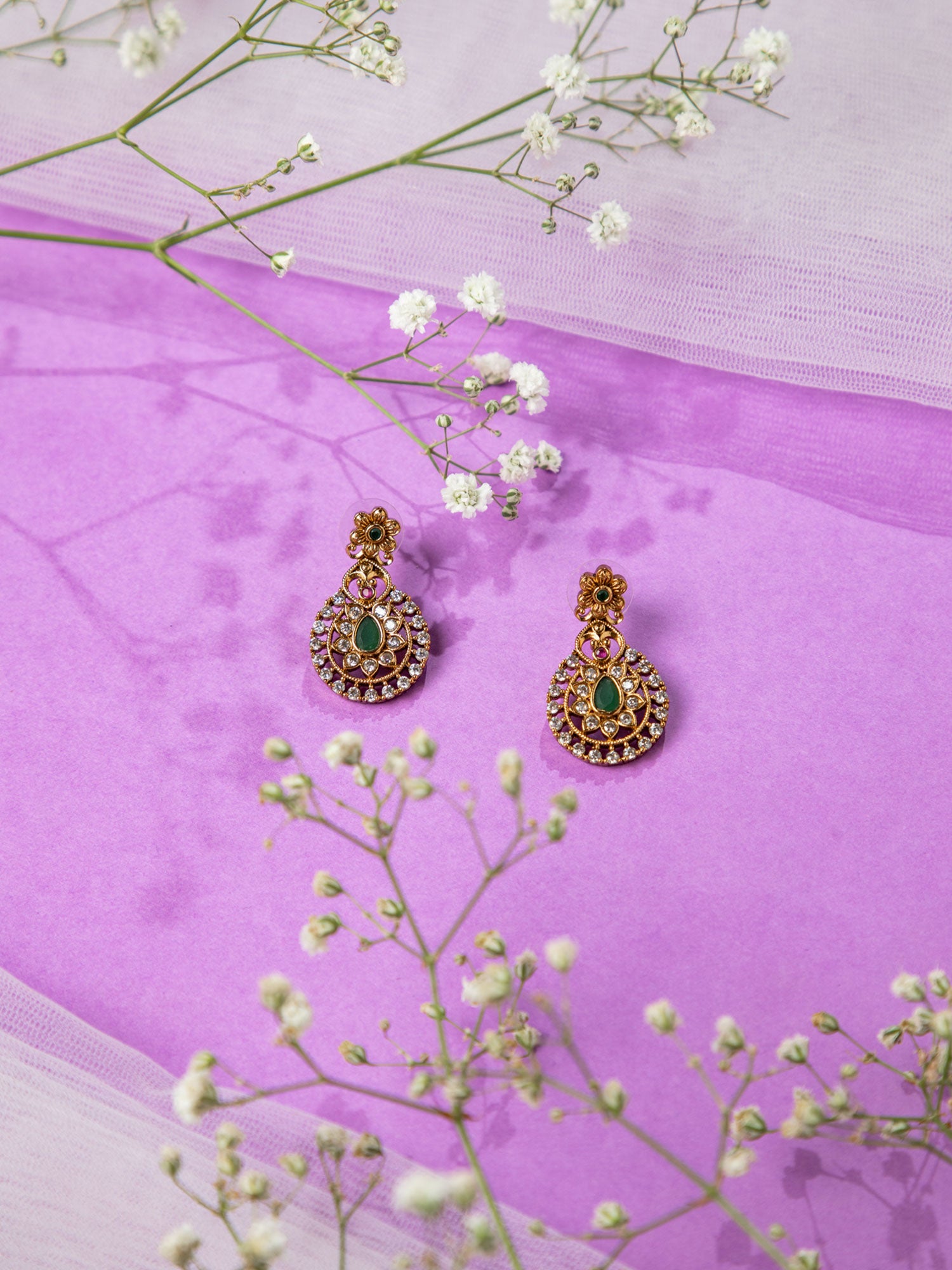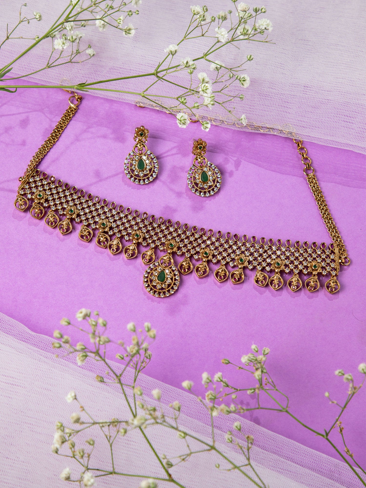 Handcrafted by local artisans, this 24K gold-plated chokar necklace set features an antique finish with ruby, emerald, and white American diamond stones. The matching earrings with red, green, and white CZ stones make it a must-have for festive occasions.