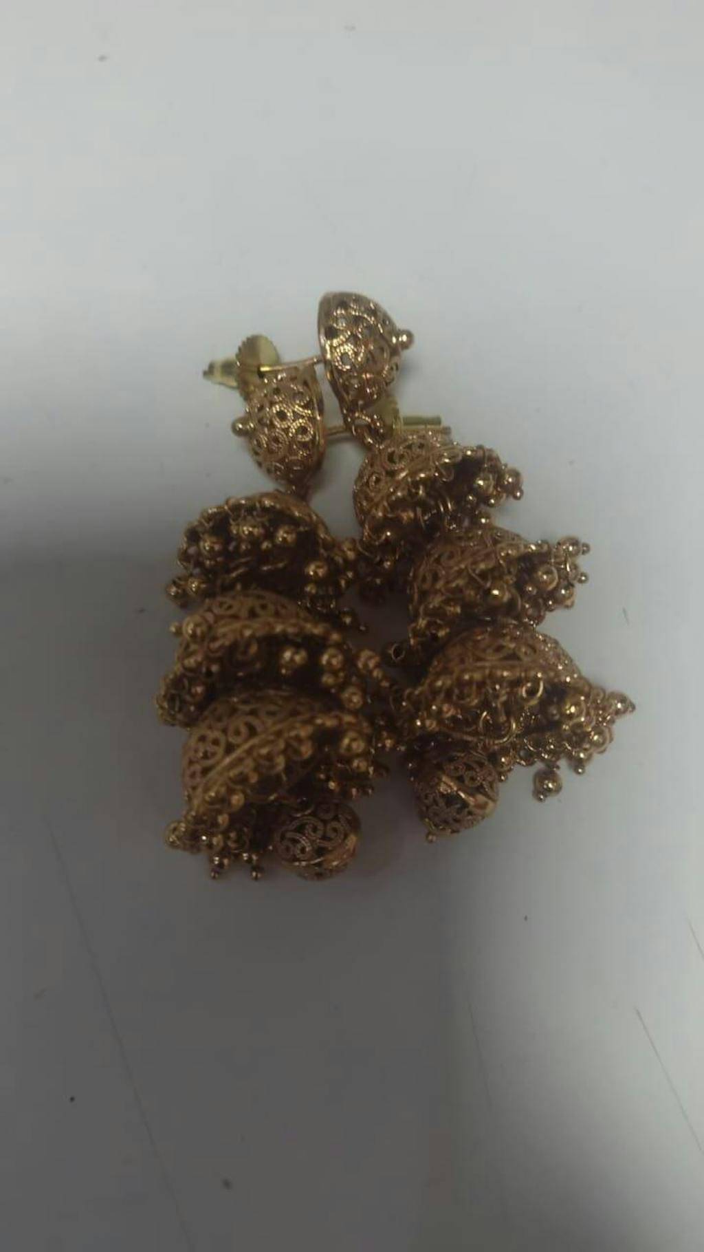 This 24k Gold Plated Jhumka has a unique three-layered design. This Jhumka will add special meaning to your Indian outfit. Jhumki like this goes well during wedding ceremonies and other traditional events like a pooja.