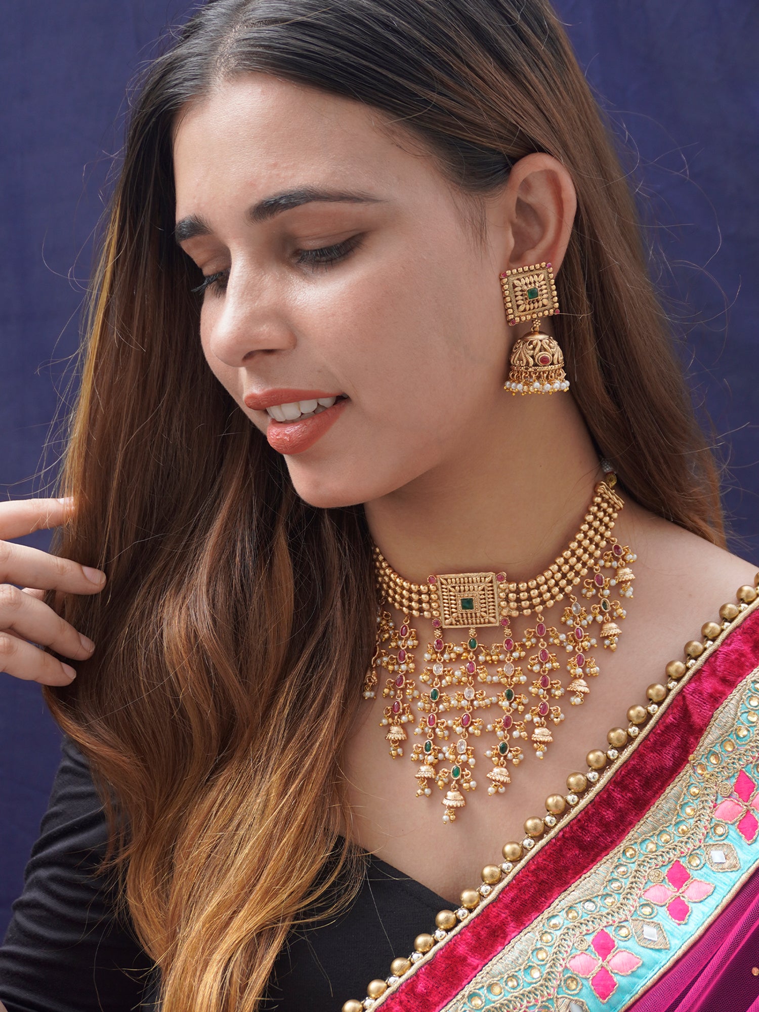 Embrace classic elegance by pairing this Choker Set with a traditional saree or lehenga. Keep your hair styled in a traditional updo or loose waves, adorned with a few decorative hairpins or flowers.