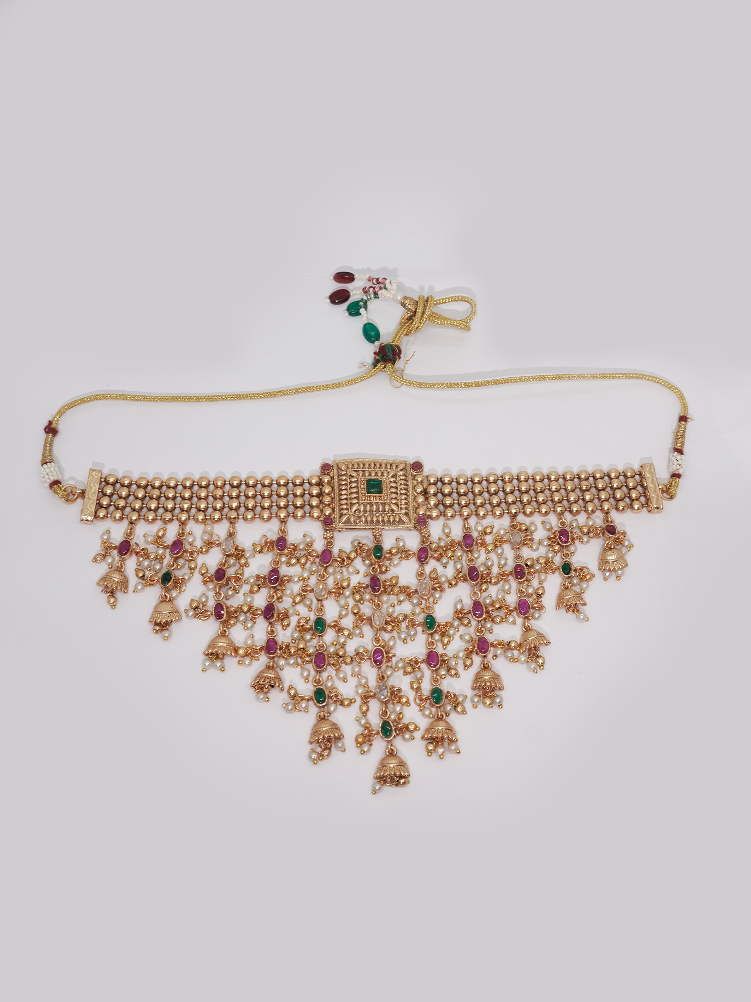 Discover the Niscka V-Shape Pearl & Gemstone Choker Set, where elegance and charm come together. This gold-plated choker features a striking V-shape and is adorned with lustrous white pearls, dazzling ruby stones, and delicate emerald accents. Charming bells add a playful touch with a gentle jingle as you move. Perfect for making a refined statement at any special occasion.