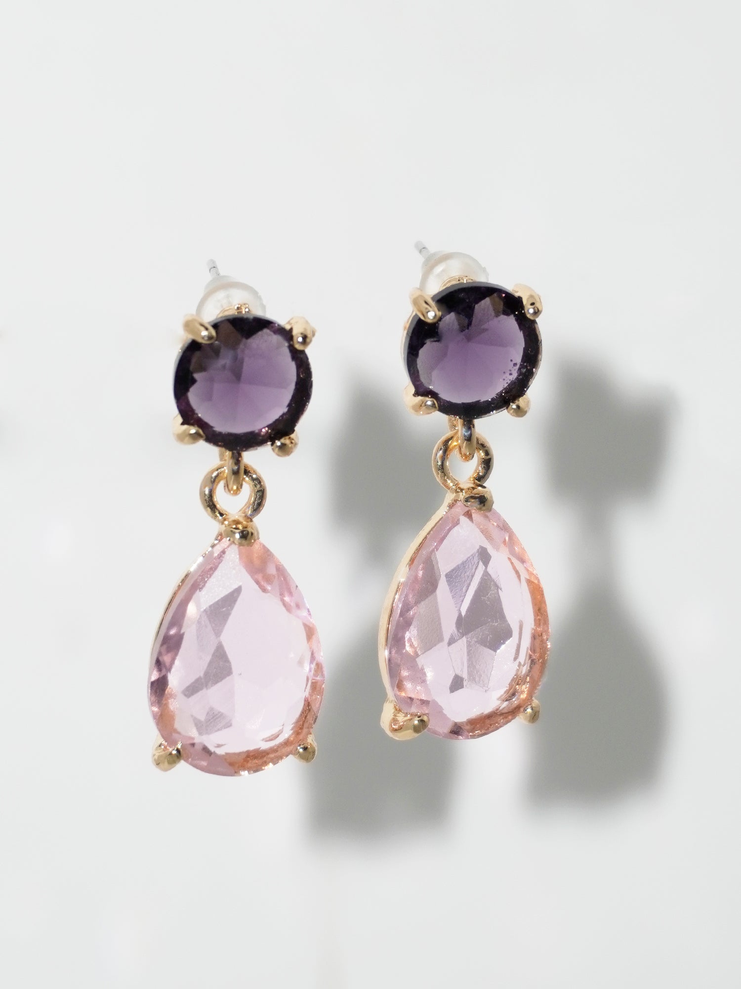 Elegant 24K gold-plated water droplet design earrings featuring a stunning large pink translucent stone and a round purple stone. Handcrafted by local artisans, this modern, must-have design adds a captivating touch to any party, festive, or function wear.