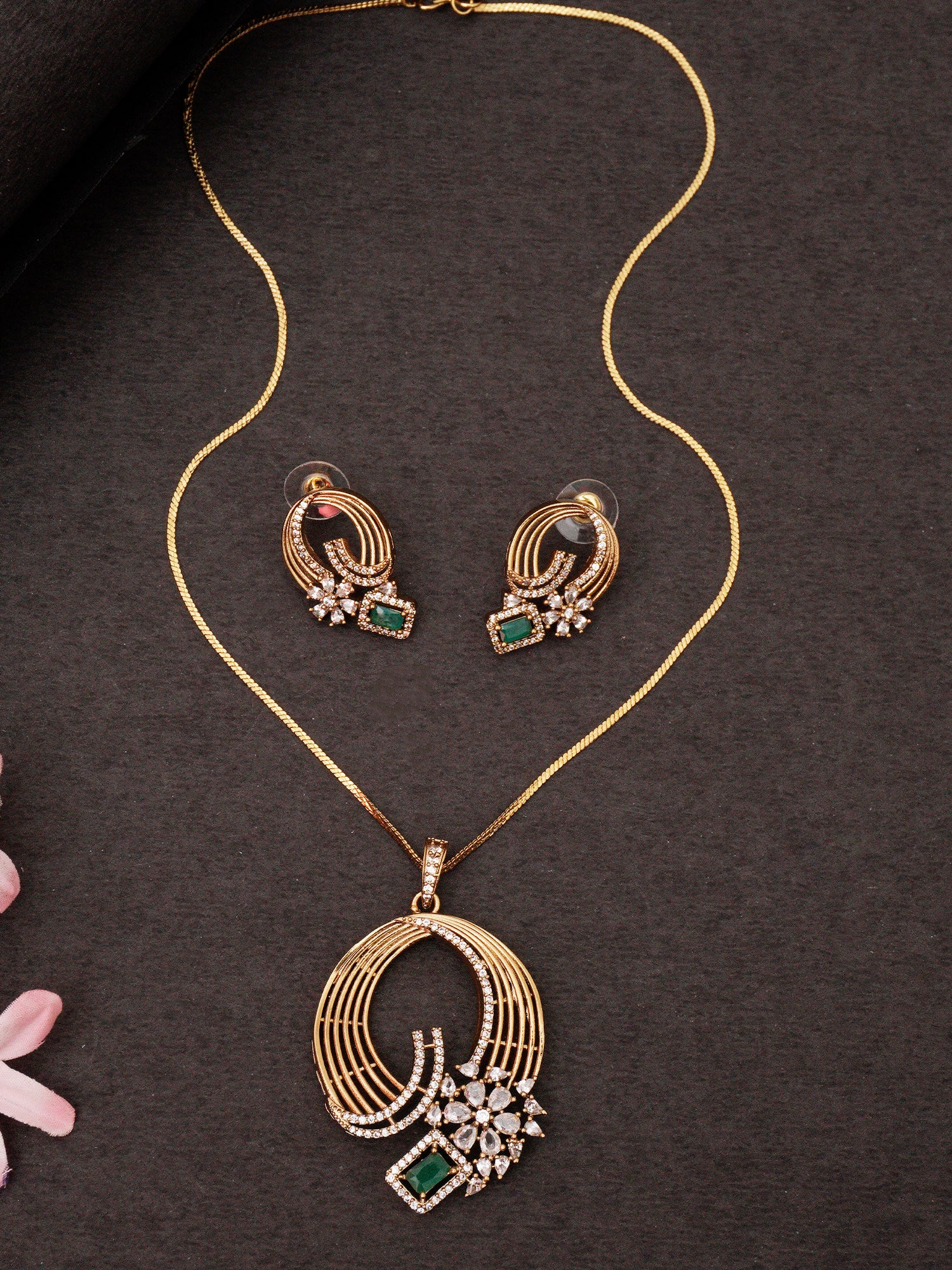 This elegant 24K gold-plated jewelry set combines timeless beauty with a touch of modern sophistication. Featuring sparkling zircon stones and a stunning green stone centerpiece, the set includes a necklace and matching earrings that radiate luxury. The vibrant green stone adds a pop of color, while the brilliant zircon stones provide a dazzling sparkle. Perfect for both formal occasions and special events, this set is designed to make you feel like royalty. The high-quality 24K gold plating ensures a rich, radiant finish, making this jewelry set a must-have for anyone seeking elegance and glamour.