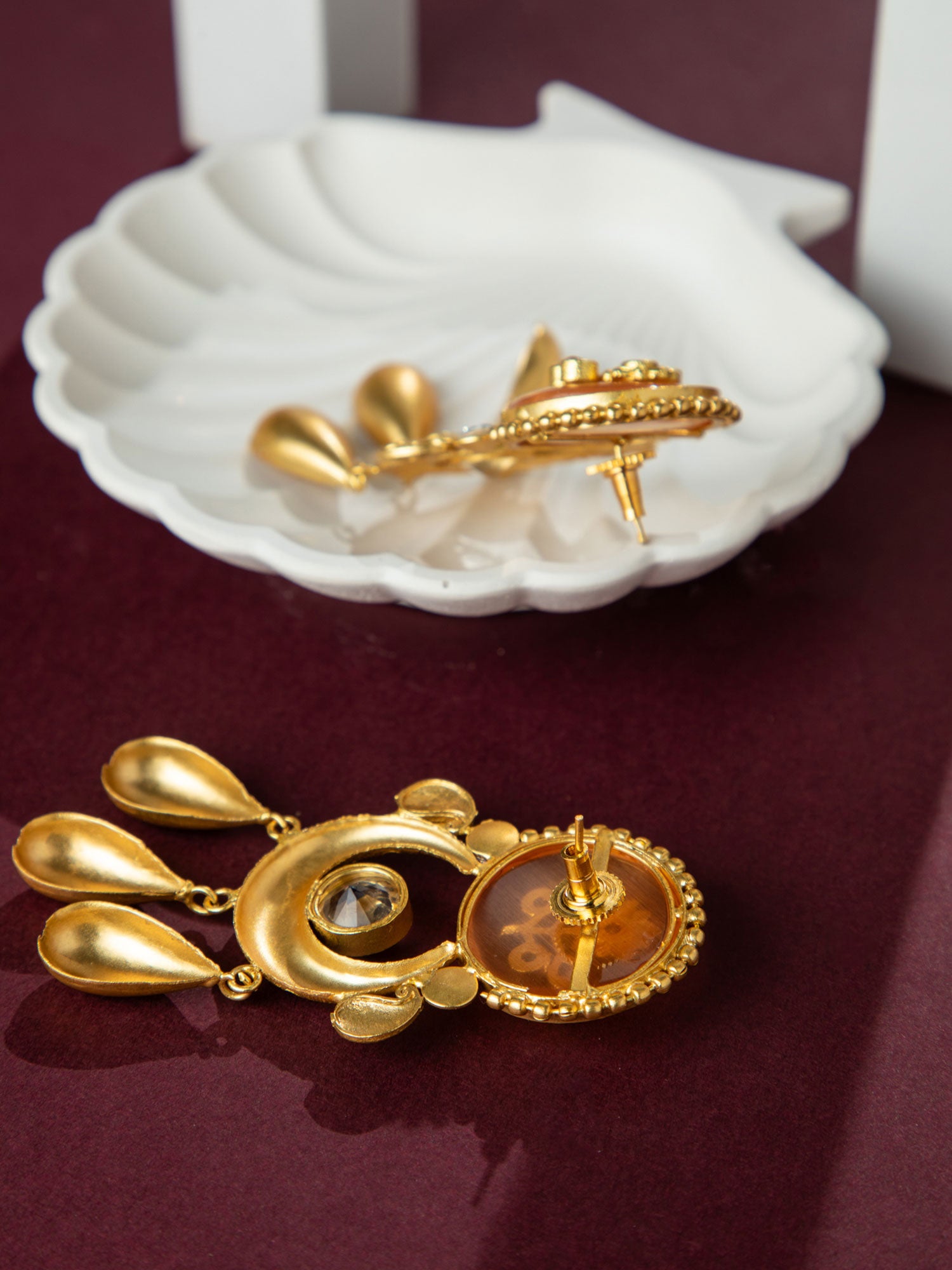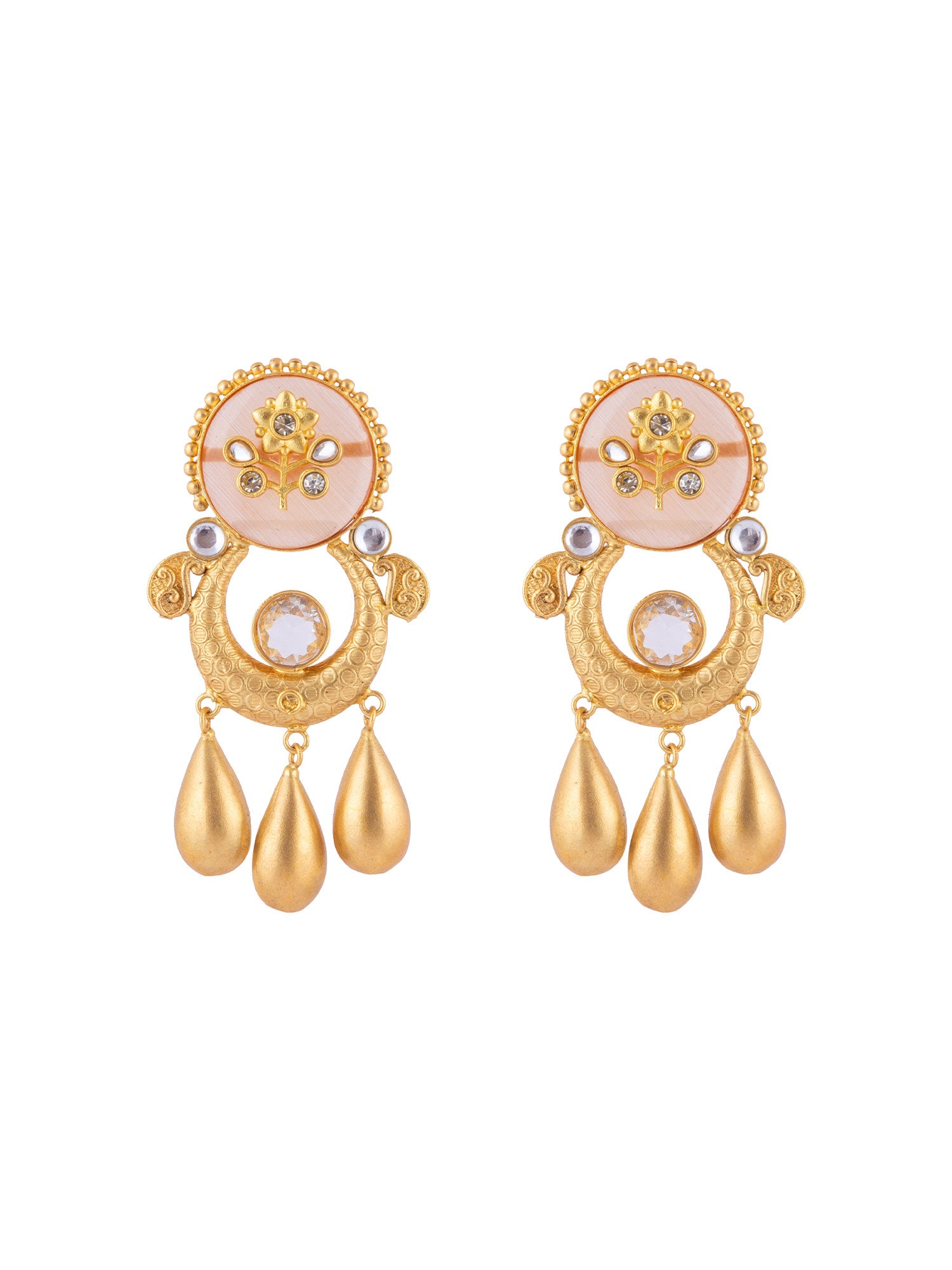 24K Matte Gold Plated Orange and White Chandbali Earrings with Kundan