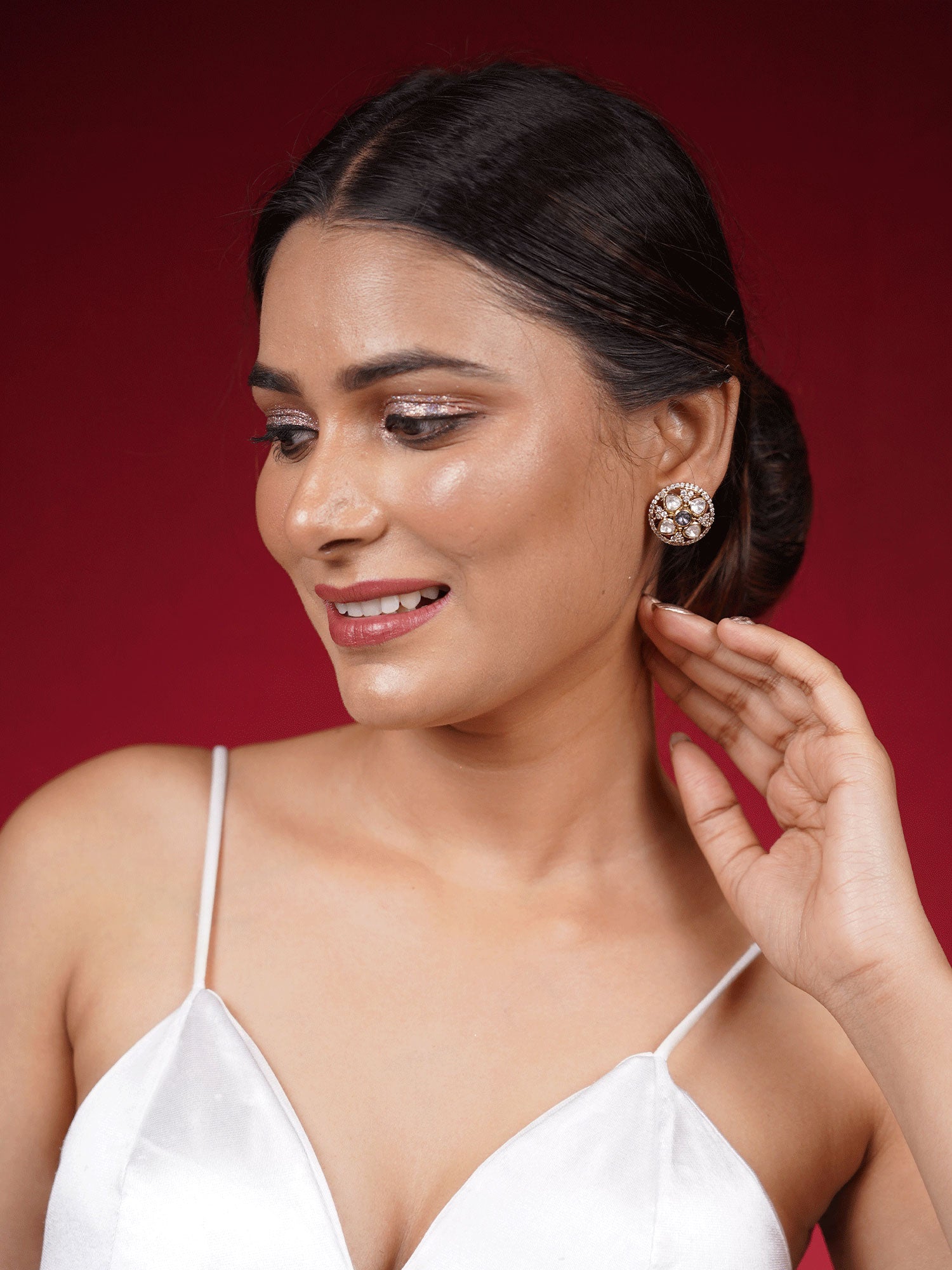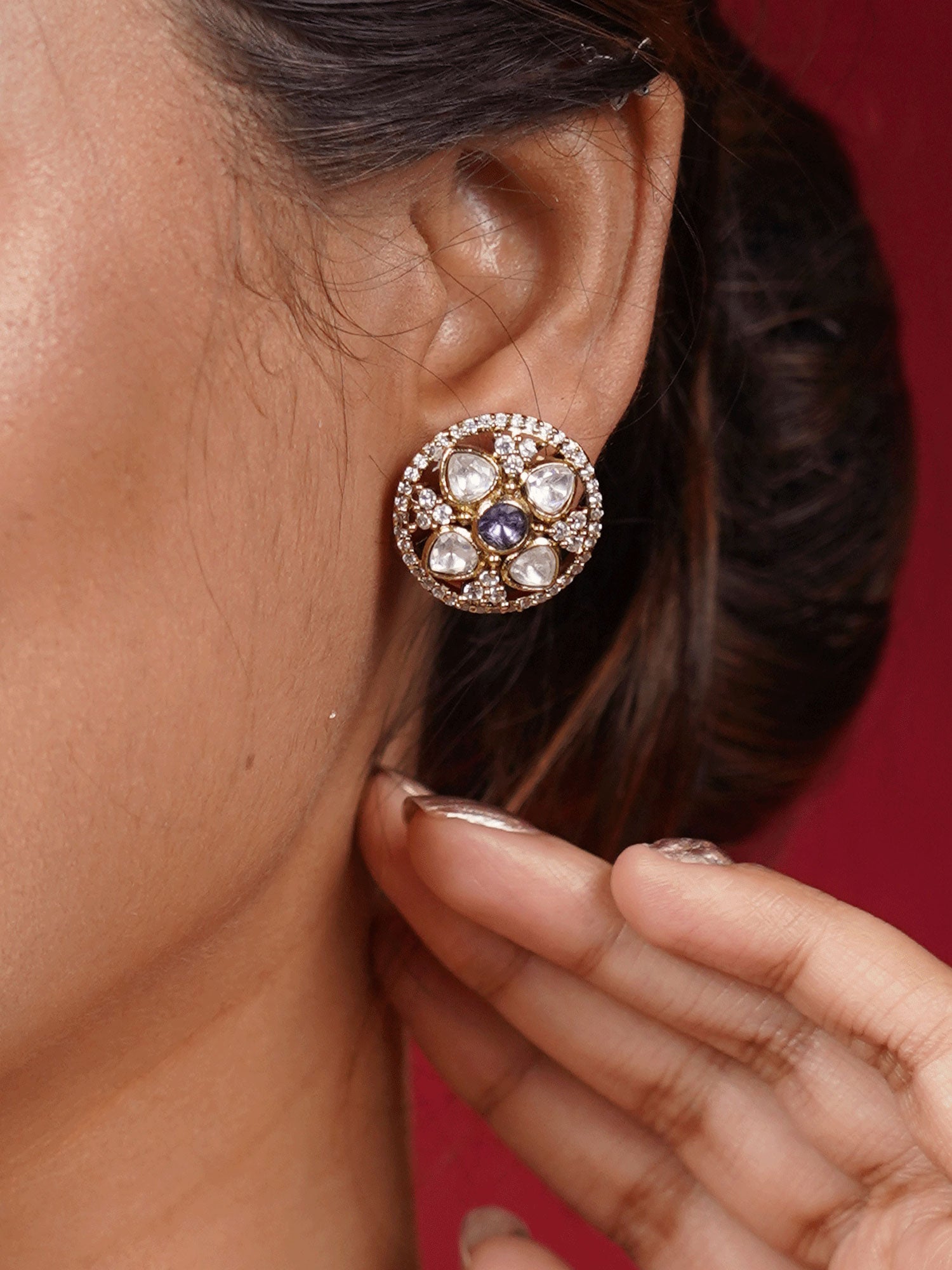Pair these traditional gold-plated stud earrings with a silk saree or an embroidered kurta for a graceful ethnic look. Keep your hair in a neat bun or soft waves to highlight their elegance. Complete the ensemble with a delicate gold bangle or a statement ring for a refined, timeless appeal.