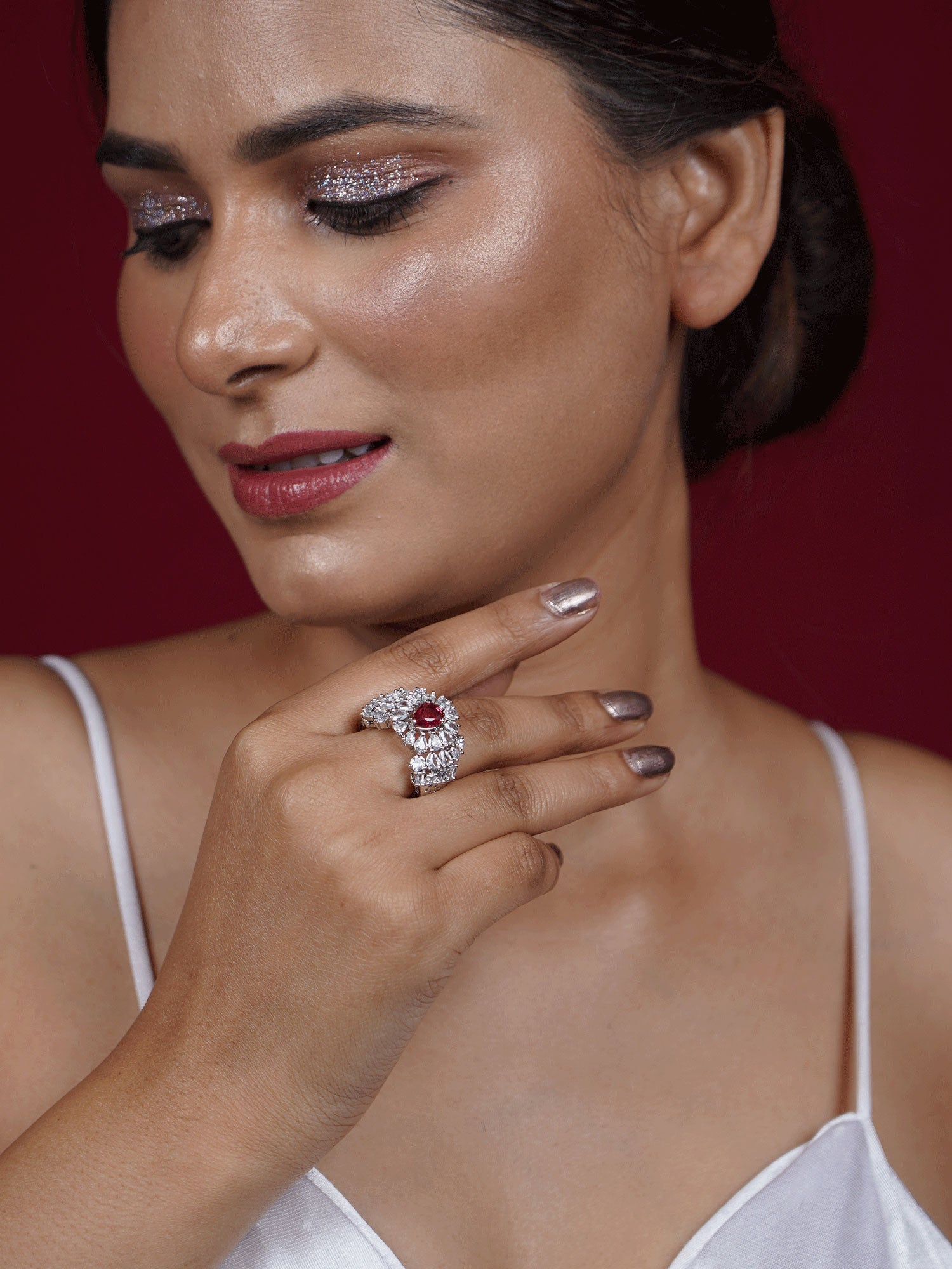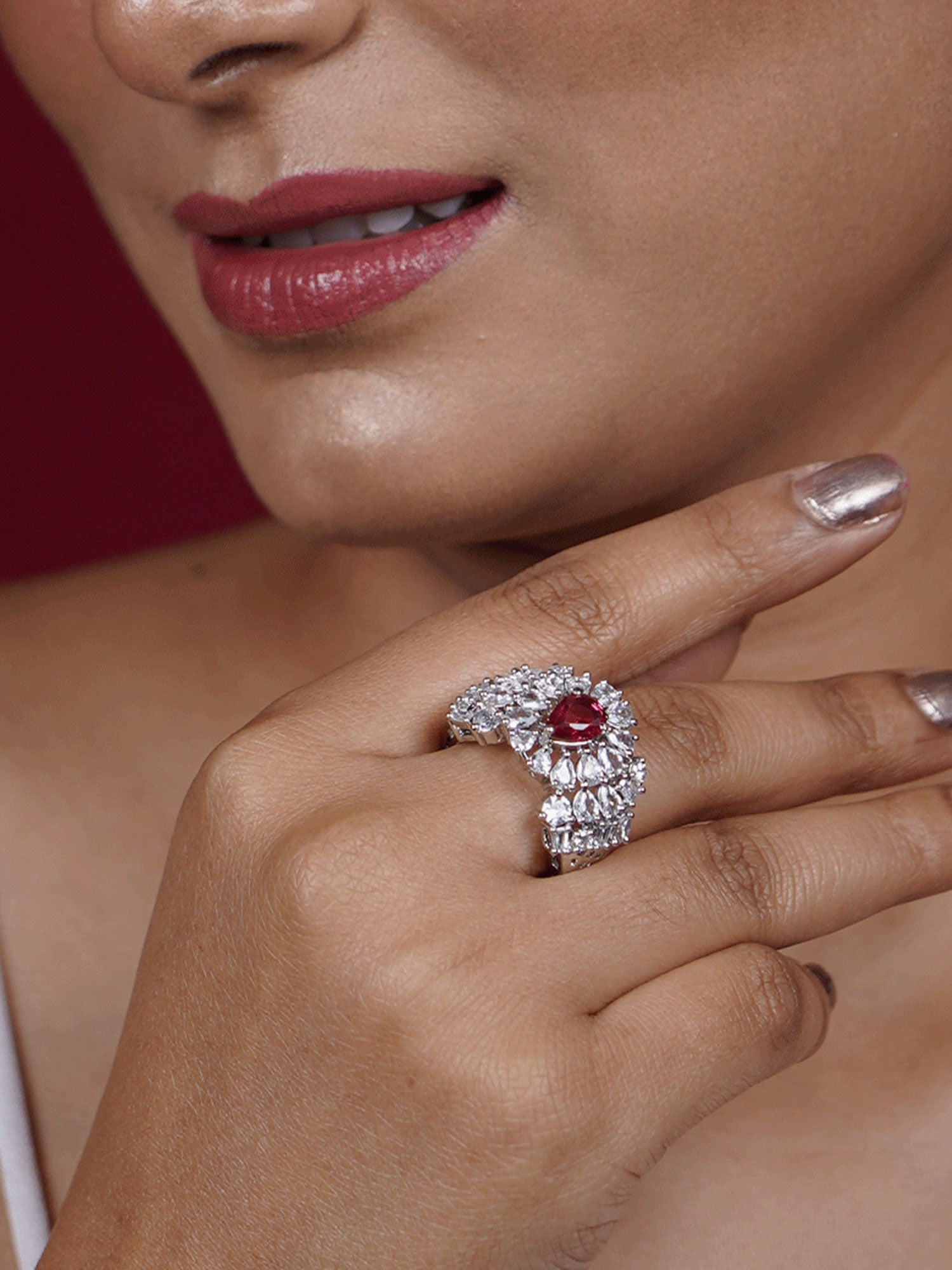 Let this luxury American diamond ring with a rose gold stone take center stage by pairing it with a soft pastel or metallic outfit. Complement its elegance with rose gold accessories, such as a delicate bracelet or stud earrings. For an effortlessly chic look, keep your nails in a neutral or blush-toned shade to enhance the ring’s sophisticated appeal.