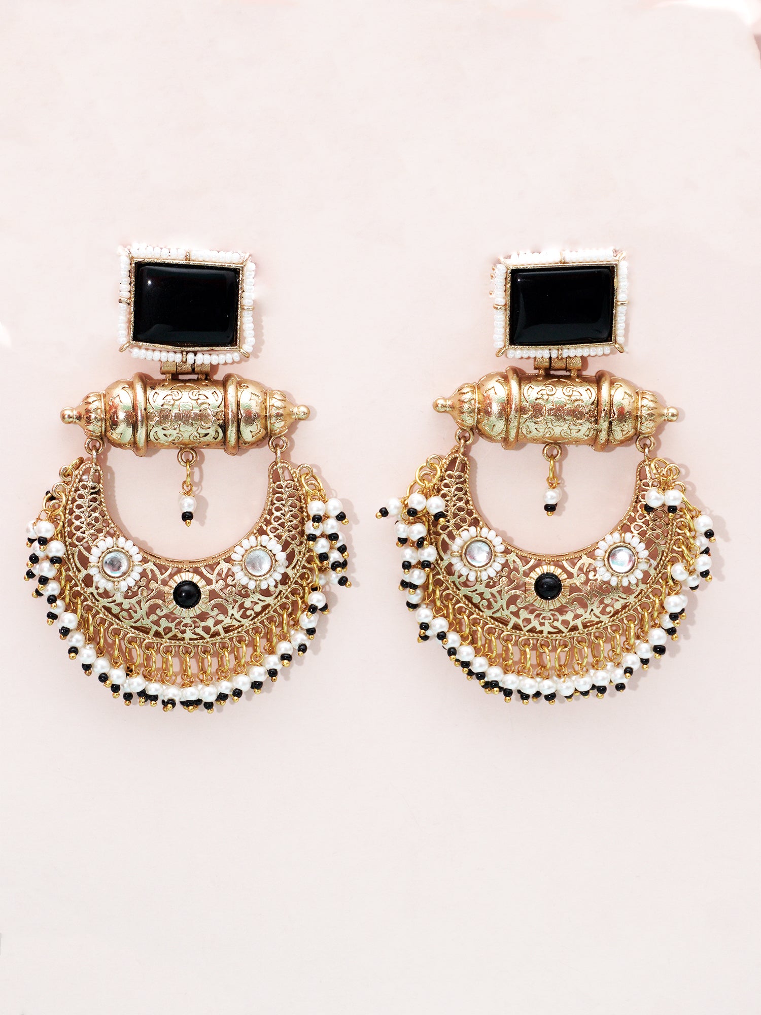 Embrace timeless elegance with these exquisite antique gold-plated Chaandbaali earrings, crafted to reflect the beauty of traditional artistry. Featuring a graceful crescent design, these earrings are adorned with delicate pearls and striking black stones, adding a regal touch to your ensemble. The intricate detailing and antique finish make them a perfect choice for festive occasions, weddings, and cultural celebrations. Pair them with ethnic attire to exude grace and sophistication with every wear.