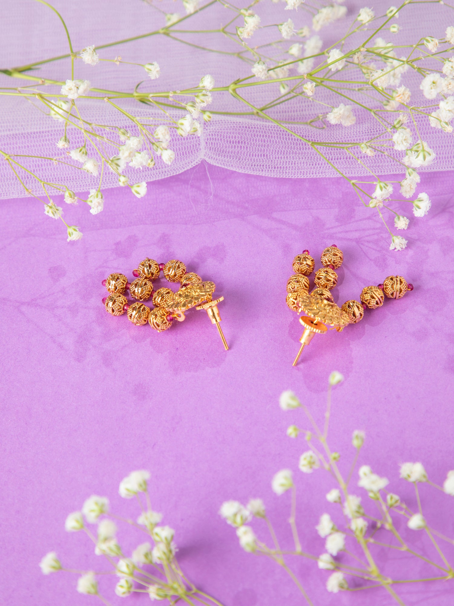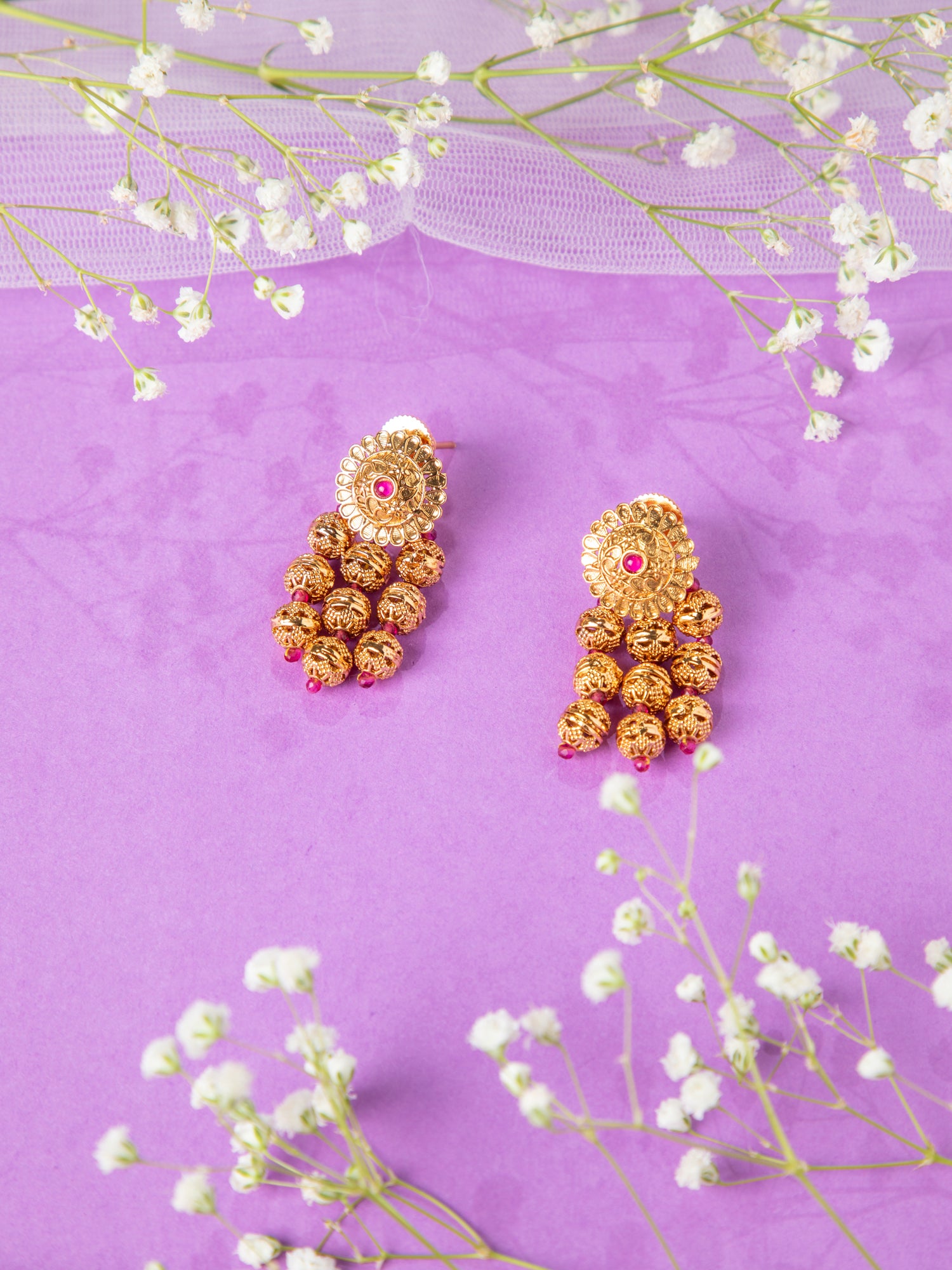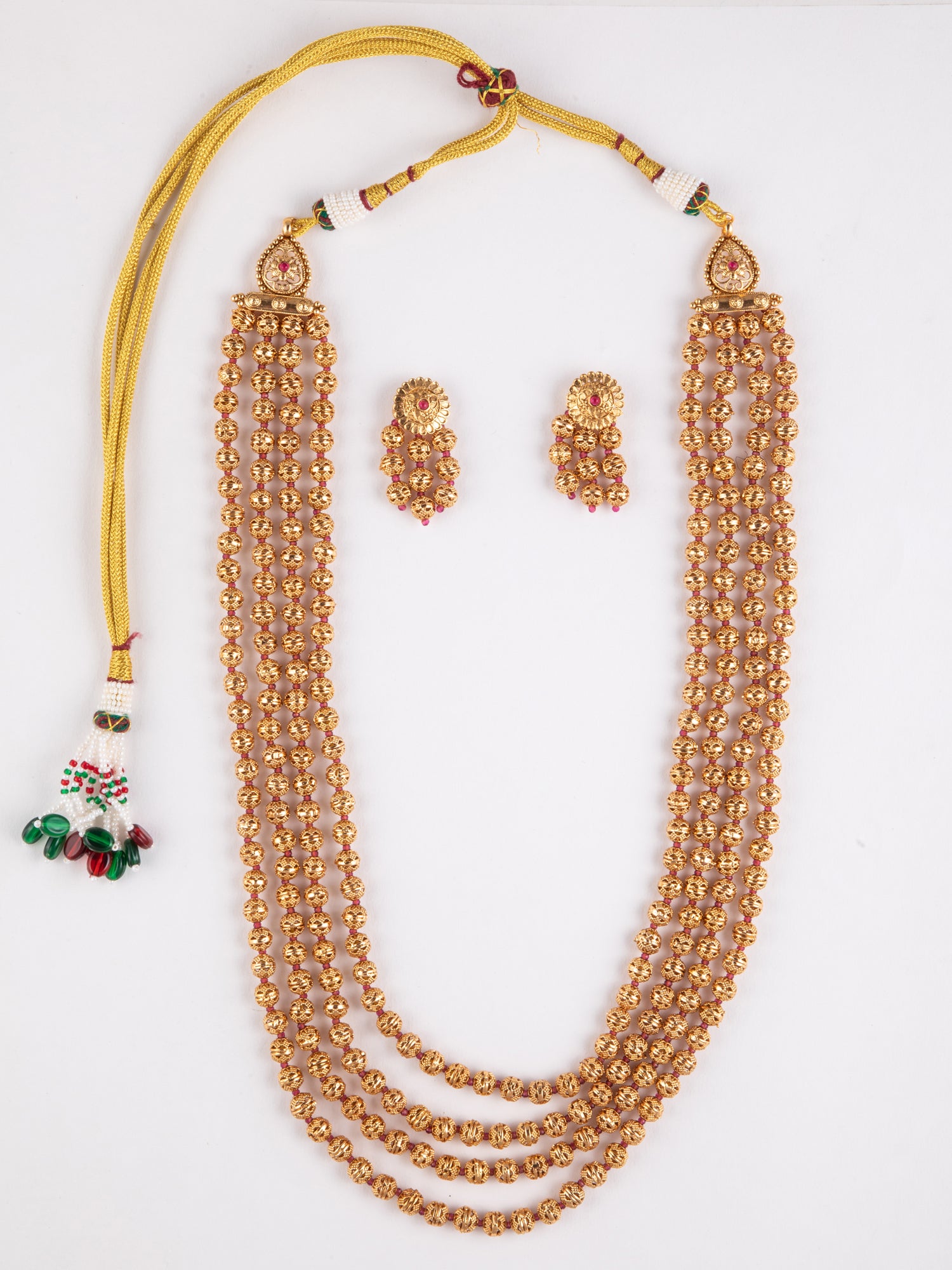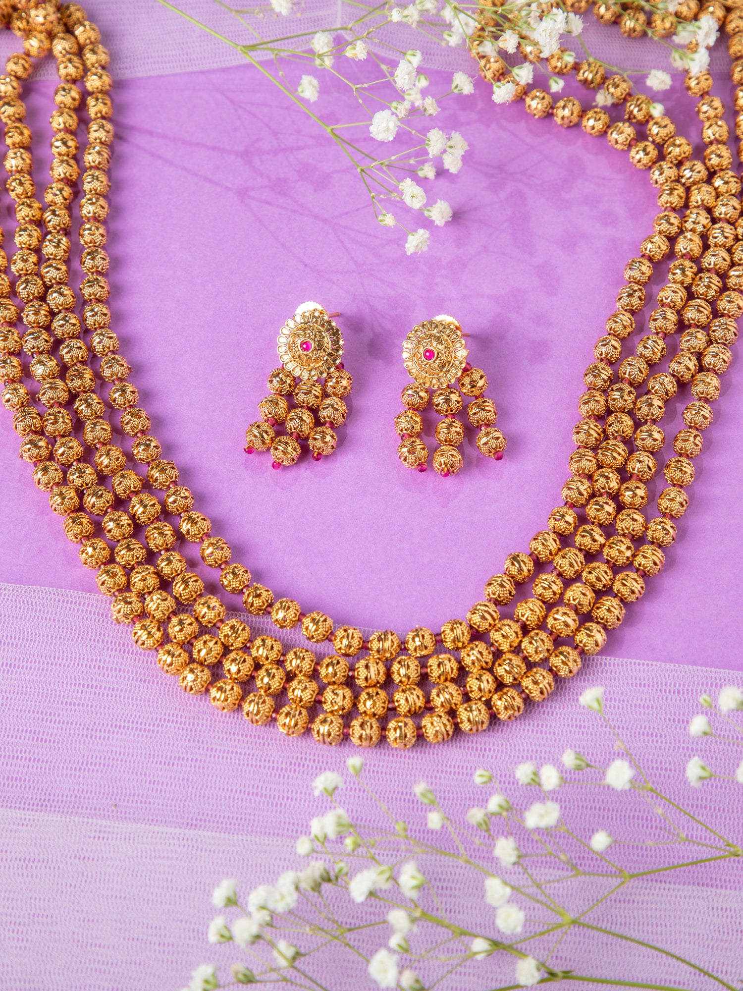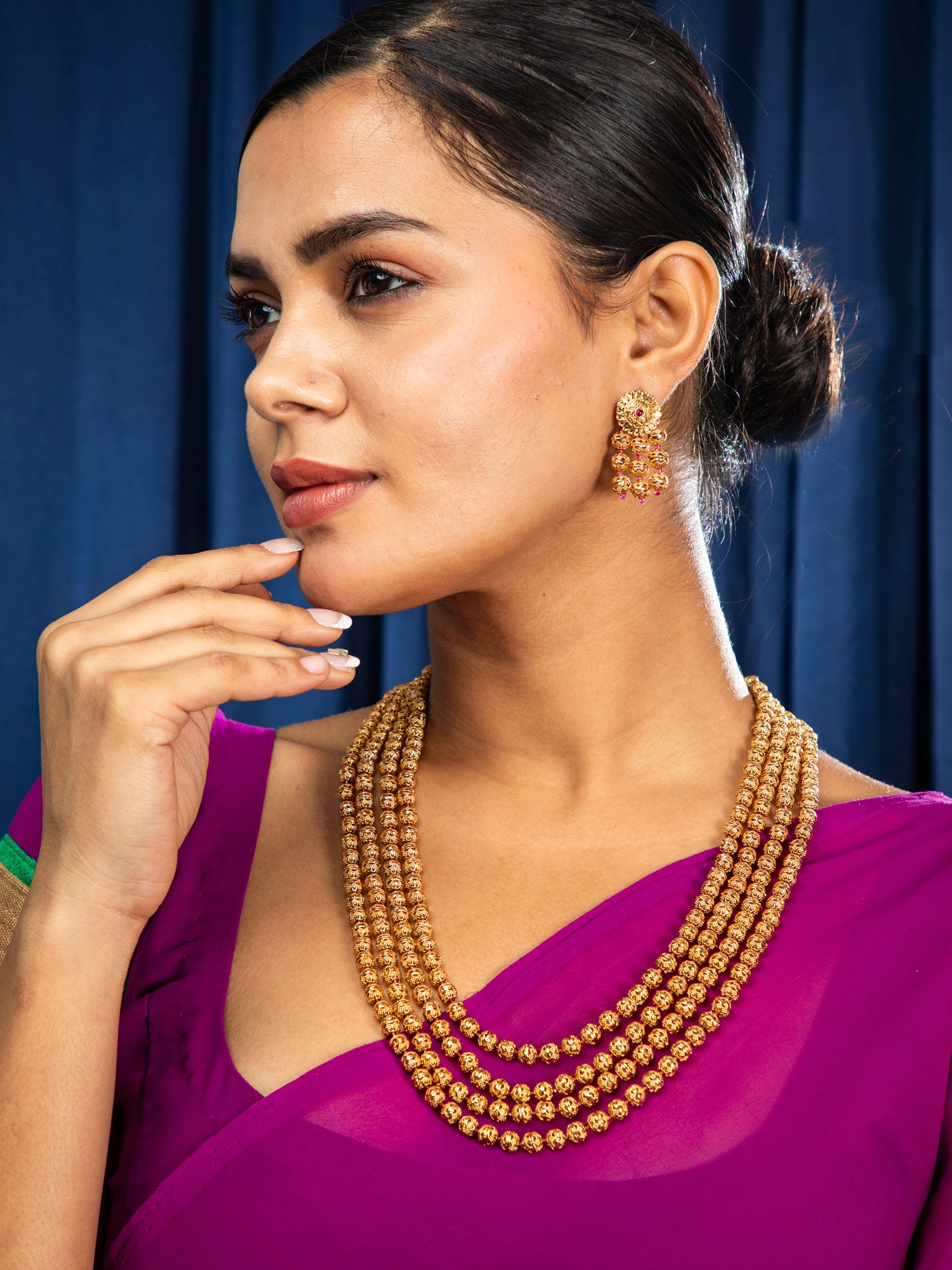 Enhance your ethnic charm with this 24K gold plated multi chian necklace featuring antique style golden bead chains. Paired with matching 3 chain bead earrings, it’s a perfect traditional design for festive occasions.