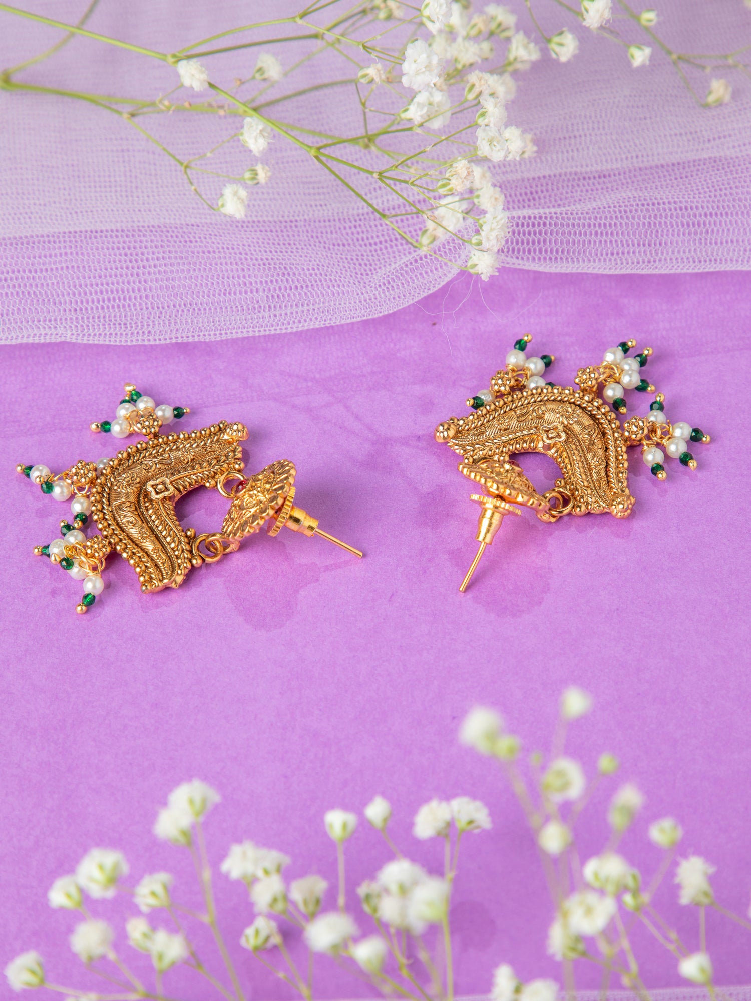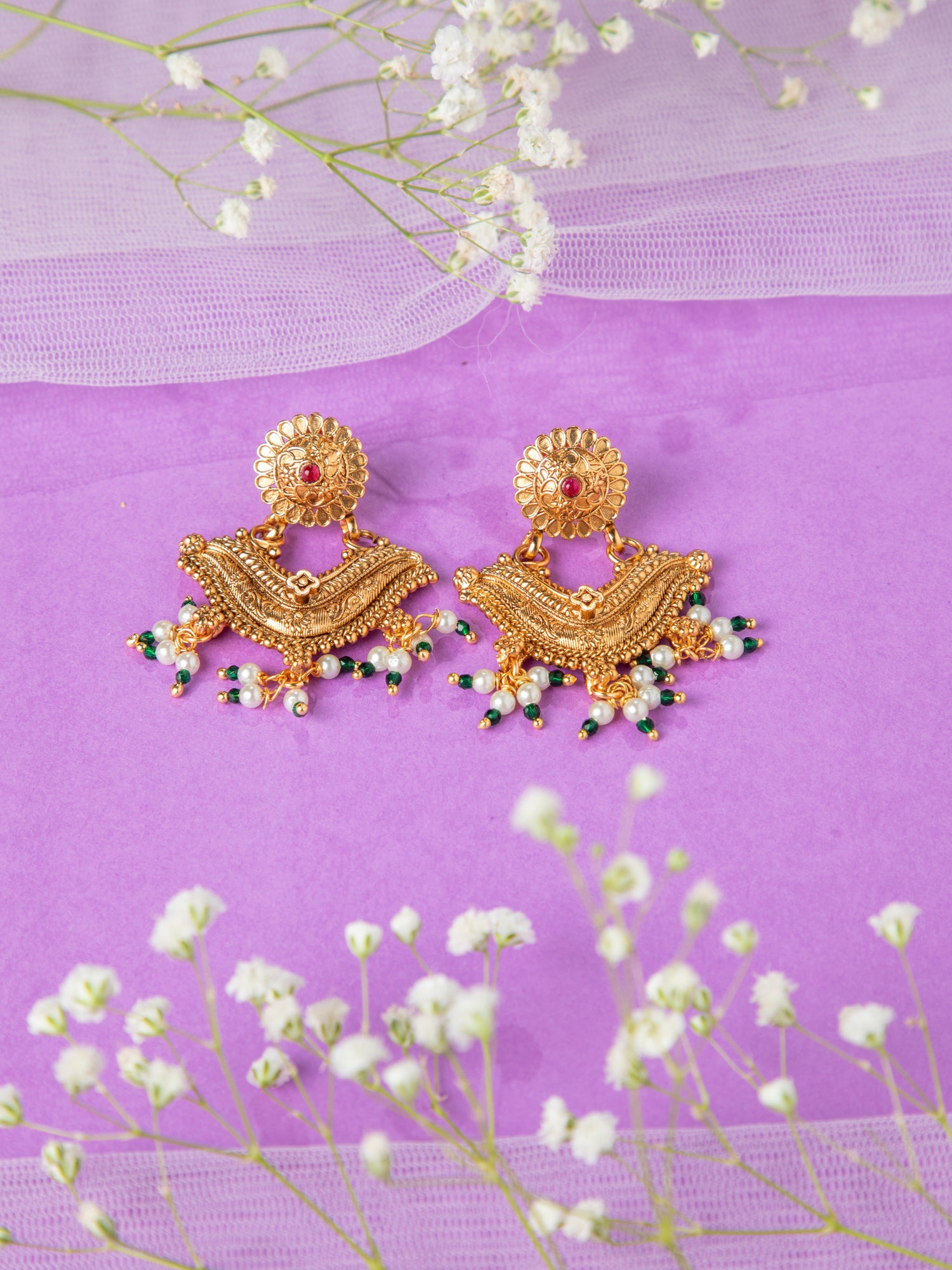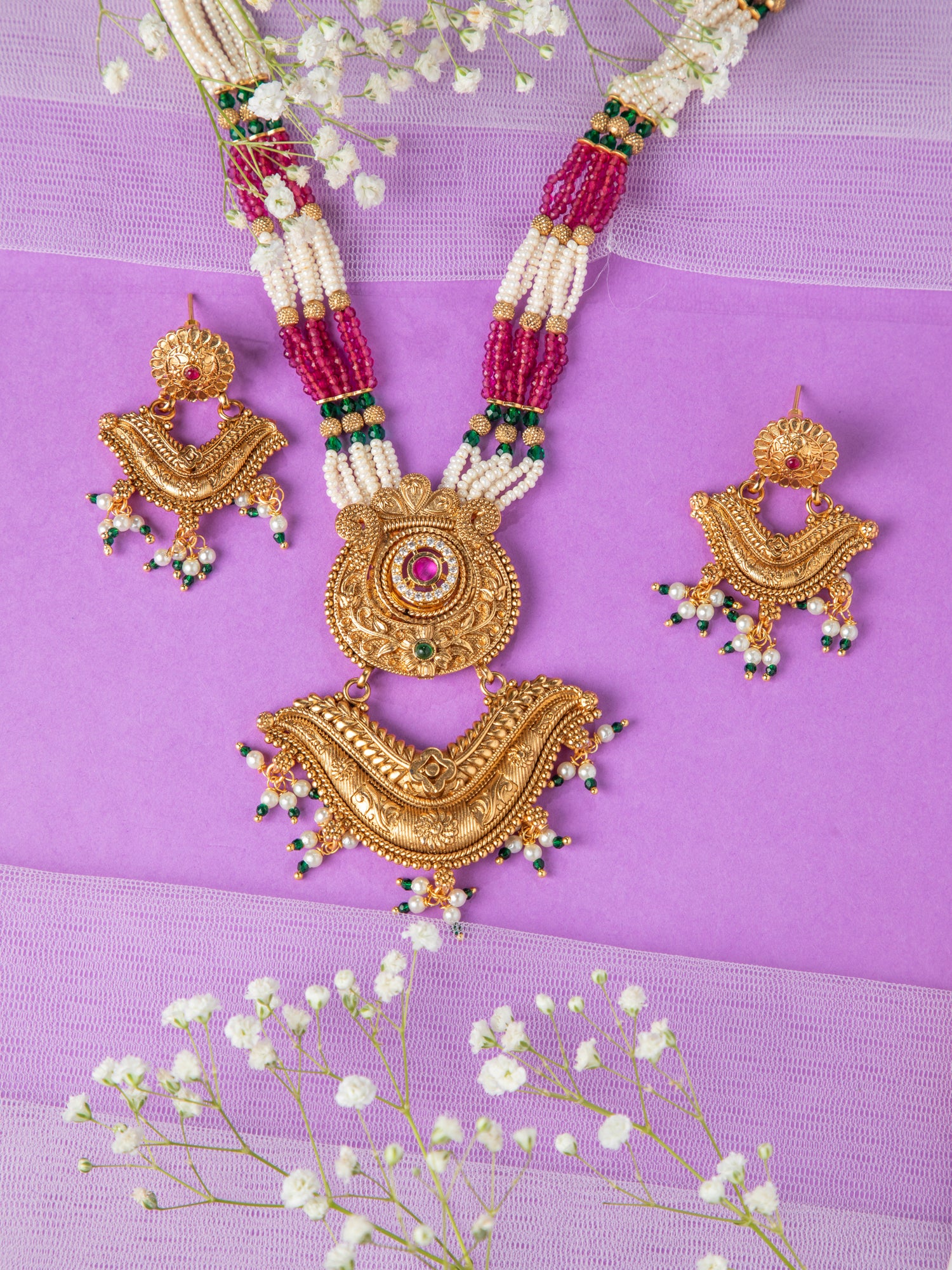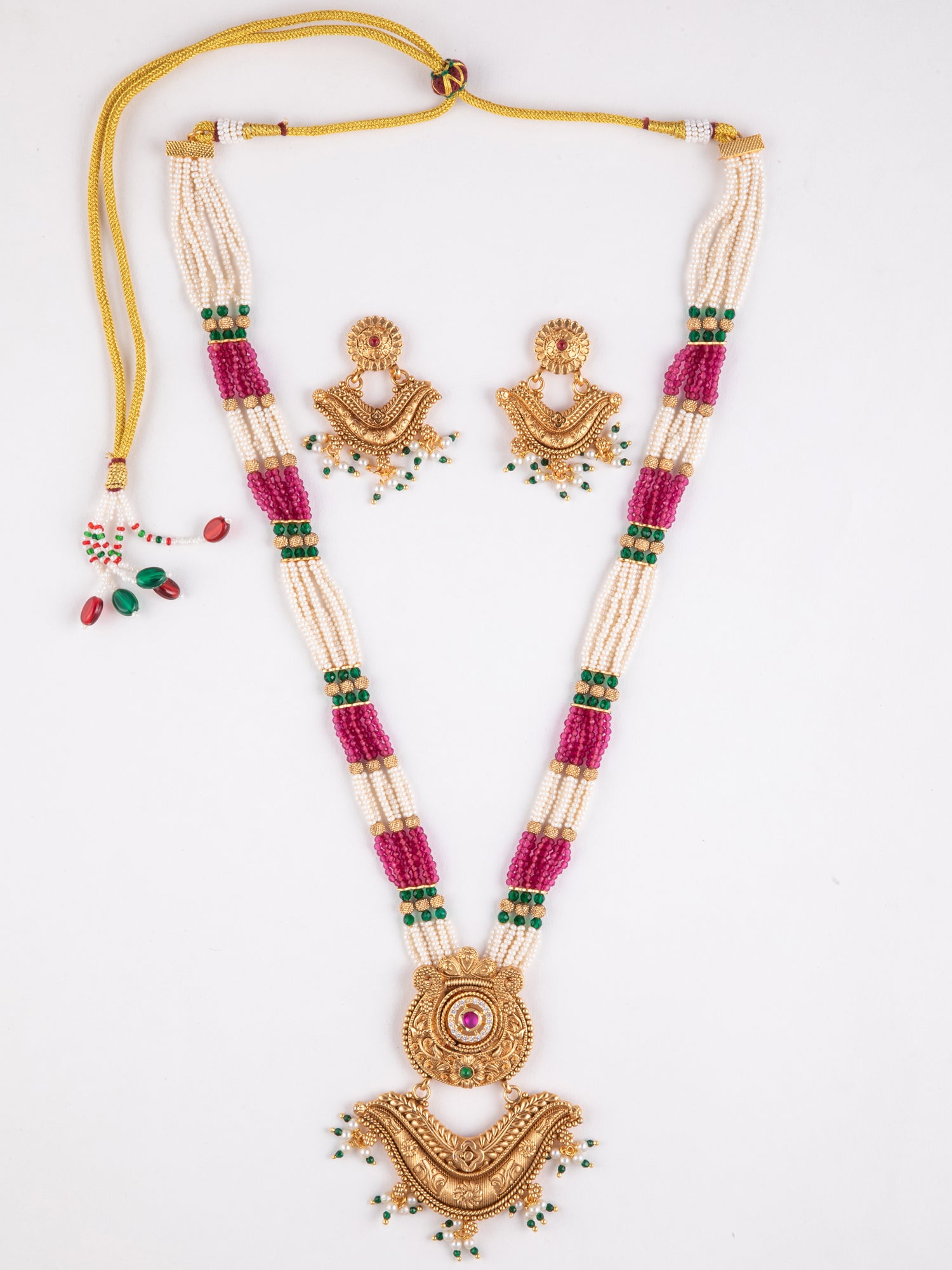 Celebrate tradition with this 24K gold plated multi layered pearl necklace featuring a ruby red pendant surrounded by white CZ stones. Paired with emerald studded jhumka earrings for a mesmerizing festive look.