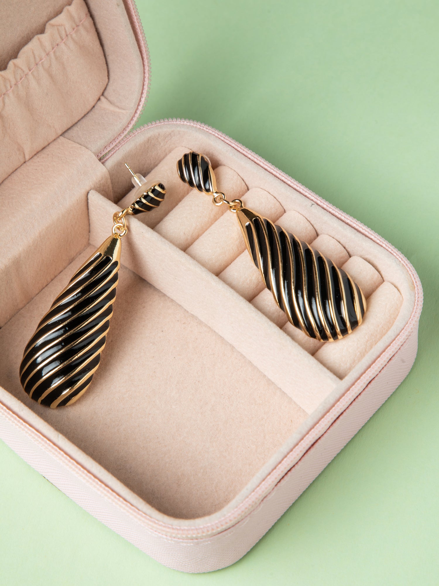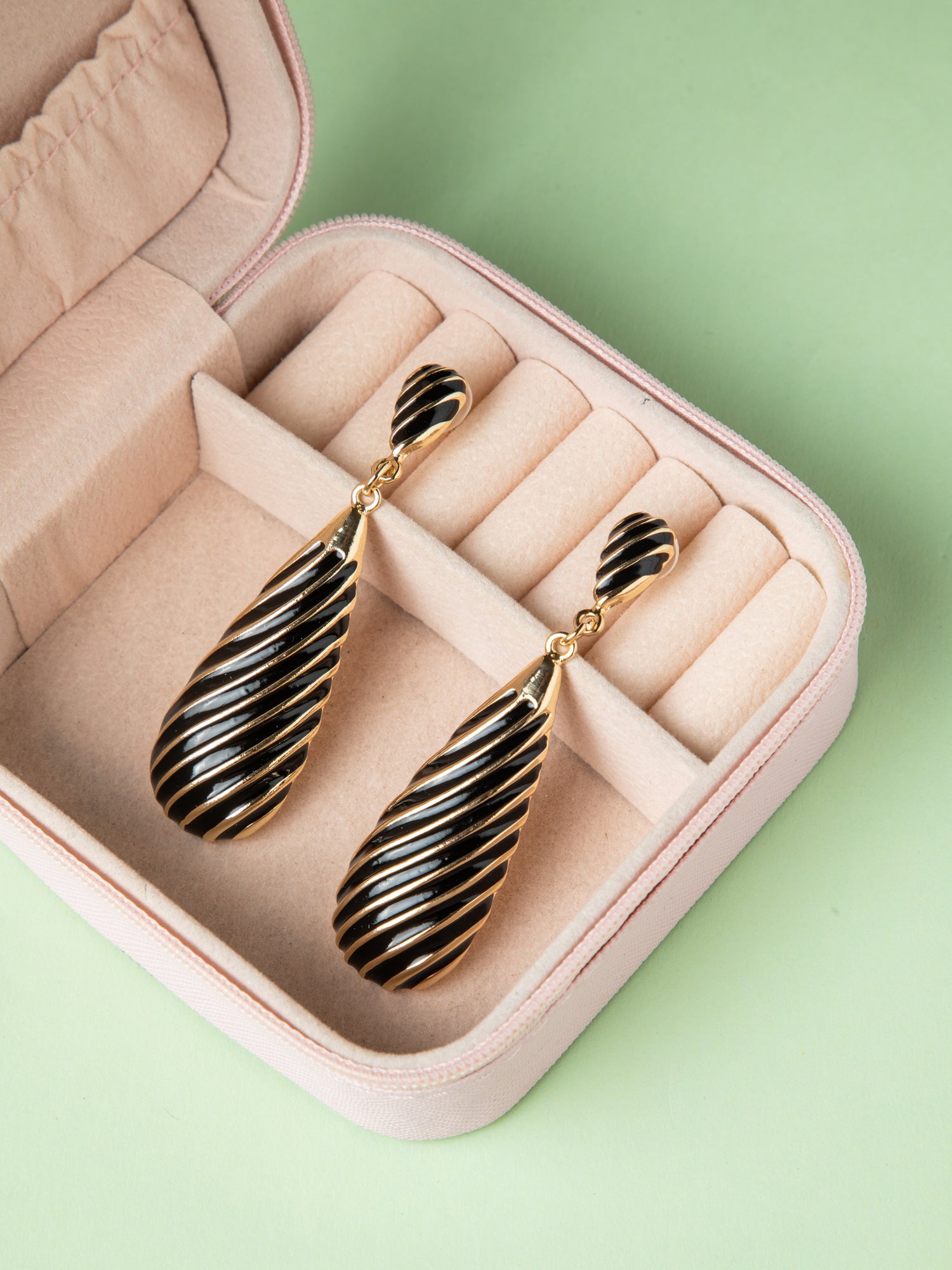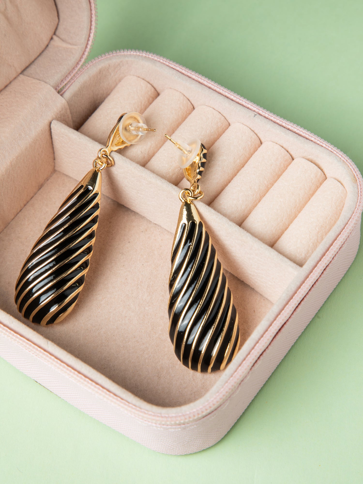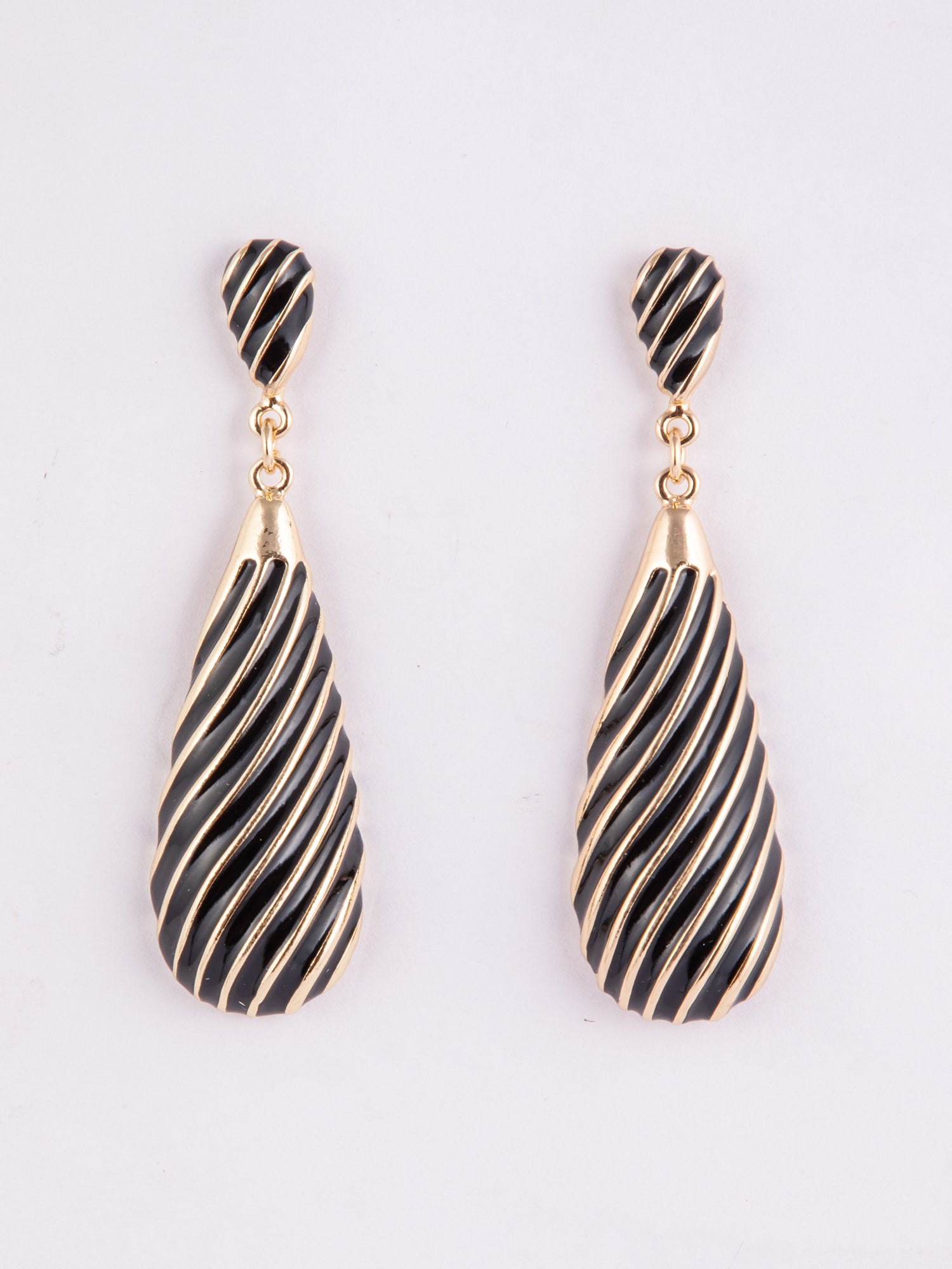 Make a bold statement with these long gold-plated water drop earrings, featuring an elegant black and golden print pattern on top. A stunning new design perfect for festive or evening wear.