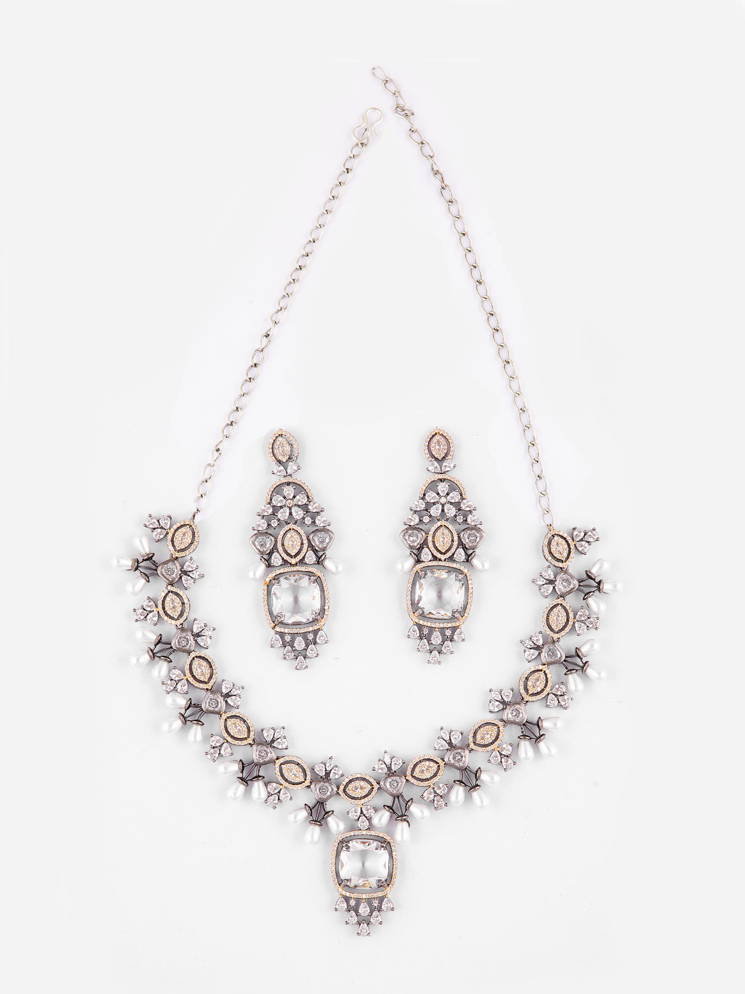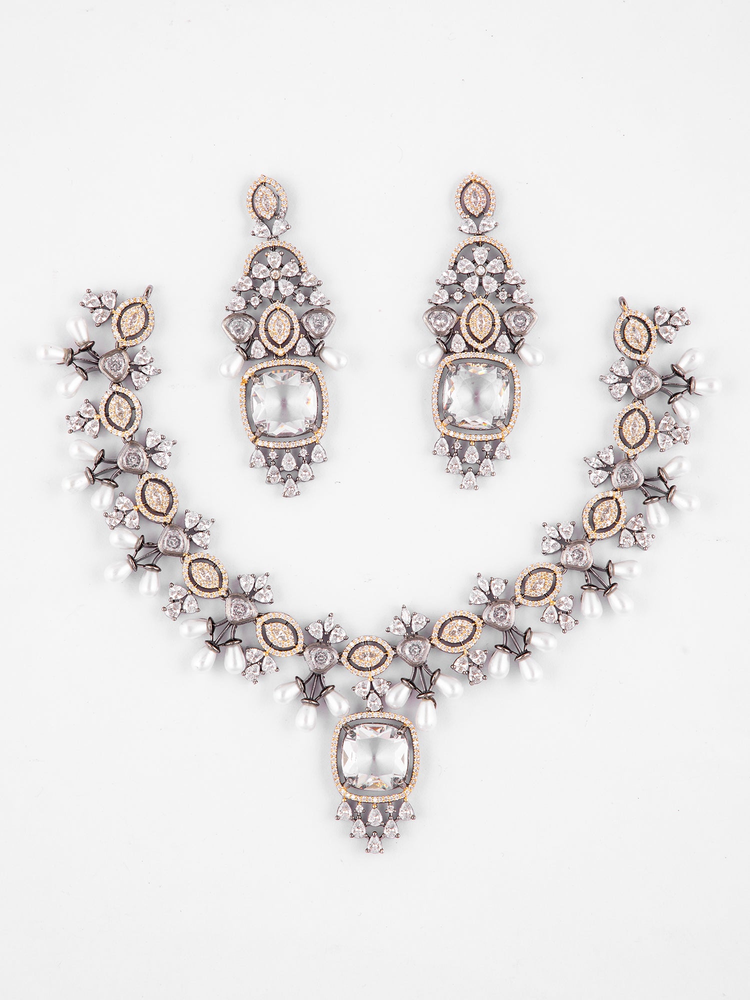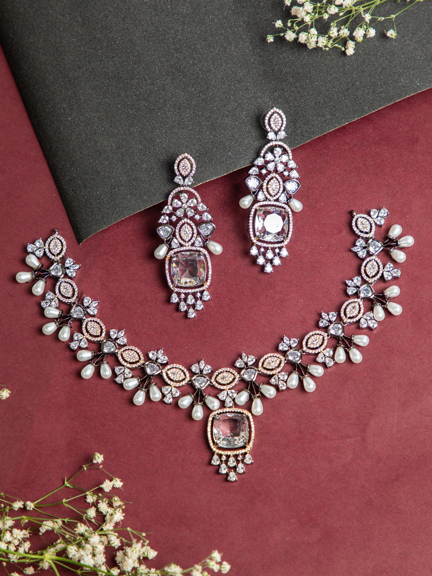Black Rhodium and Rose Gold Plated Necklace Set with Earrings features a mesmerizing design with white CZ, AD stones, and faux pearls. The pendant showcases a large white stone surrounded by AD stones. Perfect for ethnic and festive occasions.