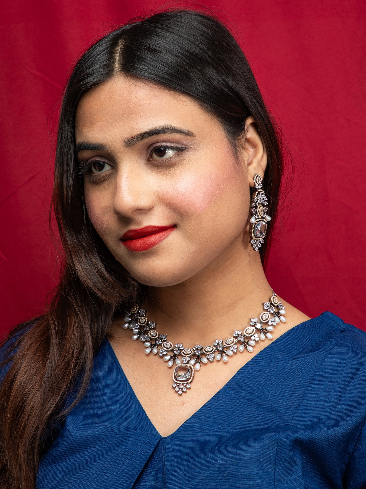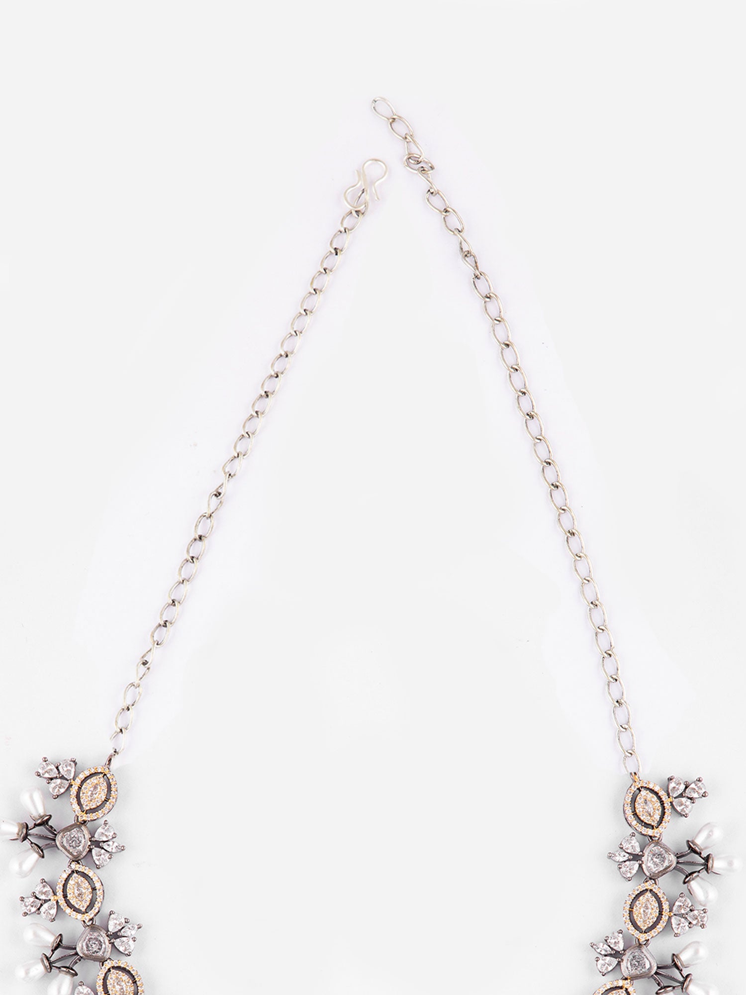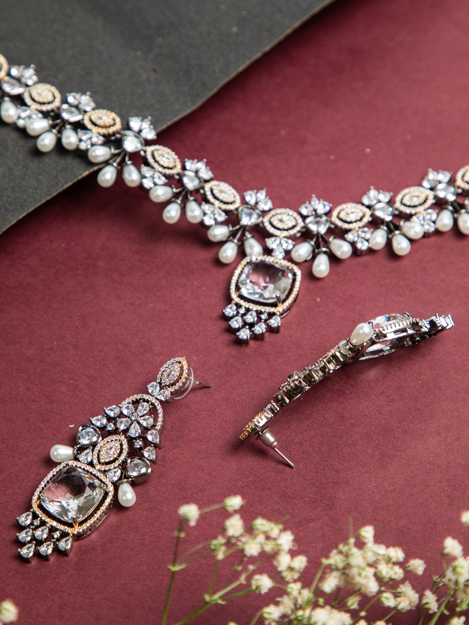 Black Rhodium and Rose Gold Plated Necklace Set with Earrings features a mesmerizing design with white CZ, AD stones, and faux pearls. The pendant showcases a large white stone surrounded by AD stones. Perfect for ethnic and festive occasions.