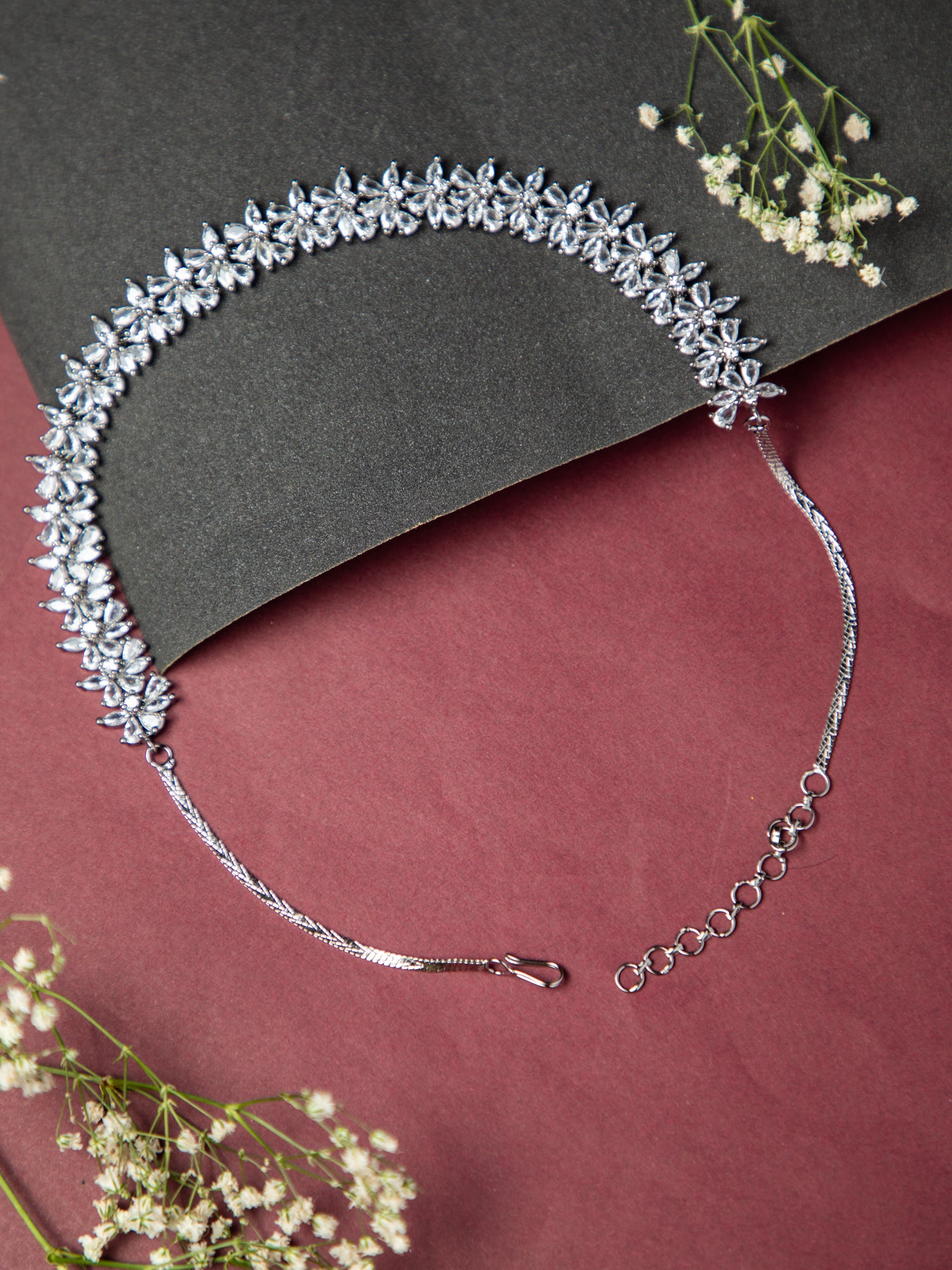 Pair with a solid-colored saree or gown to highlight the floral design and sparkle of the white stones for a graceful festive look.