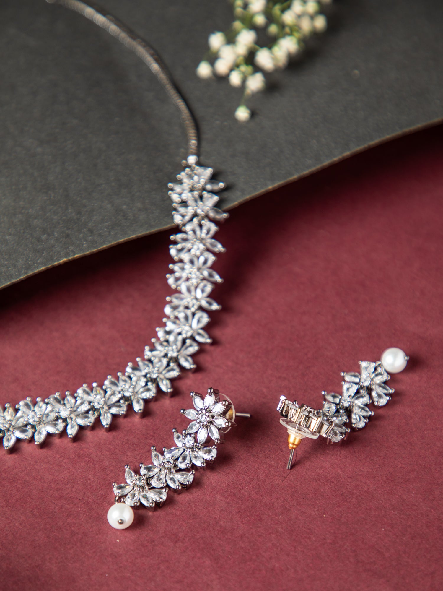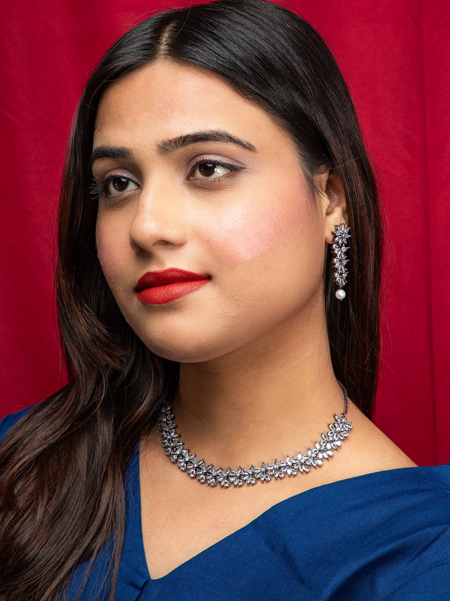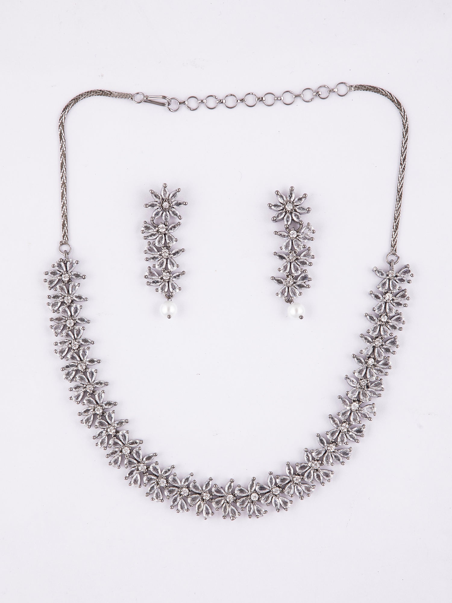 Black Rhodium Plated Necklace Set with Earrings featuring a stunning floral design crafted with white CZ, AD stones, and faux pearls. The long earrings complement the elegant set, making it a perfect choice for ethnic and festive wear with unique charm.