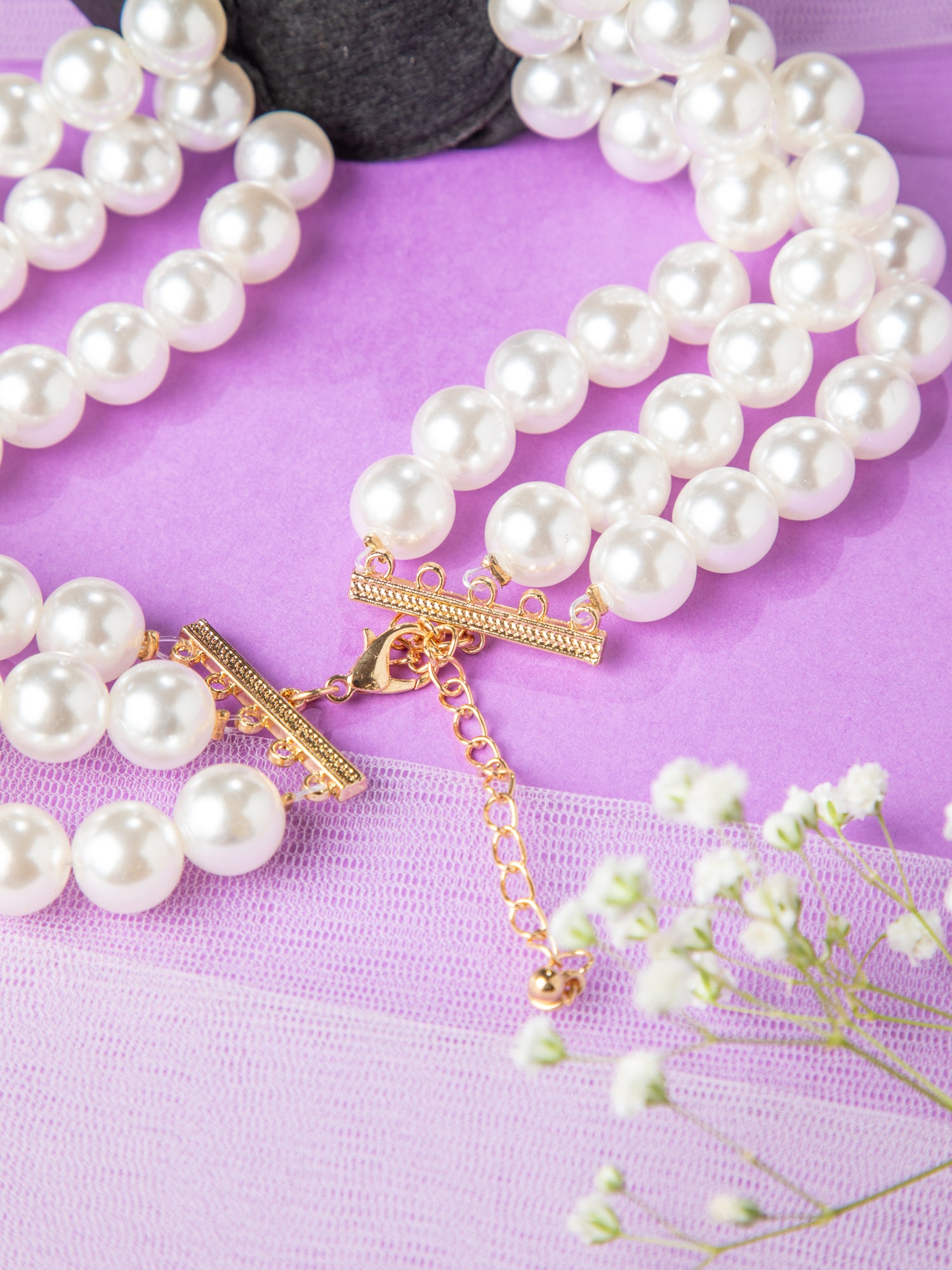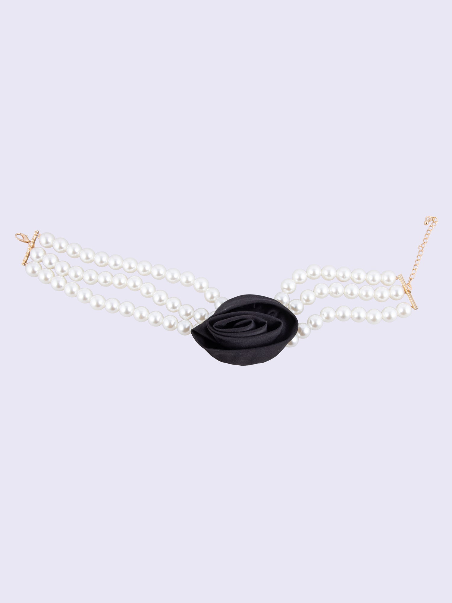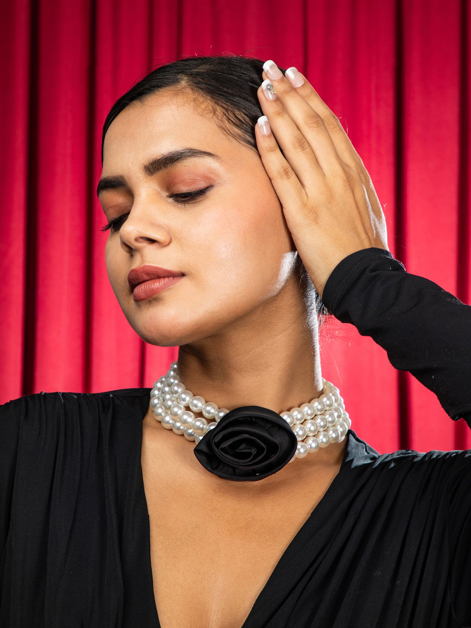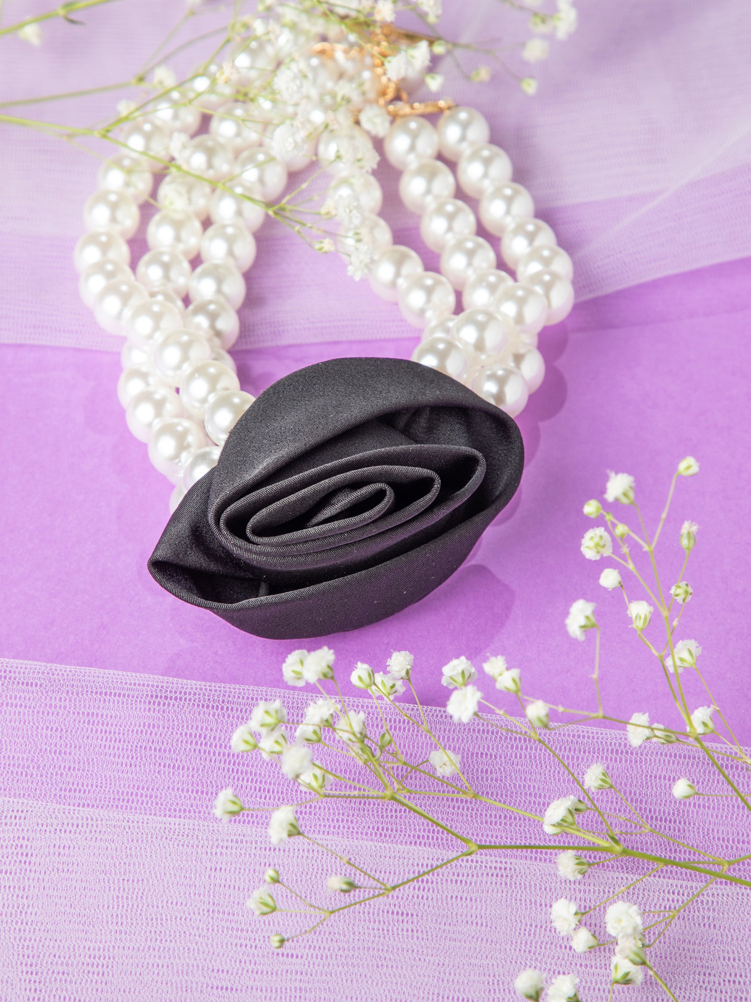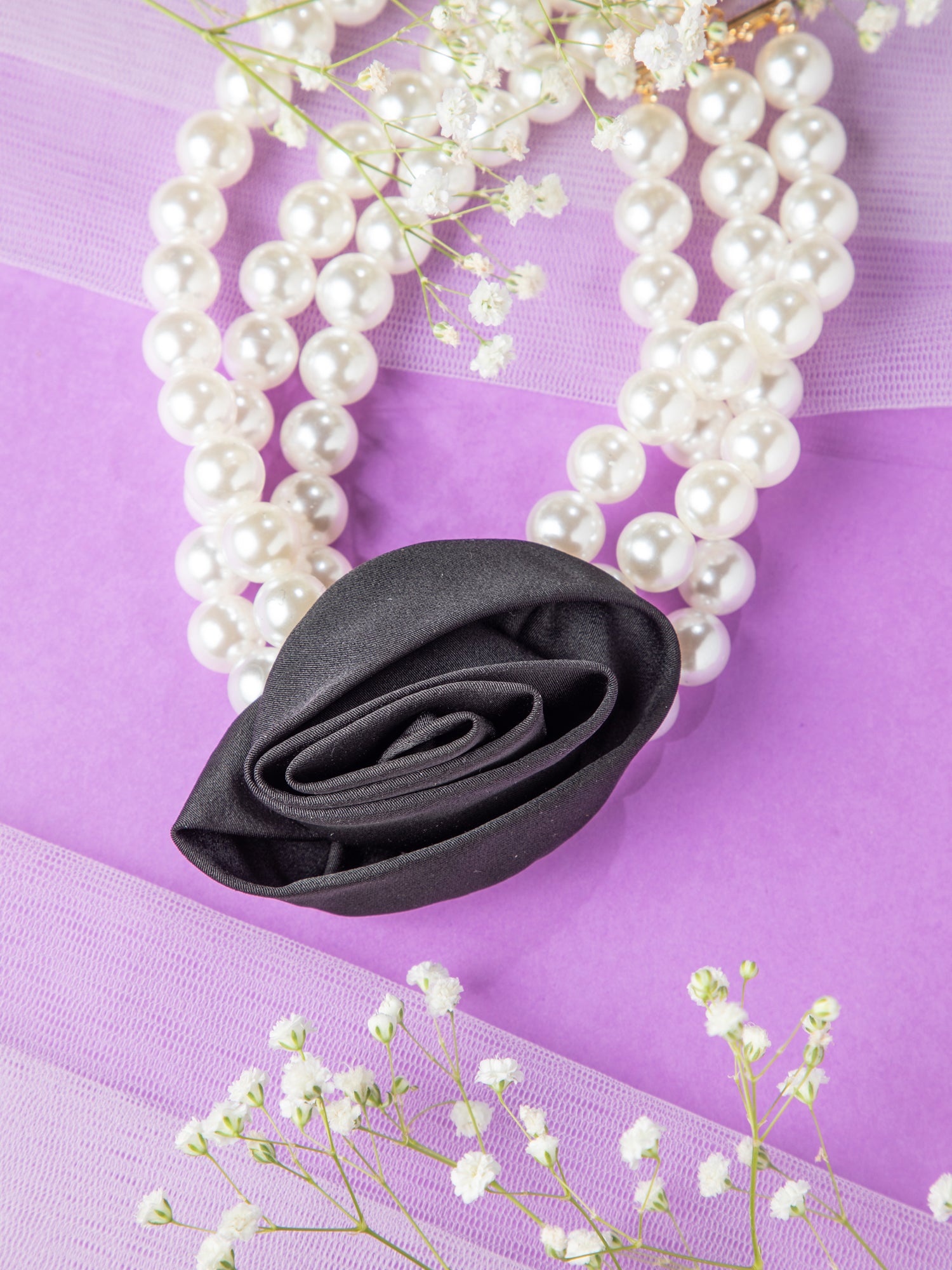 Make a striking statement with this triple layered big white pearl necklace, featuring a bold black rose pendant. A must have latest design, perfect for festivals, functions, or party wear.