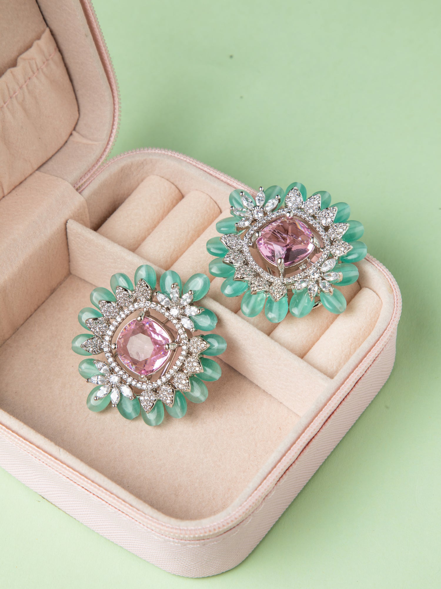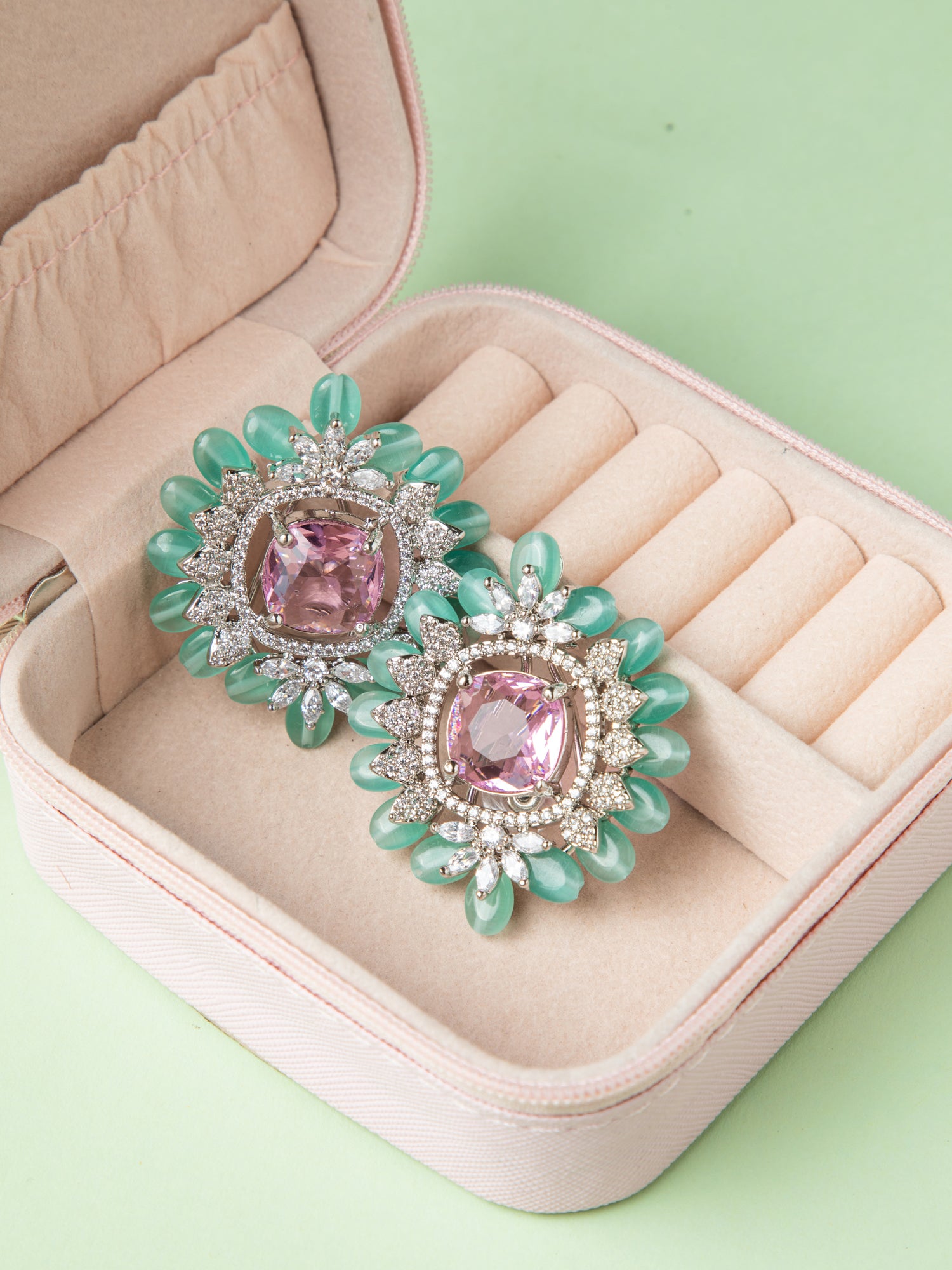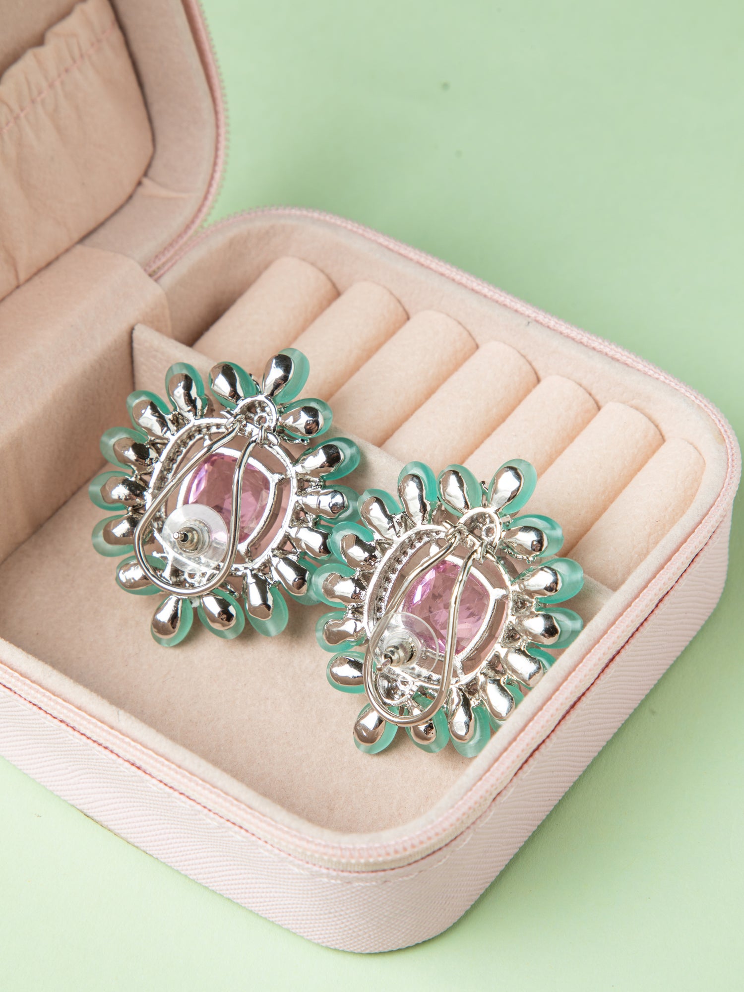 Pair with a floral or pastel outfit to enhance the delicate pink and green accents in the earrings.