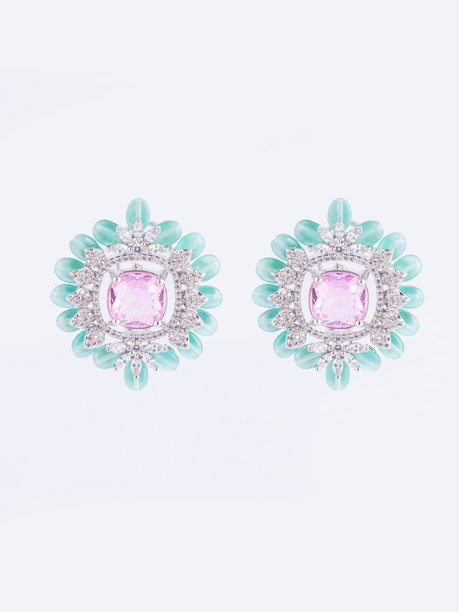 Grace your look with these rhodium plated silver American Diamond earrings, featuring a floral design with sparkling white AD stones, a pink translucent centerpiece, and green bead accents perfect for festive occasions.
