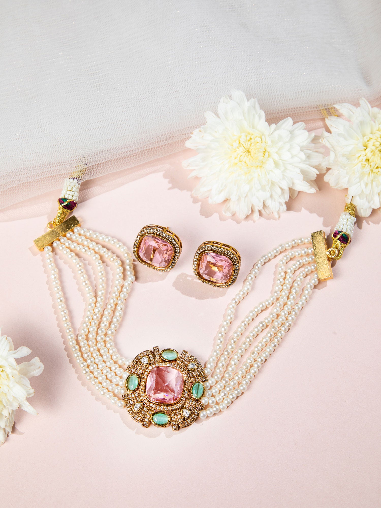 A luxurious multi-strand pearl choker featuring a central blush-pink gemstone framed by sage-green accents and golden detailing. Delicate matching earrings echo the soft pink hue for a cohesive, elegant set—ideal for bridal wear or upscale events. Keywords: pearl choker, blush pink gemstone, sage green accents, multi-strand.