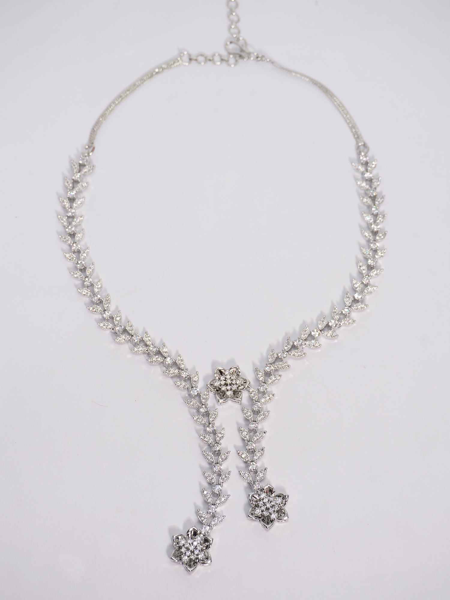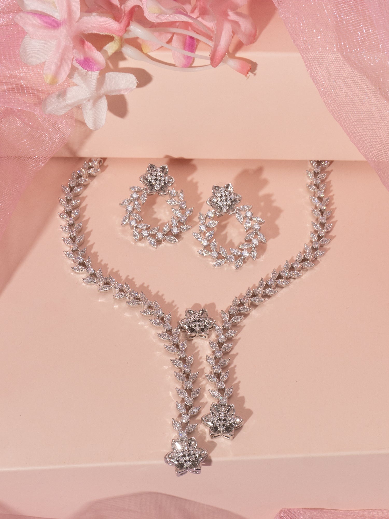 Introducing Niscka's V-Shaped Flower Design Jewelry Set, an exquisite combination of elegance and sparkle. This stunning set features a graceful V shape design, adorned with brilliant American Diamonds and complemented by dazzling zircon and CZ stones.The intricate flower design adds a touch of delicate sophistication, while the rhodium polished finish ensures a sleek, modern shine and long-lasting durability. Each piece in this set is meticulously crafted to enhance the overall brilliance and elevate your style. Ideal for special occasions or adding a touch of luxury to everyday wear, the V-Shaped Flower Design Jewelry Set offers a captivating blend of classic charm and contemporary glamour."