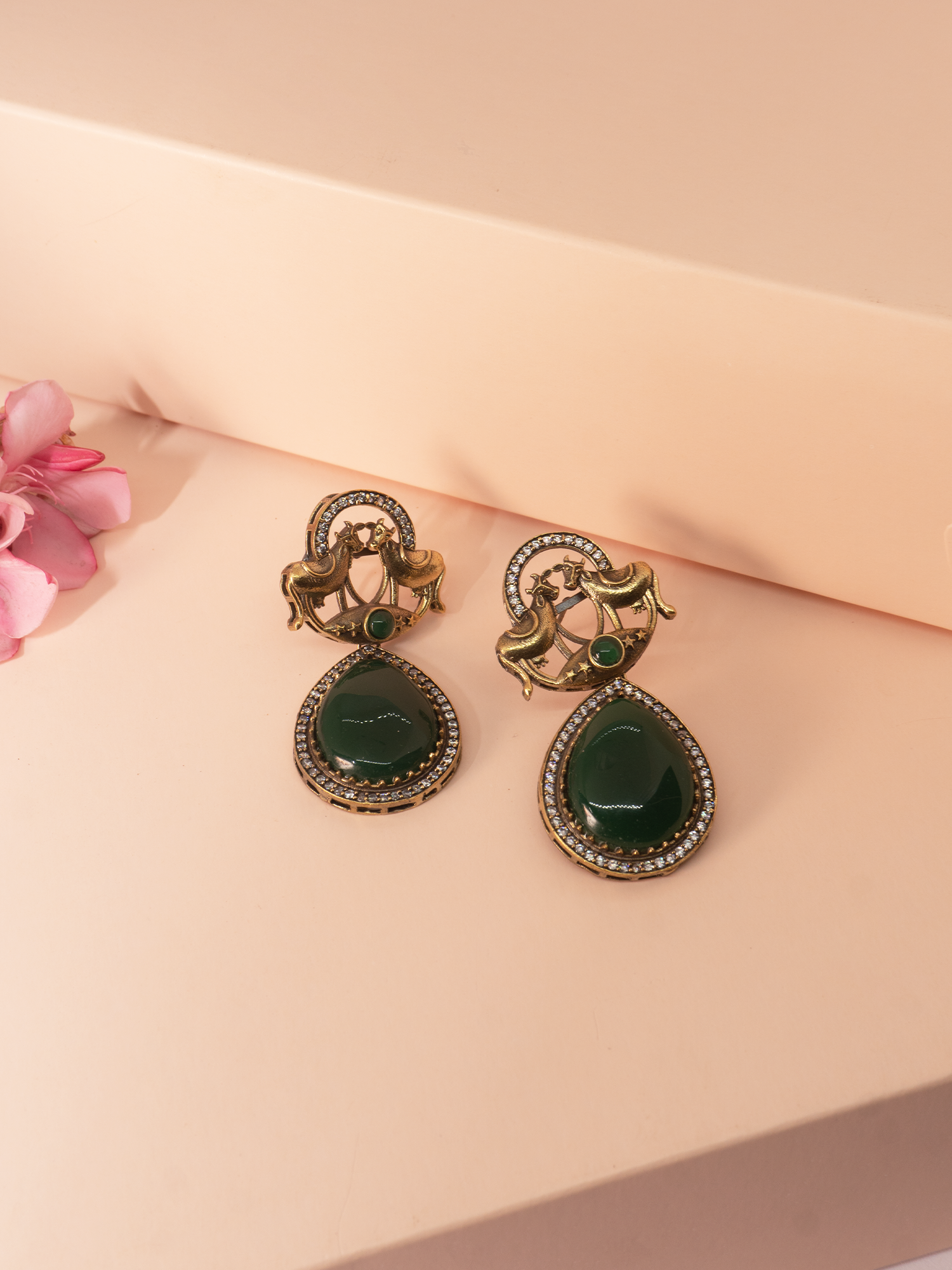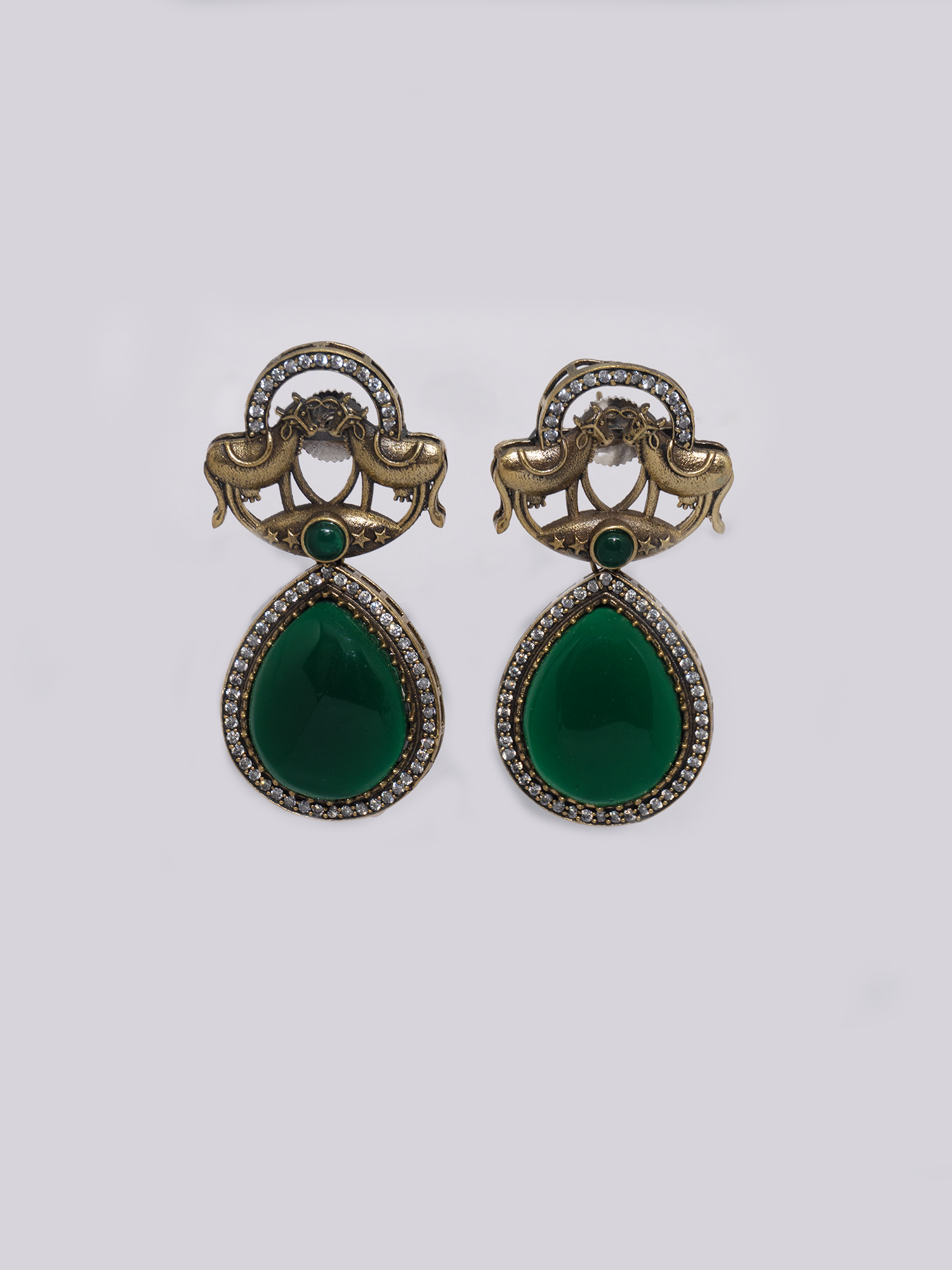 Enhance the elegance of the Green Emerald Kundan Earrings by pairing them with a traditional saree or a chic Anarkali suit in neutral or pastel tones to let the rich green emerald and gold-plated finish stand out. Opt for a sleek bun or soft waves to draw attention to the earrings' intricate design and black polish accents.