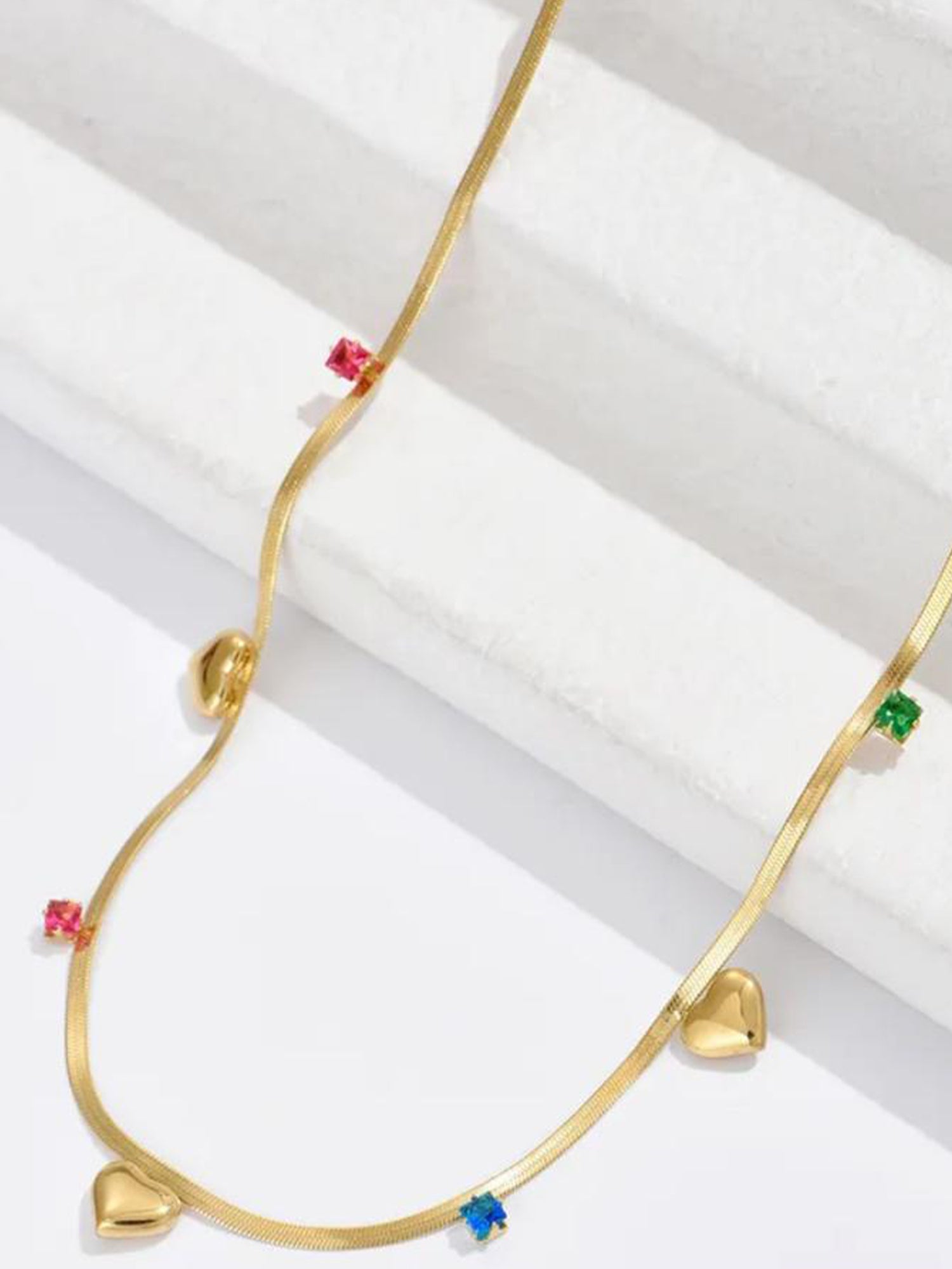 To showcase the multicolor heart design chain, pair it with a simple white or black top to let the vibrant colors pop. For a casual look, layer it over a denim jacket or a flowy sundress. For a more polished appearance, wear it with a fitted blouse and tailored trousers. Consider adding complementary bracelets or rings in gold or rhodium plating to enhance the overall look. Keep your hair in soft waves or a loose updo to highlight the chain.