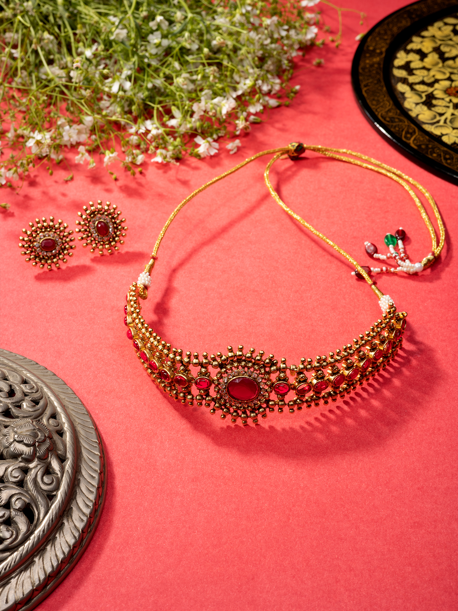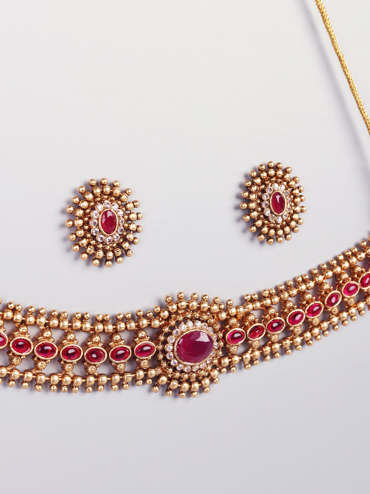 24K Gold-Plated Antique Ruby Necklace Set with Earrings