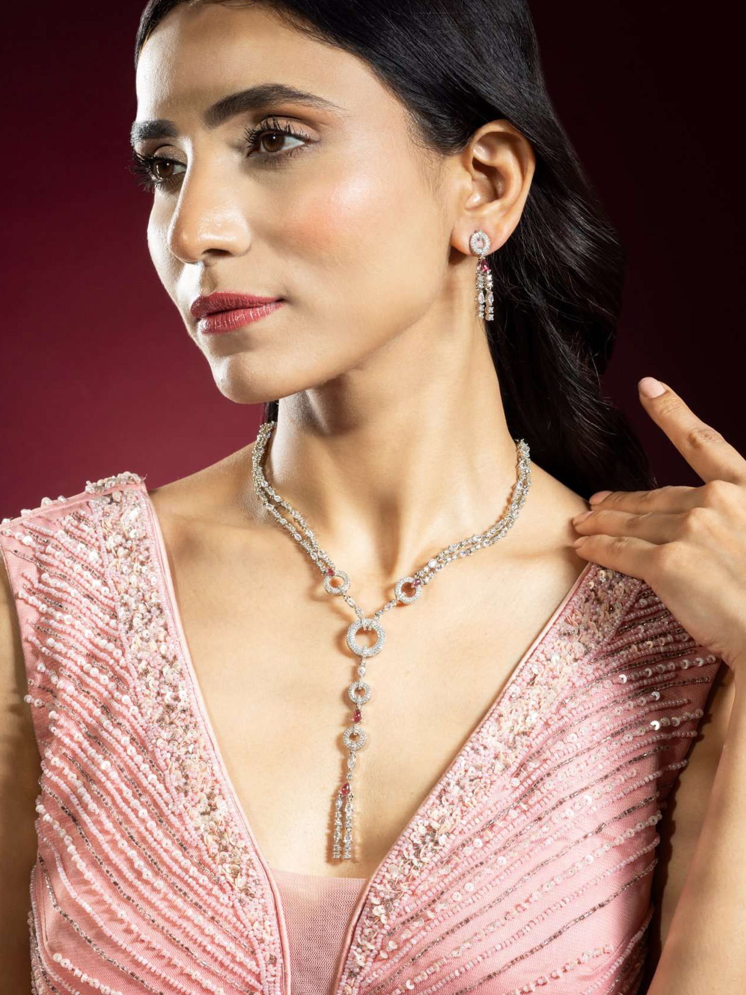 Enhance your style with exquisite American diamond & stone necklace and earring set from Niscka. This piece is crafted with high quality silver brass material The necklace and a pair of earrings offer a stunning combination of beauty and refinement. Perfect for functions and parties, elevate your ensemble with this timeless masterpiece.