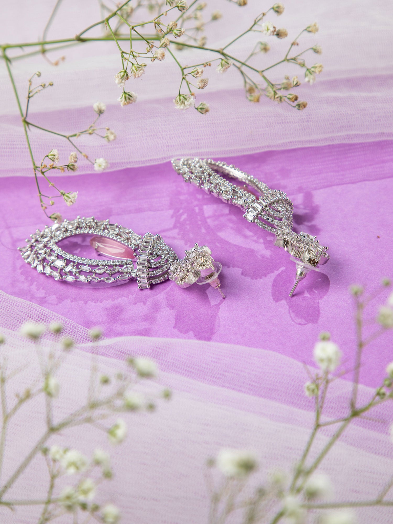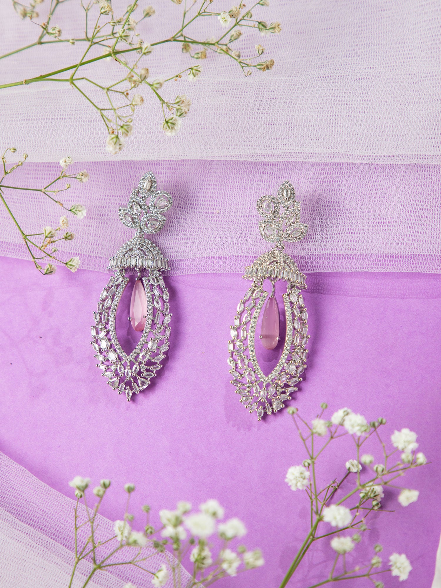 Mesmerizing rhodium-plated American diamond earrings featuring white AD and CZ stones, with a beautiful translucent pink stone dangling. Handcrafted by local artisans, this modern floral design is perfect for parties, festivals, or functions—adding a stunning touch to any occasion.
