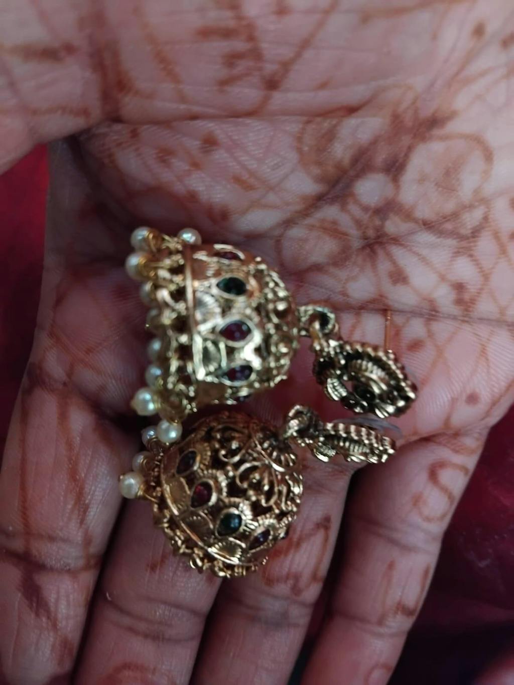 Elegant Gold Plated Jhumki Earrings with Red and Green Stones