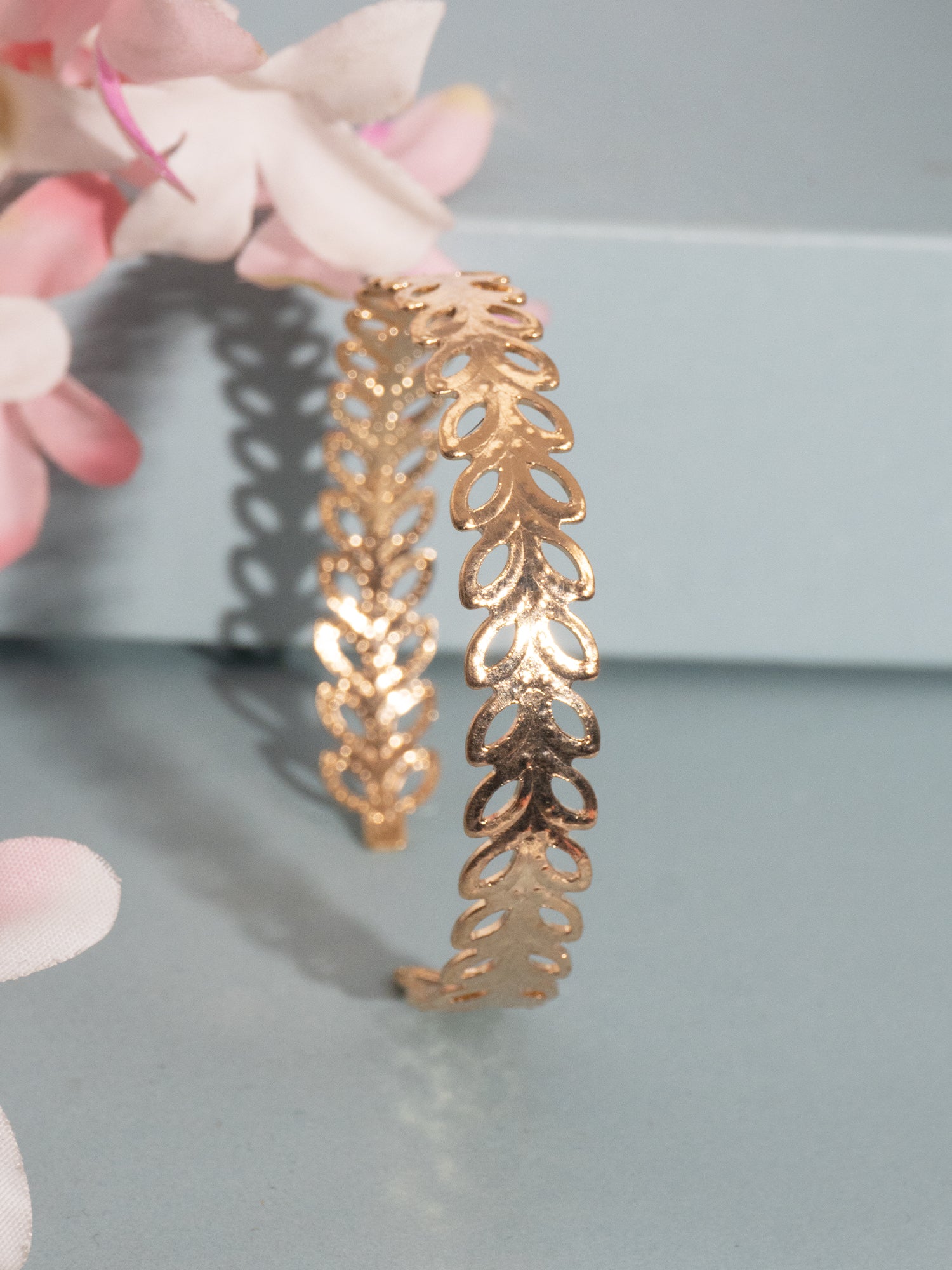 Pair the elegant gold-plated leaf design bracelet with a flowy saree or a traditional kurta for a graceful, ethnic look. For a more contemporary outfit, wear it with a chic midi dress or a crisp blouse and trousers. The nature-inspired design complements soft, natural tones like beige, pastels, or earthy hues. Style your hair in loose waves or a sleek bun to draw attention to the bracelet, and consider layering it with other delicate gold pieces for a more intricate and fashionable look.