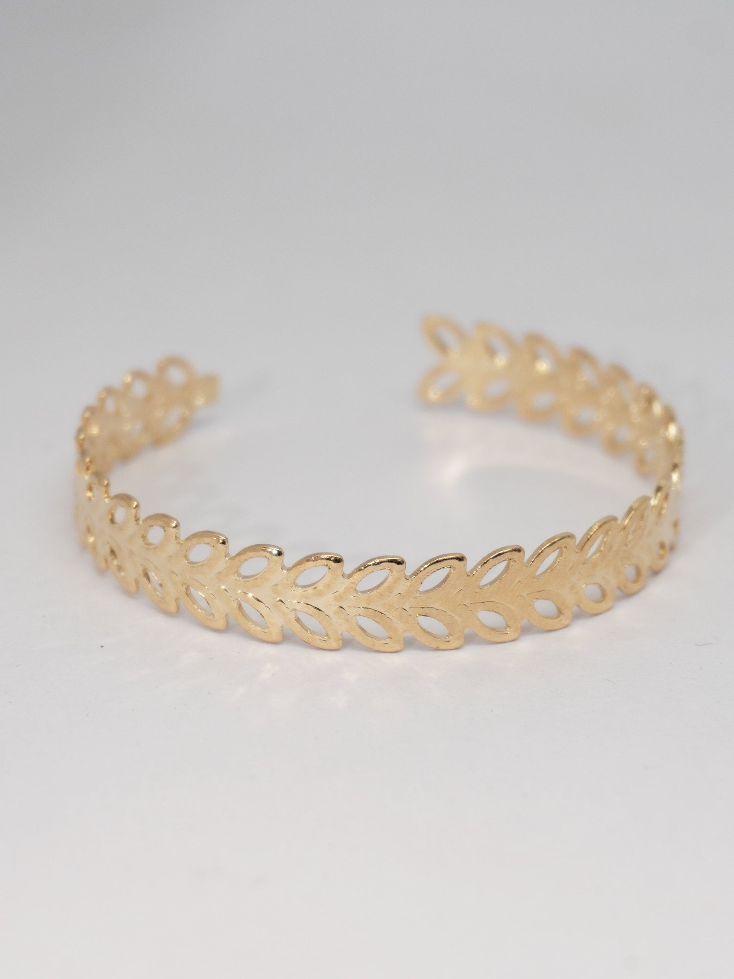 Add a touch of nature-inspired elegance to your collection with Niscka's gold-plated leaf design bracelet. Delicately crafted to mimic the beauty of leaves, this bracelet exudes grace and sophistication. The luxurious gold plating enhances its radiant shine, making it a perfect accessory for both everyday wear and special occasions. Whether worn alone or stacked with other bracelets, the intricate leaf design adds a subtle yet stunning statement to any outfit. Elevate your style effortlessly with this timeless piece.